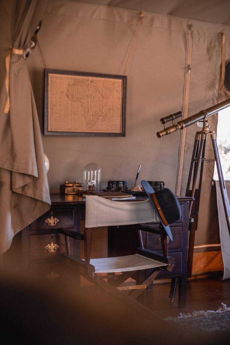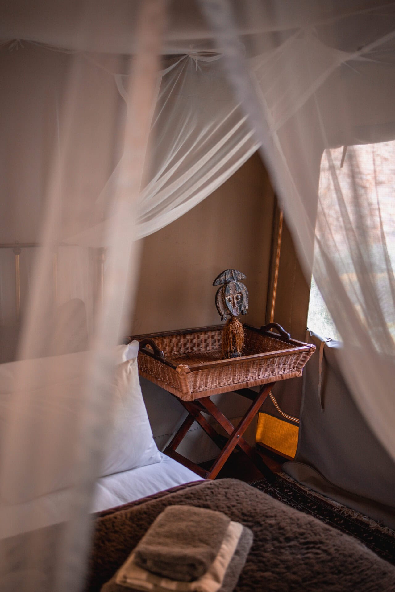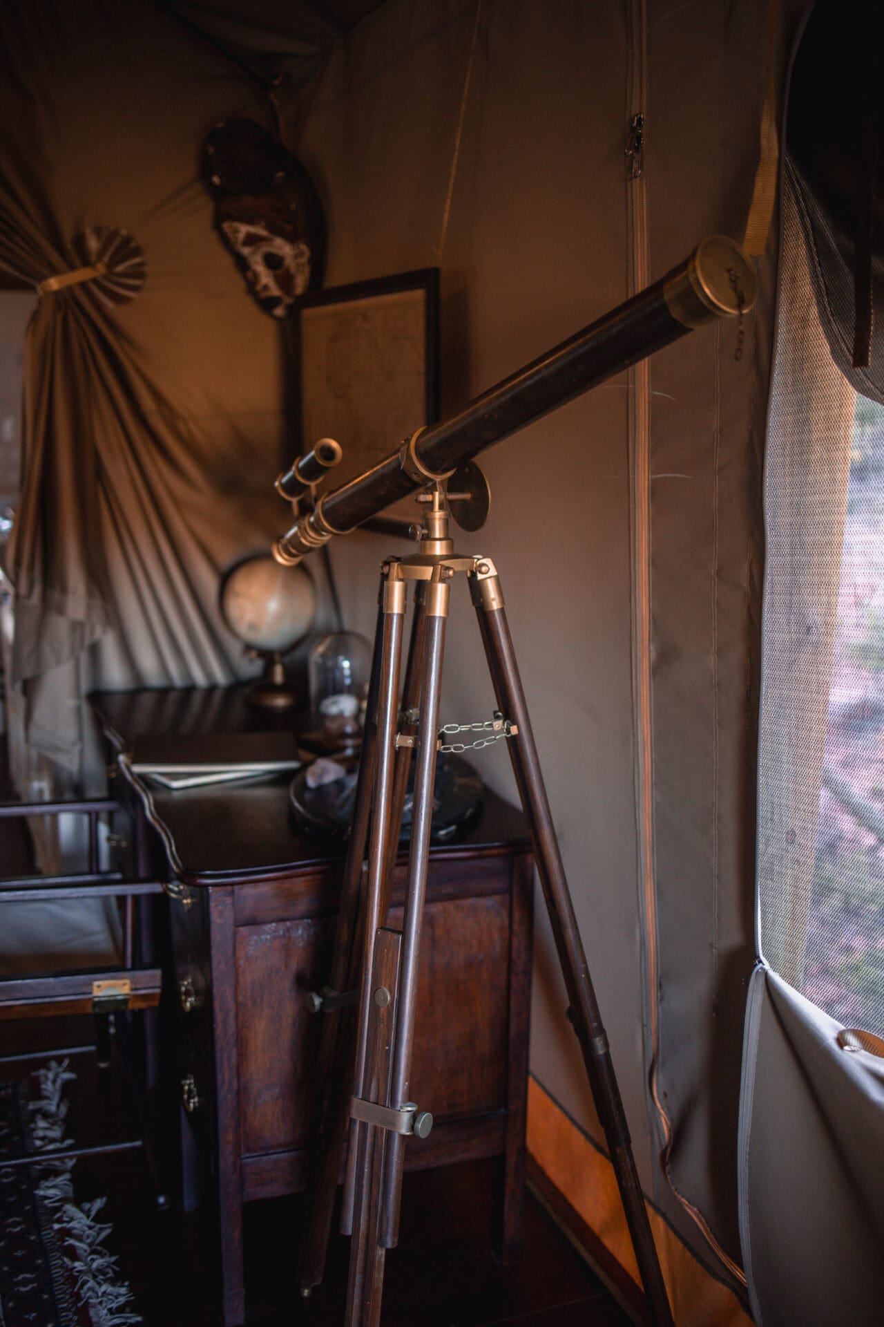 The four-poster, king-size bed comes with luxurious linen and a mosquito net, ensuring a peaceful night’s sleep. There are extra blankets and hot water bottles for winter. Unzip all the “windows” for a true nature experience! There is also a small study area featuring an antique desk and telescope, perfect for writing and quiet reflection.
