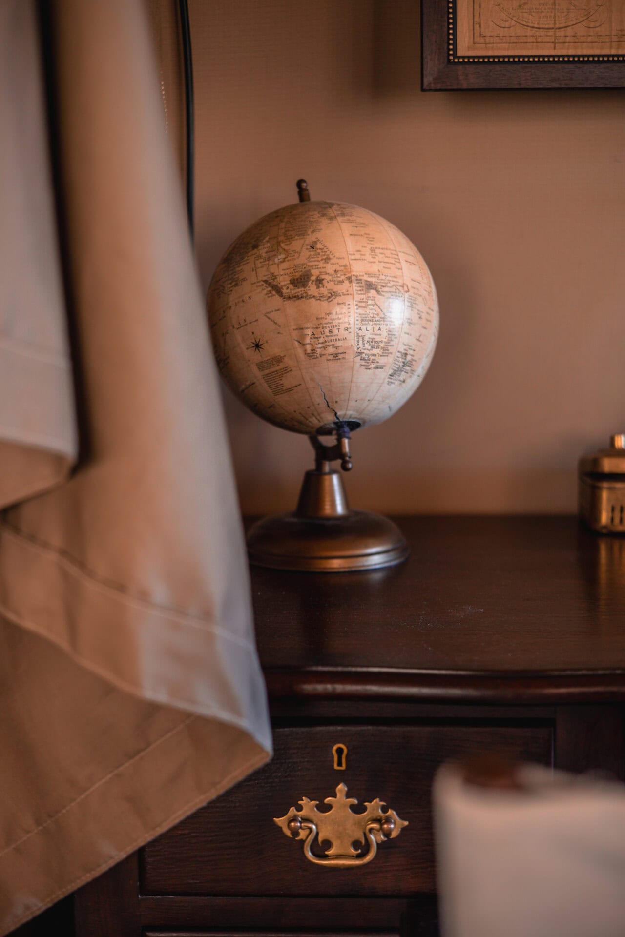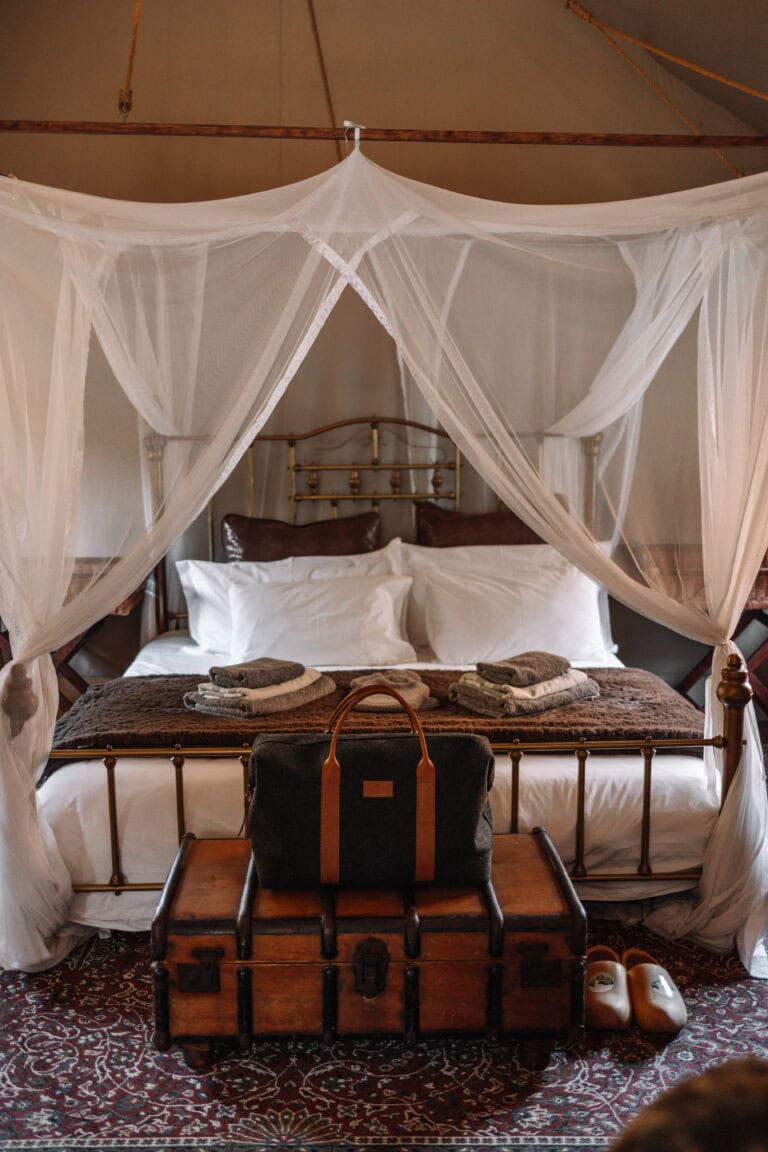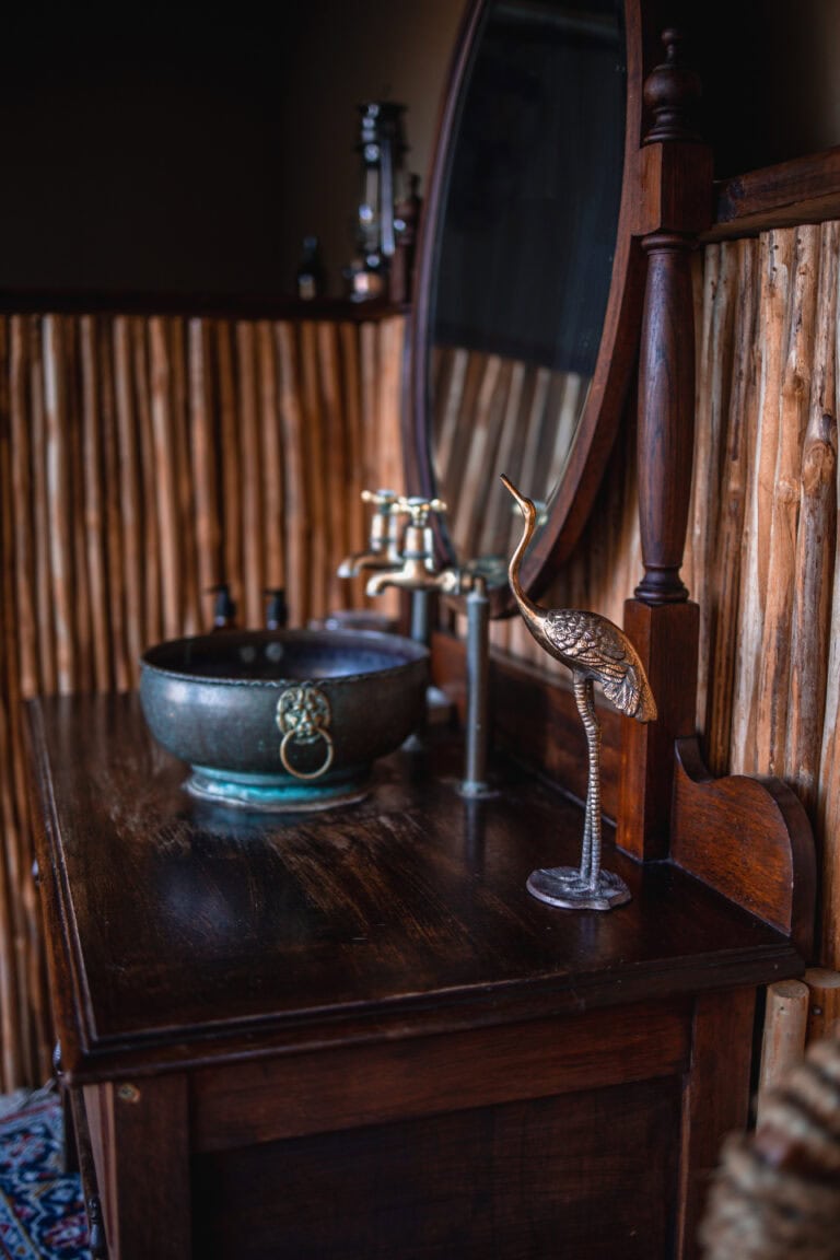 The four-poster, king-size bed comes with luxurious linen and a mosquito net, ensuring a peaceful night’s sleep. There are extra blankets and hot water bottles for winter. Unzip all the “windows” for a true nature experience! There is also a small study area featuring an antique desk and telescope, perfect for writing and quiet reflection.