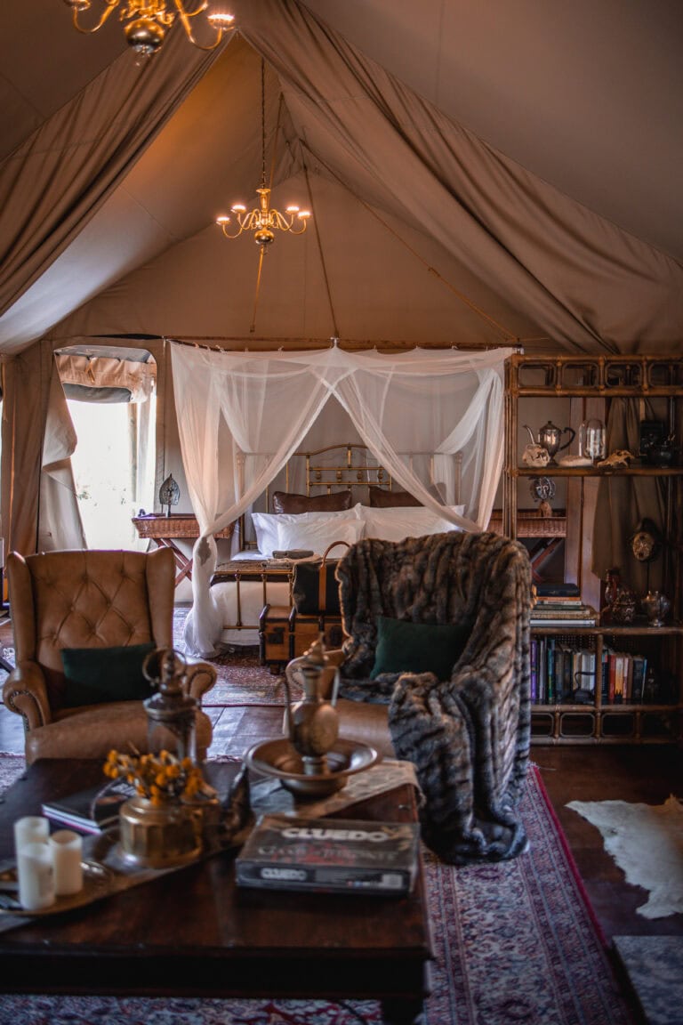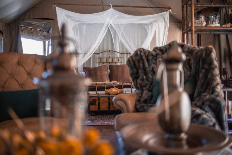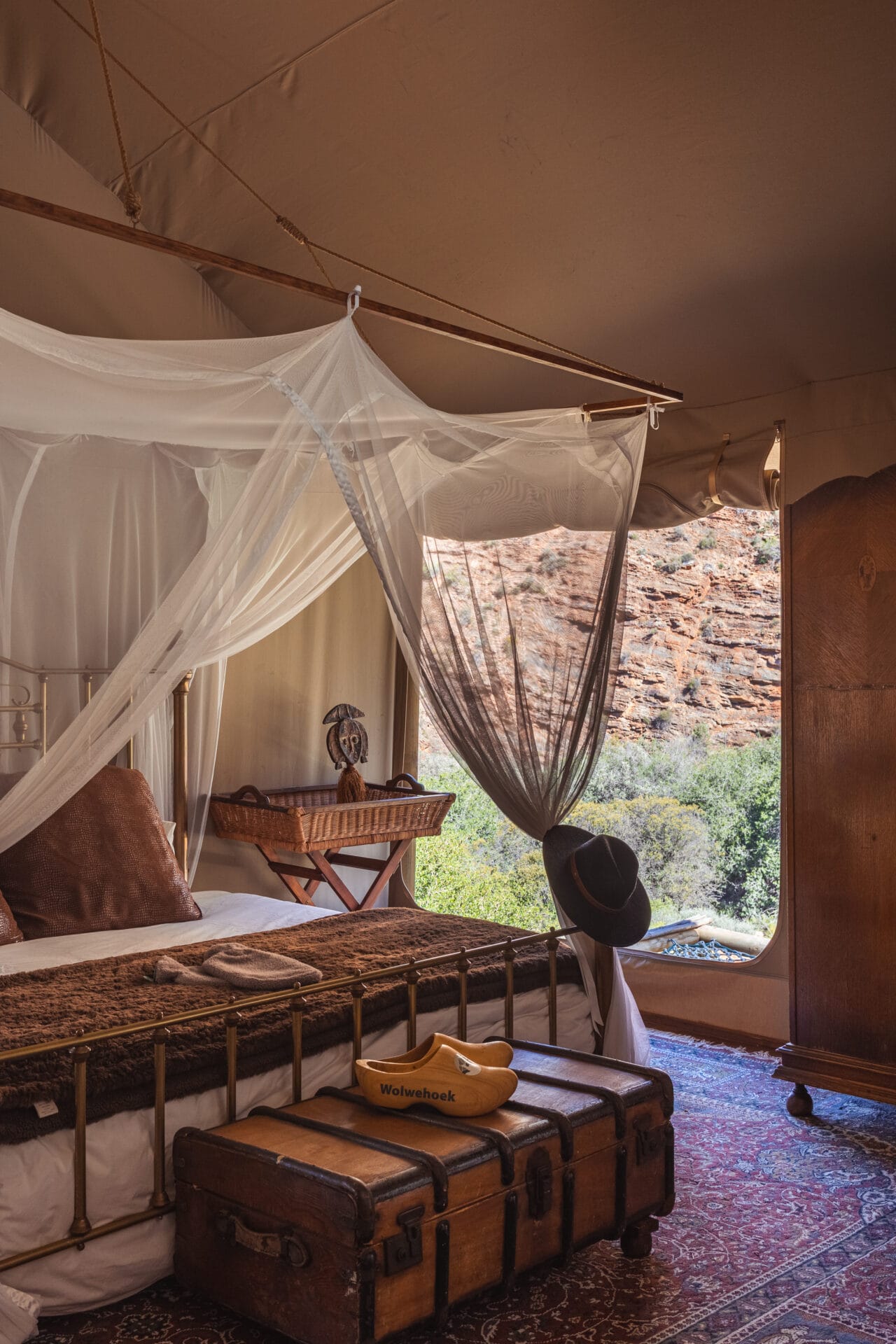This spacious, open-plan tented stay offers the ultimate glamping experience for two. The colonial-inspired decor, complemented by antiques and memorabilia, will transport you back to the era of exploration. Outside, you’ll find all the amenities you could wish for, including a massive cargo net. A walkway leads around to the splash pool, which doubles as a hot tub. Another path takes you to the outdoor lounge and braai area, equipped with a braai and pizza oven. Accessible only by 4×4, this secluded retreat is perfect for those seeking an off-grid adventure away from everything and everyone.