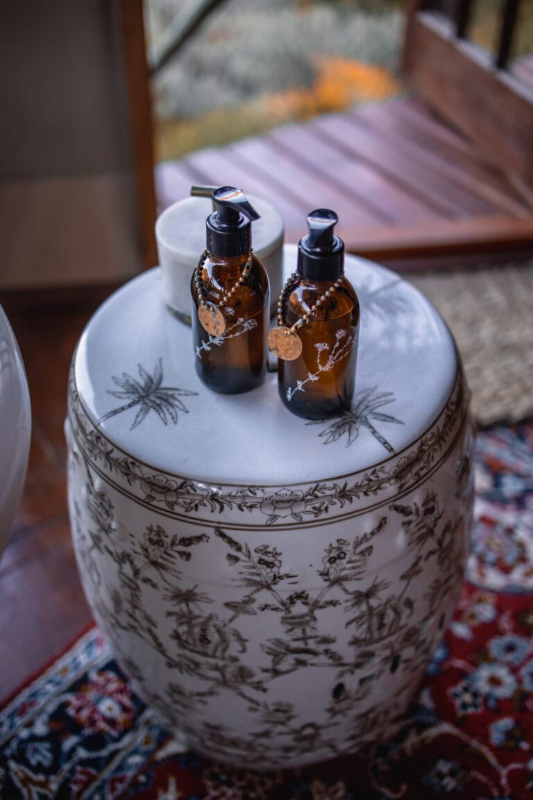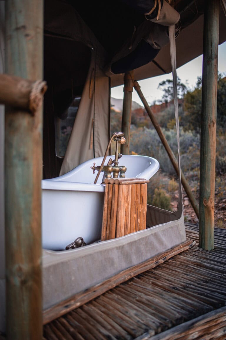 The bedroom is en suite—yes, there’s a toilet and a Victorian bathtub inside the tent! You’ll also find handmade soaps, along with organic shampoo and body wash. Follow the steps down to the outdoor shower, where a showerhead emerges from a tree. With no one around and just breathtaking views of the valley you’ll really feel immersed in nature.