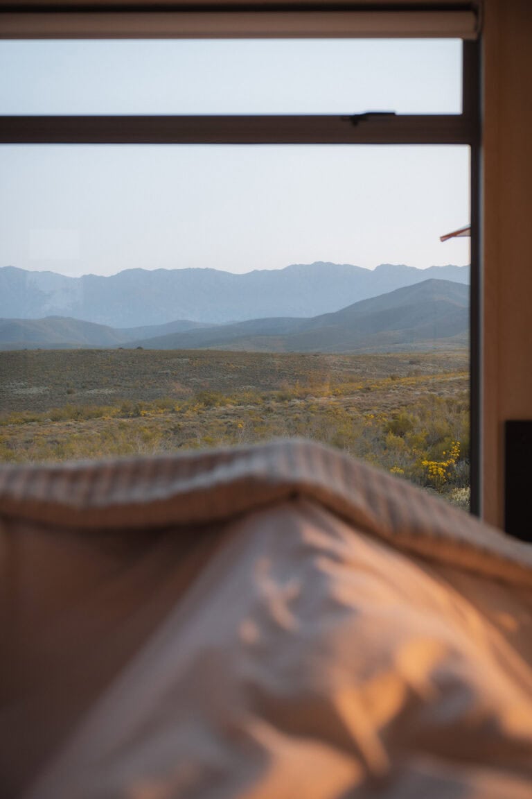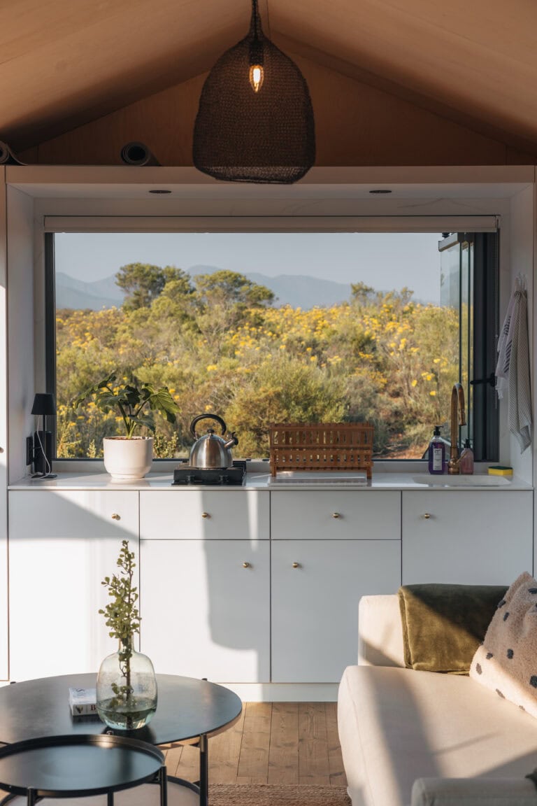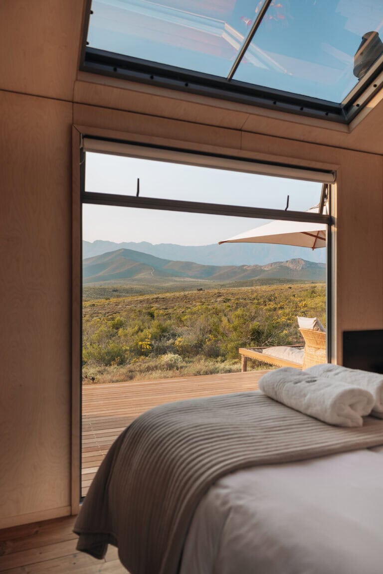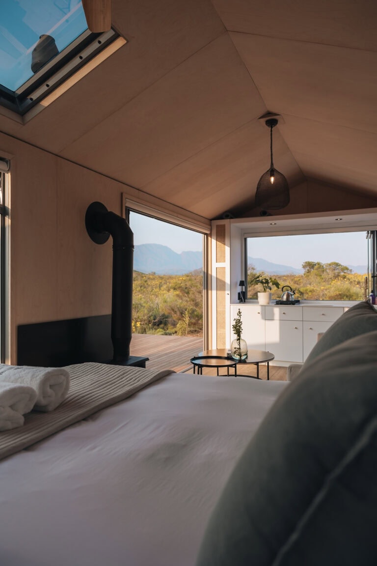The beauty of this cabin – both inside and out! It’s beautifully designed and furnished, with glass stacking doors and large windows that make you feel like you’re fully in nature but with all the modern comforts. The location is breathtaking; there’s no one in sight, and you’re surrounded by rolling mountain ranges, fynbos, and the occasional glimpse of wildlife in the distance.