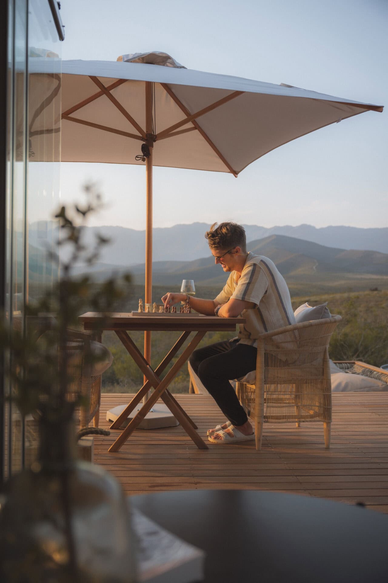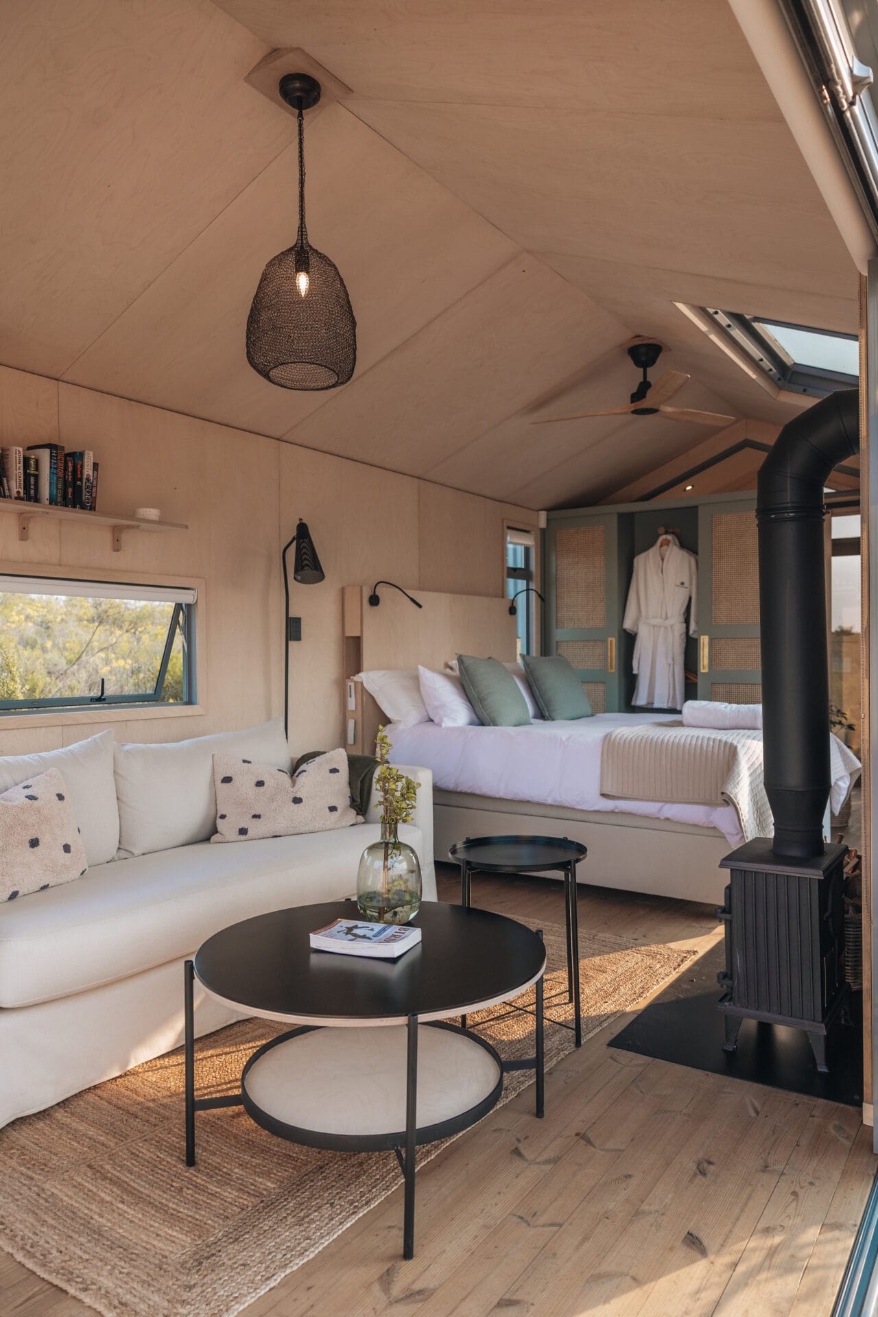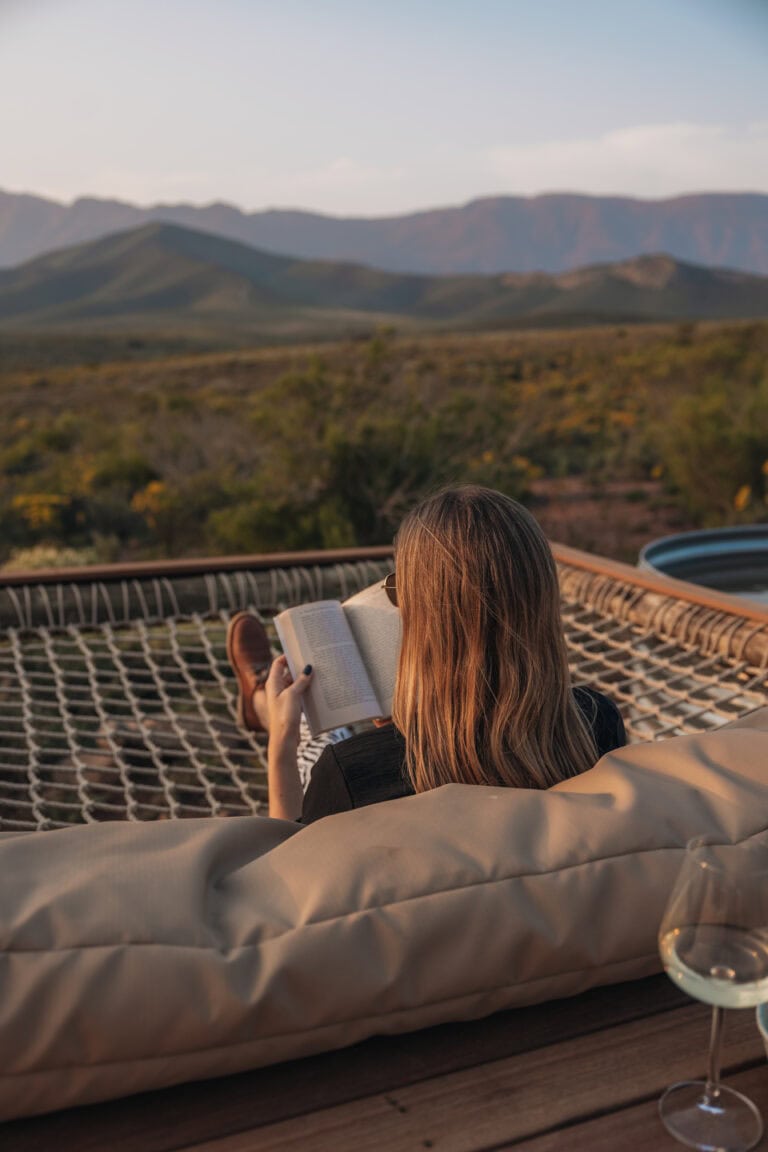 The beauty of this cabin – both inside and out! It’s beautifully designed and furnished, with glass stacking doors and large windows that make you feel like you’re fully in nature but with all the modern comforts. The location is breathtaking; there’s no one in sight, and you’re surrounded by rolling mountain ranges, fynbos, and the occasional glimpse of wildlife in the distance.