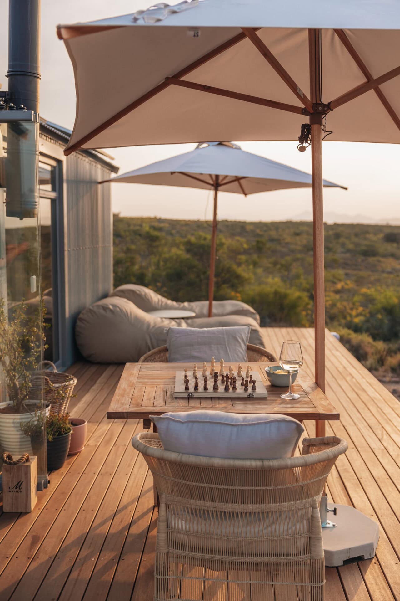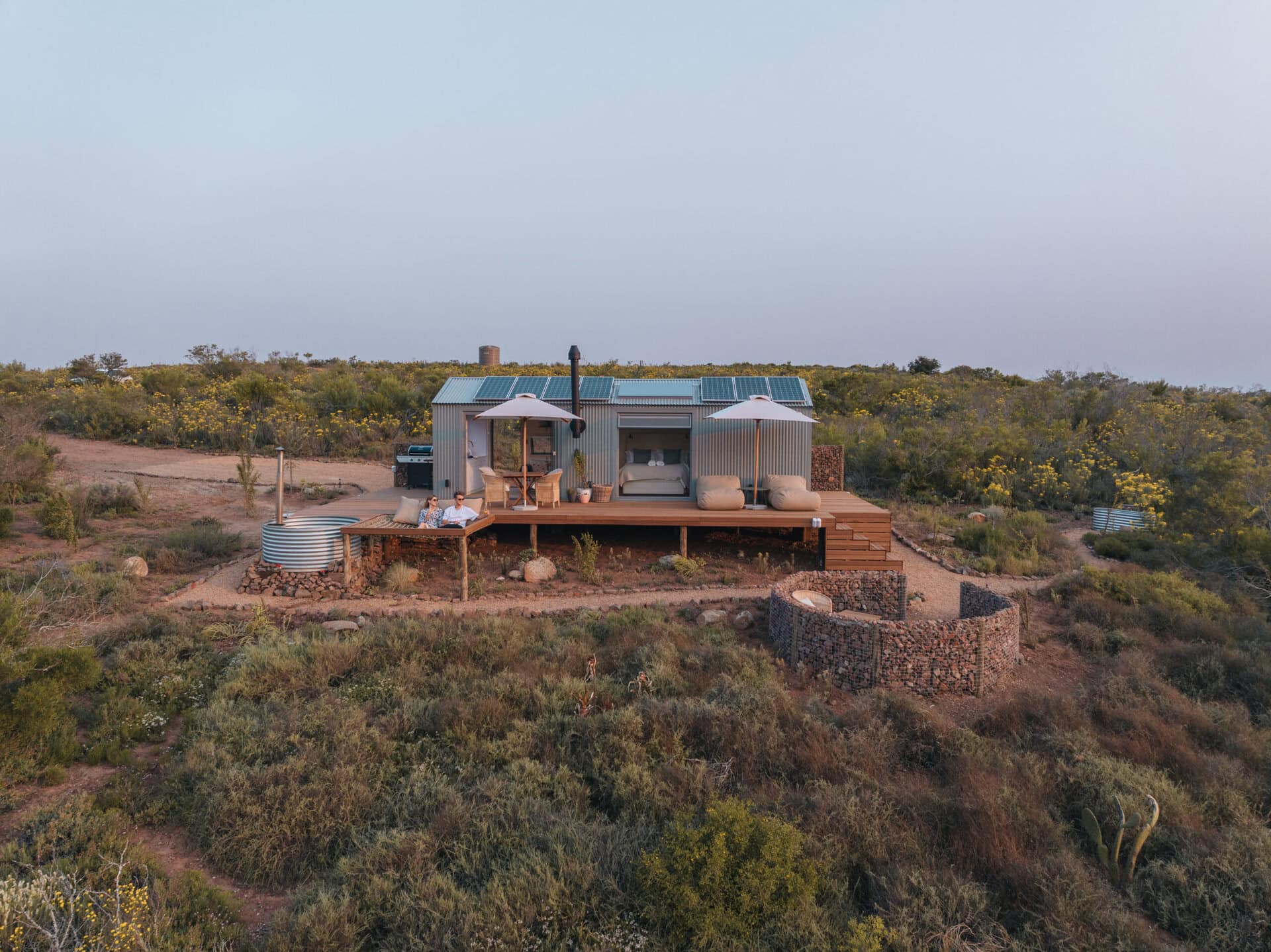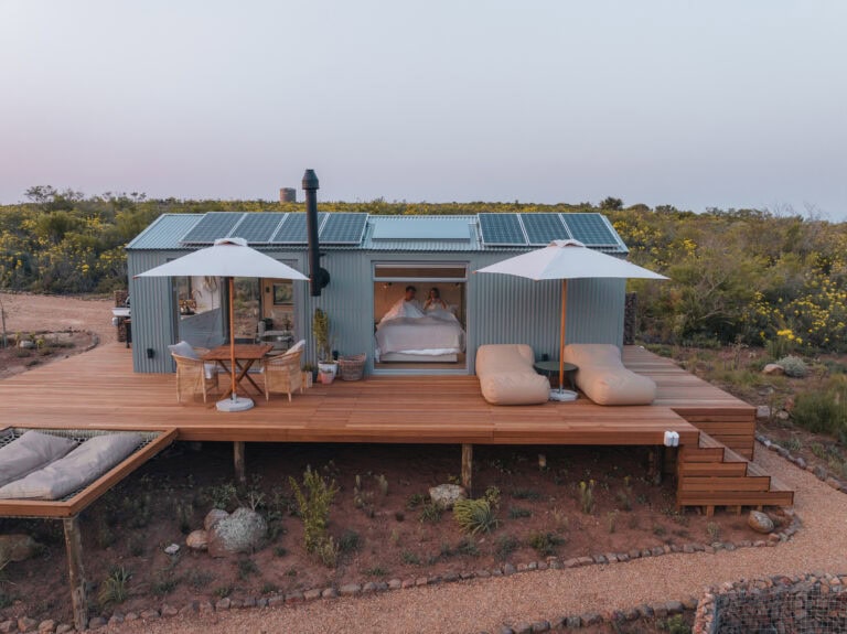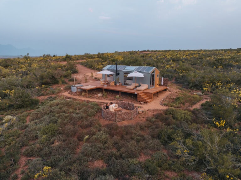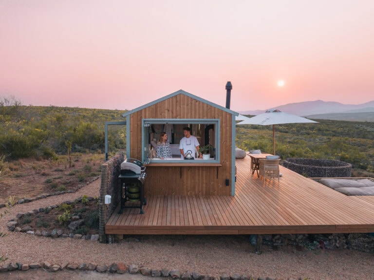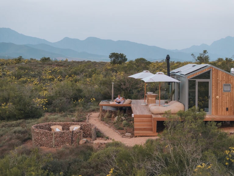 This eco cabin offers uninterrupted views, a wood-fired hot tub, cargo net, outdoor bath, and so much more! Completely private, yet just a 15-minute drive into Robertson and the valley’s world-class wine farms, it’s the perfect place to slow down, breathe deeper, and look up at the moon.