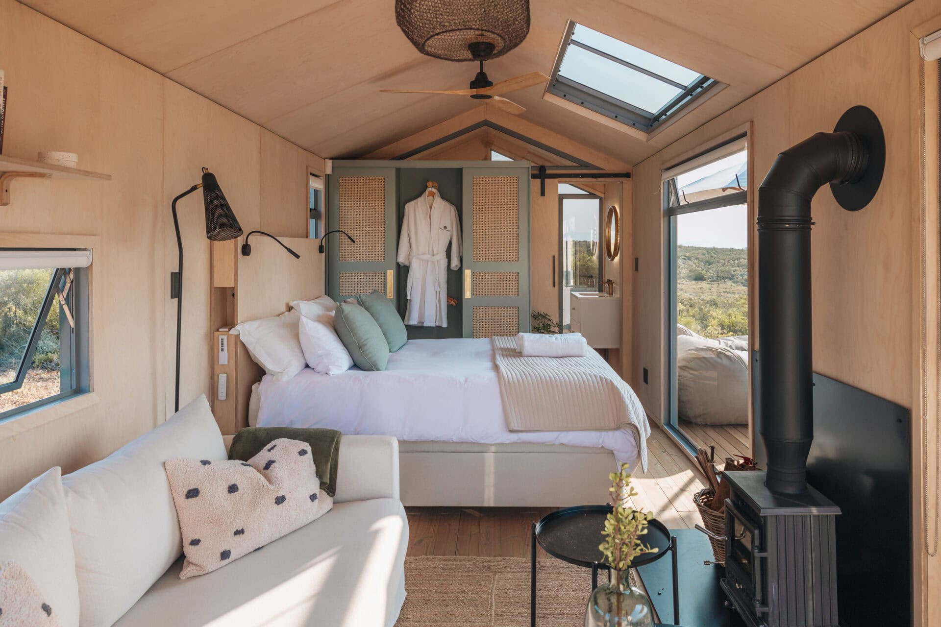 The beauty of this cabin – both inside and out! It’s beautifully designed and furnished, with glass stacking doors and large windows that make you feel like you’re fully in nature but with all the modern comforts. The location is breathtaking; there’s no one in sight, and you’re surrounded by rolling mountain ranges, fynbos, and the occasional glimpse of wildlife in the distance.