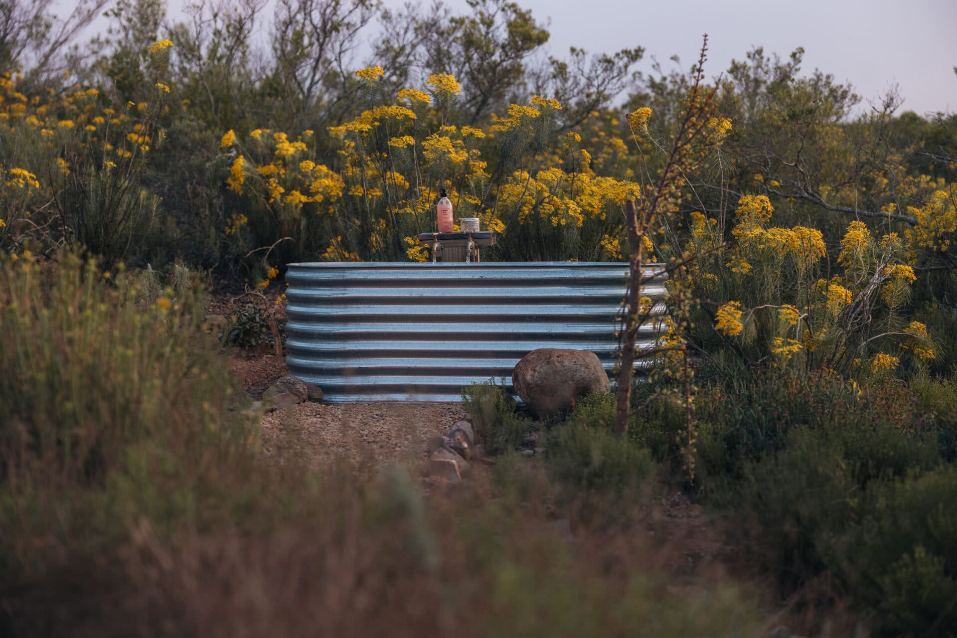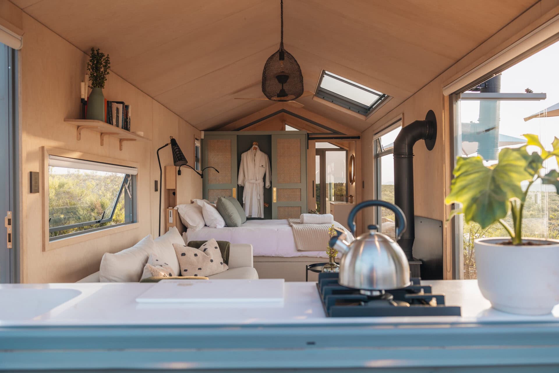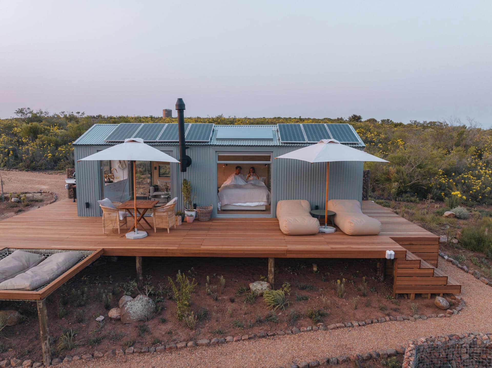This eco cabin offers uninterrupted views, a wood-fired hot tub, cargo net, outdoor bath, and so much more! Completely private, yet just a 15-minute drive into Robertson and the valley’s world-class wine farms, it’s the perfect place to slow down, breathe deeper, and look up at the moon.