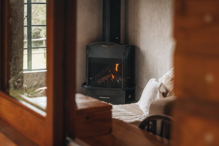 The small living area features a super comfy couch next to a cozy fireplace. You’ll find books, games, puzzles, and even an Instax camera to capture moments and memories throughout your stay.