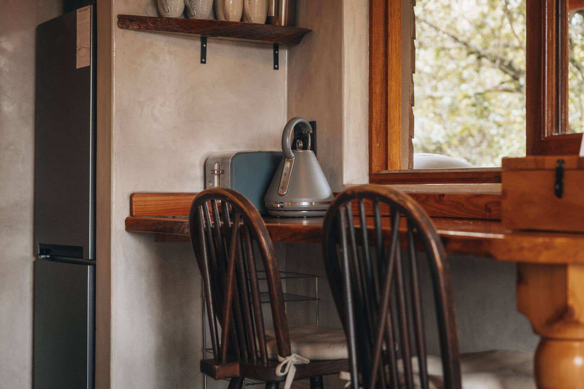 There is a fully equipped kitchenette which comes with a fridge/freezer, gas hob, microwave, small oven, kettle and toaster. It’s fully self catering so you’ll need to pack coffee, tea, salt & pepper, oil etc. The small countertop dining area offers lovely views, and the windows open wide to let in the fresh air.