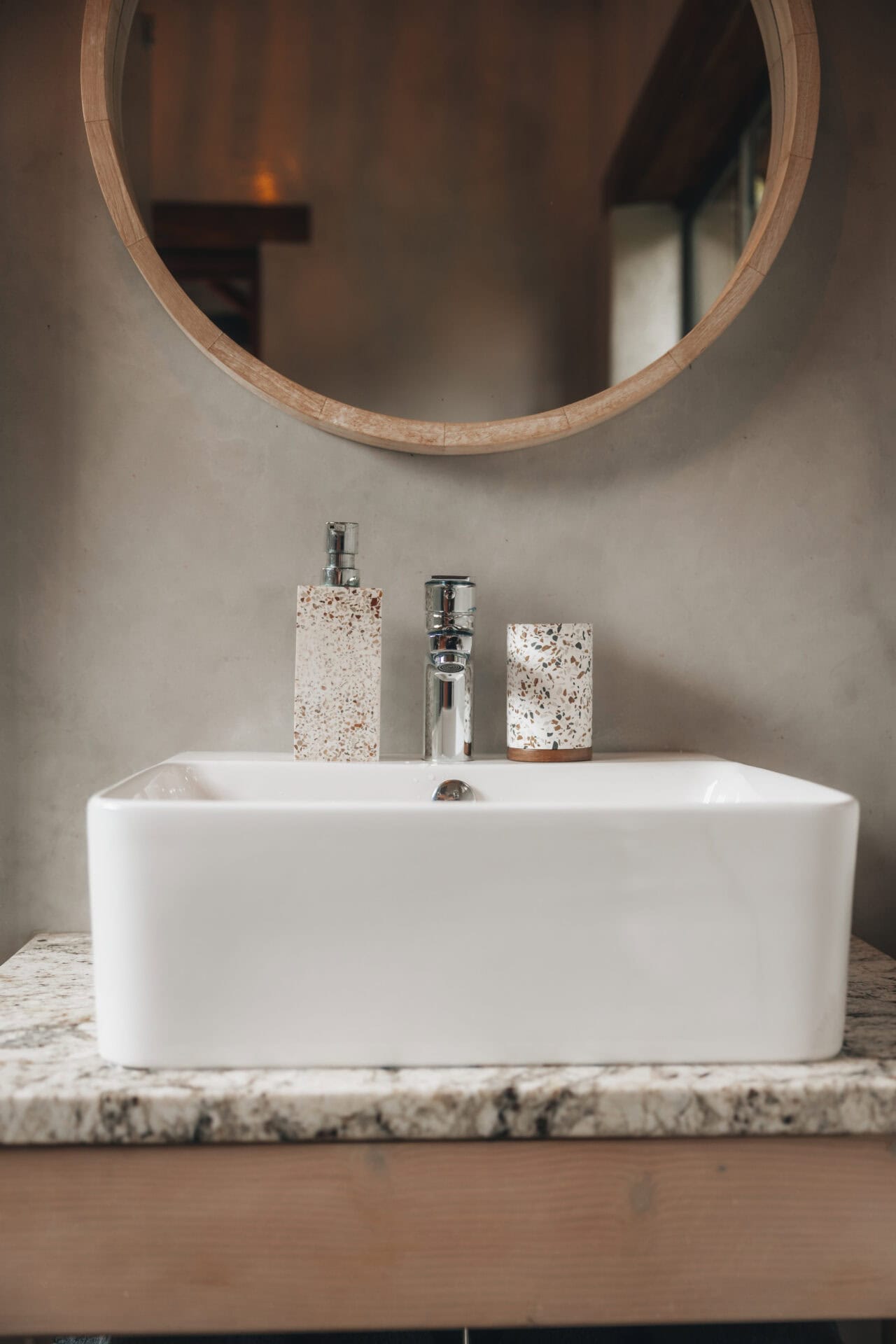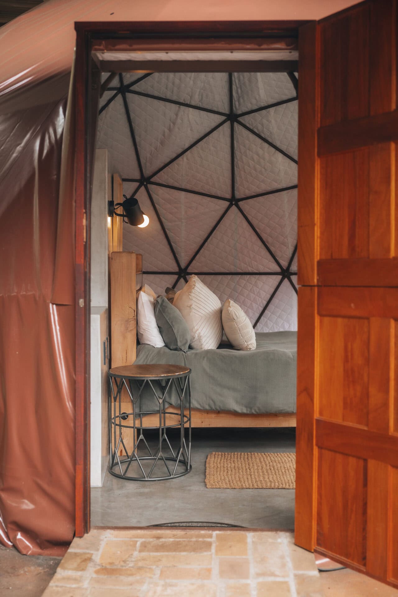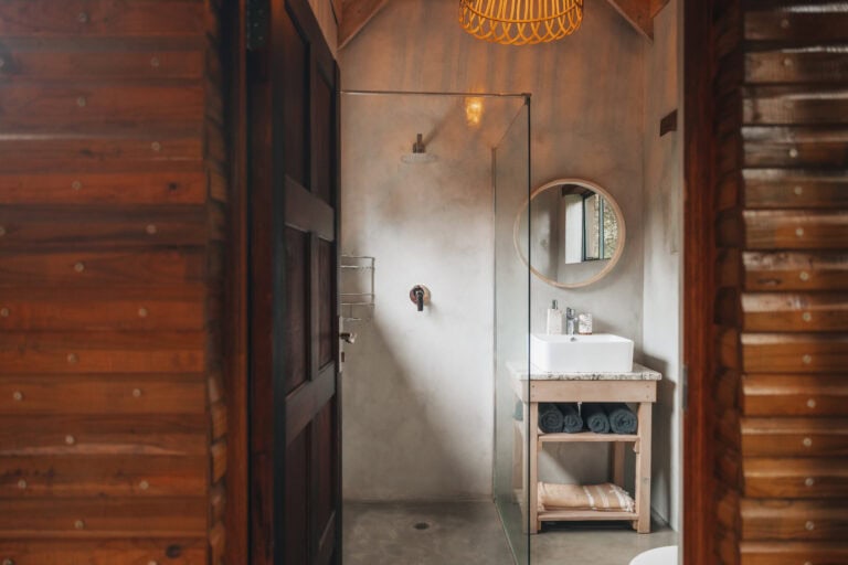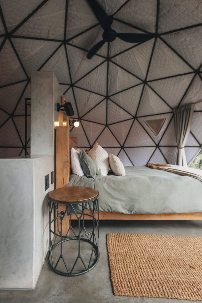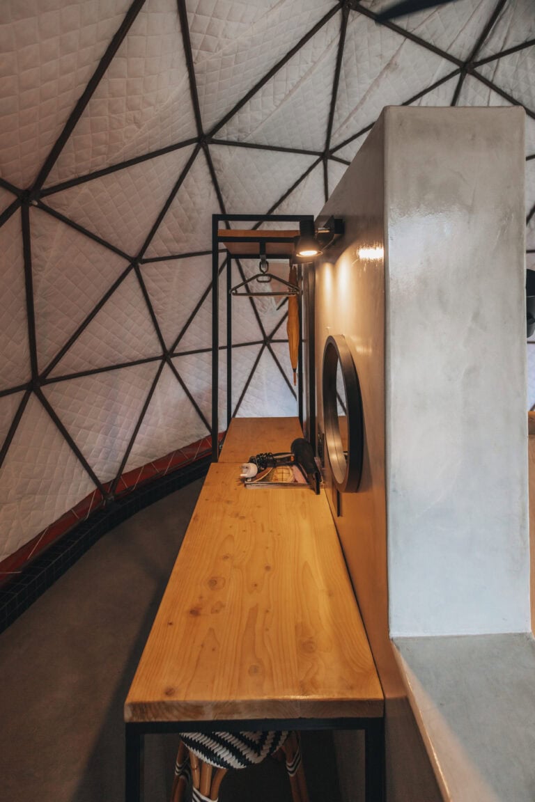 The modern, light and bright, Bali-inspired bathroom is located just outside the dome and comes with a large shower.