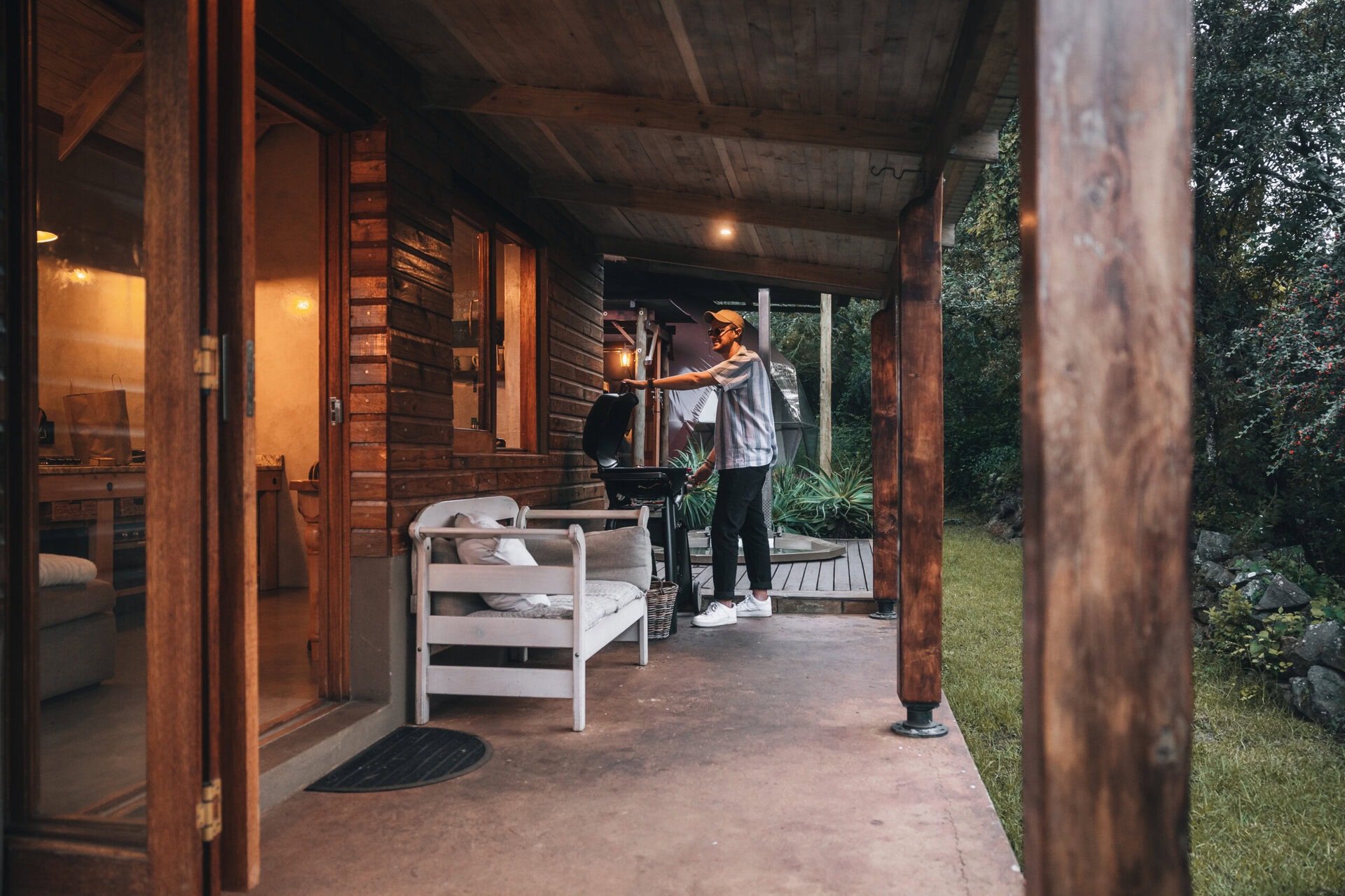 The outdoor deck comes with two sun loungers and a KolKol wood fired hot tub – perfect for stargazing or cooling off on warm days. There’s also a covered section of deck just outside the kitchen with a gas braai and a bench seat overlooking the garden and views.