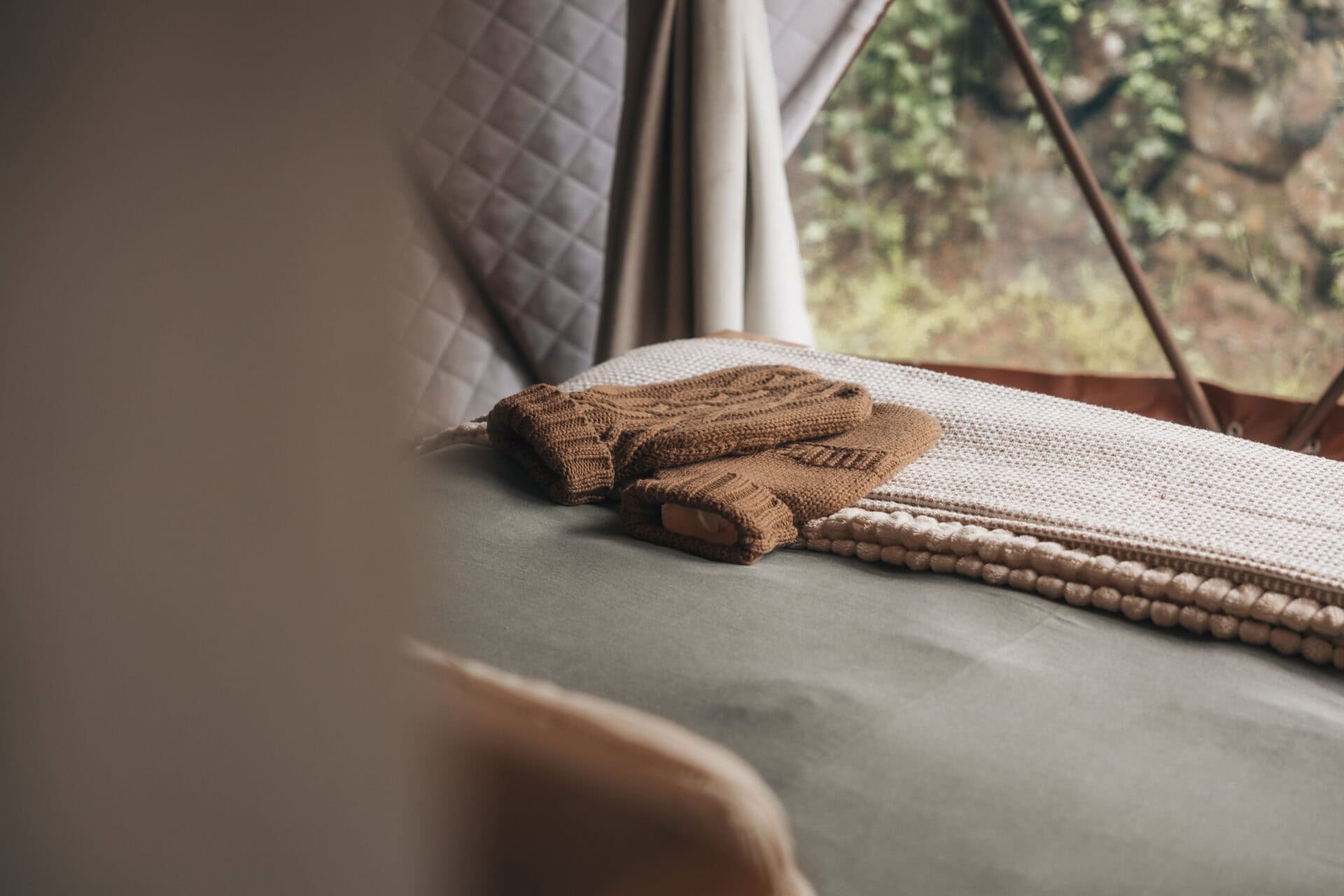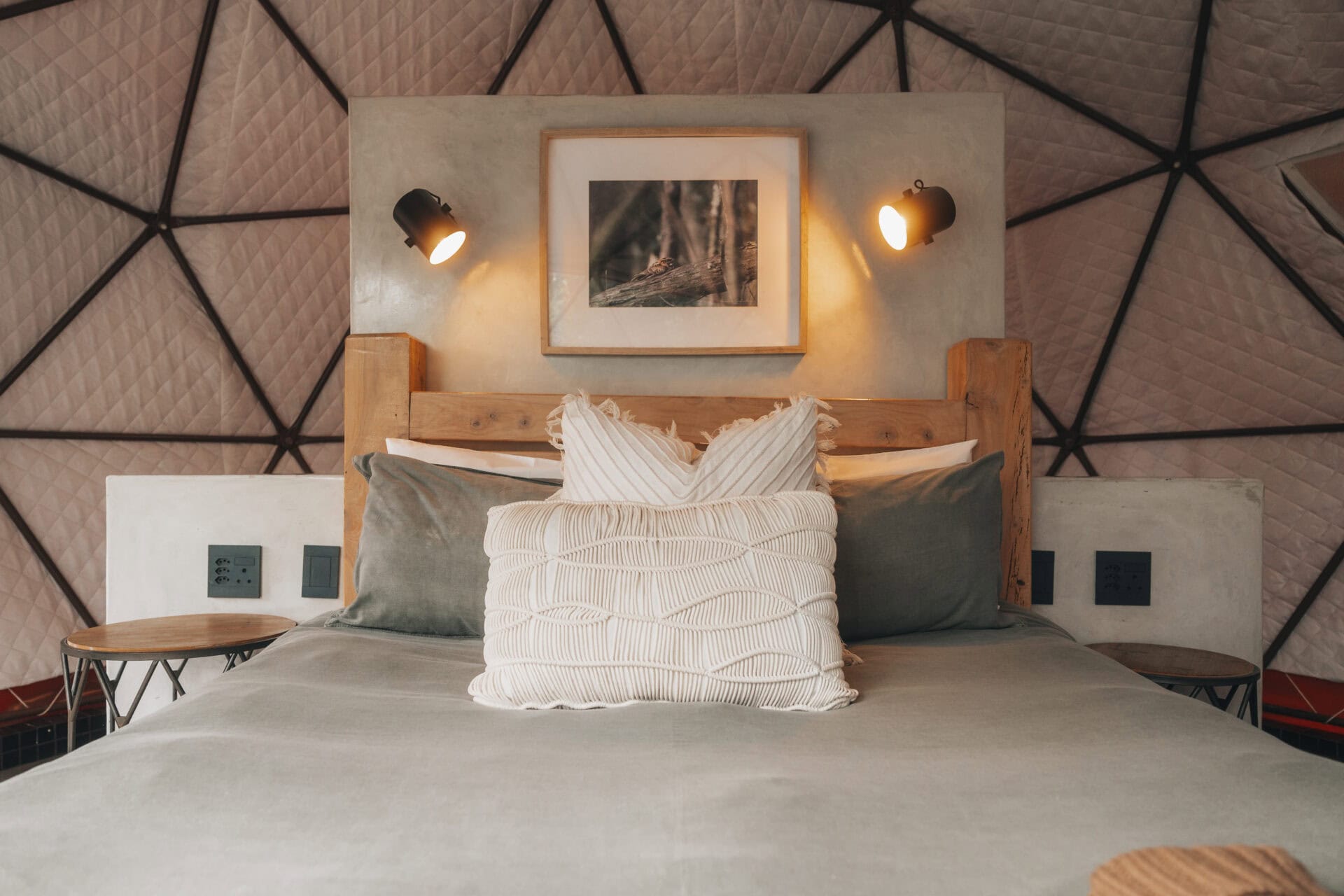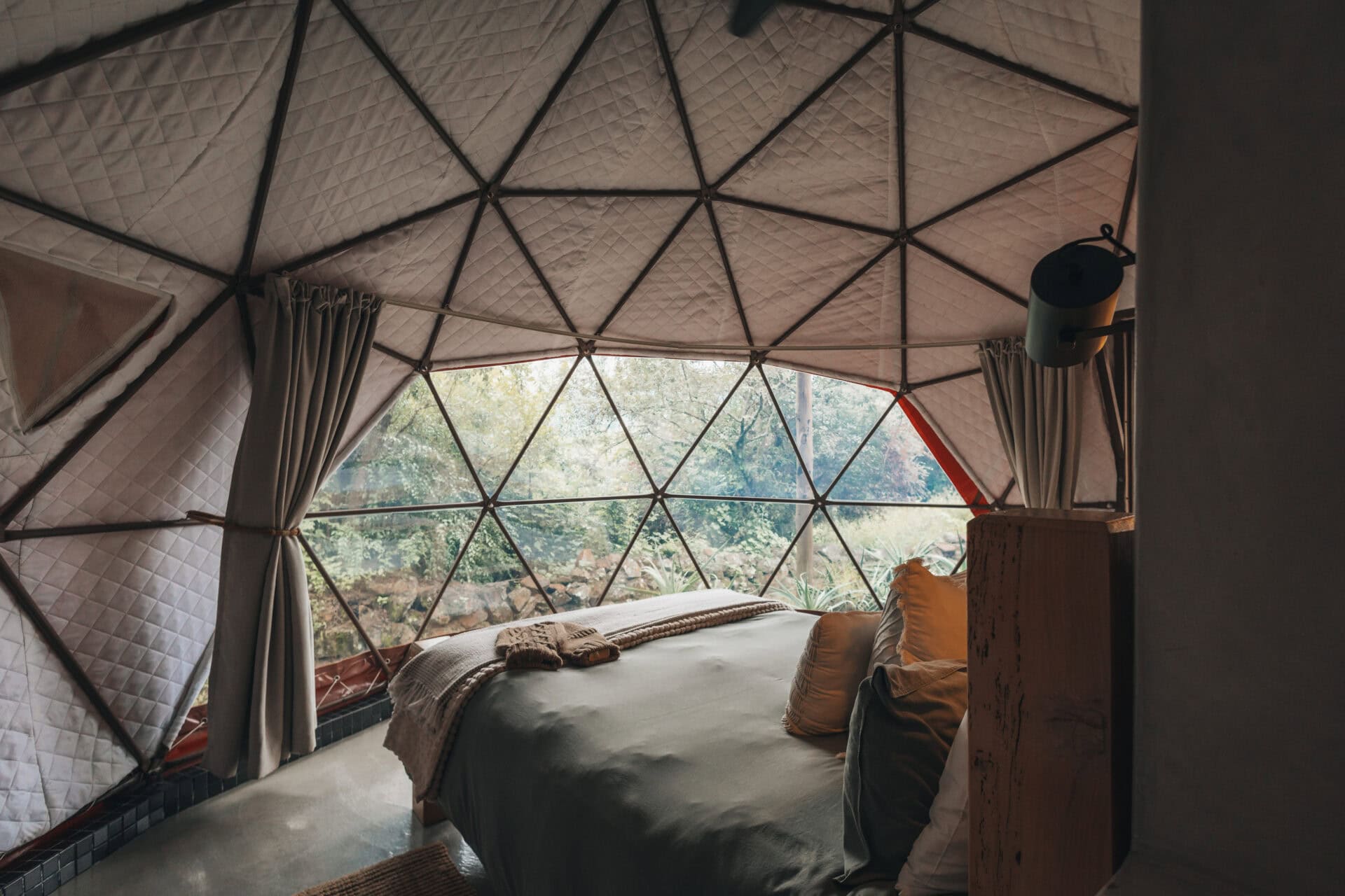 The geodome features a queen size bed, with a dressing area and storage space behind. There is also a ceiling fan, hot water bottle and electric blankets for winter.