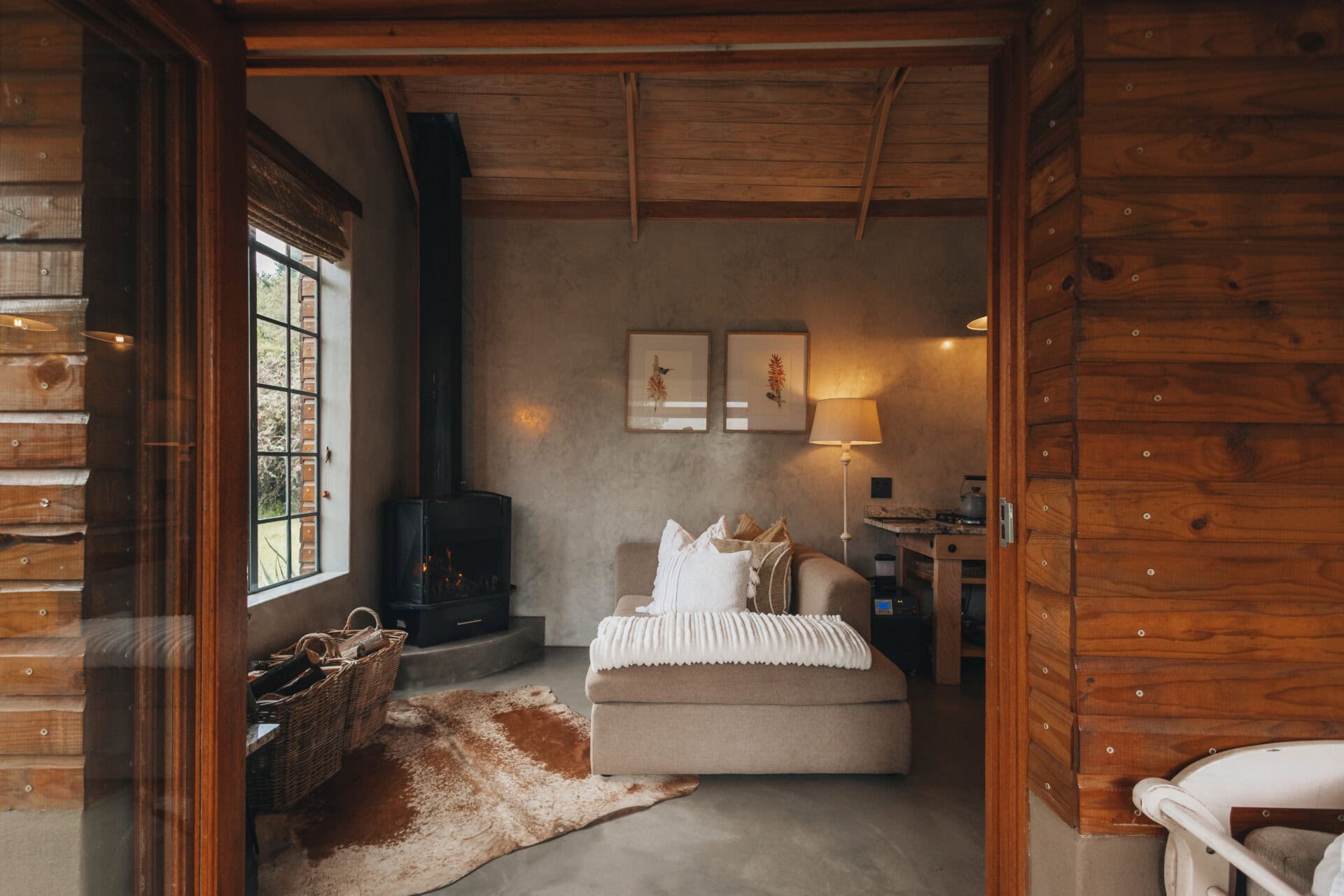 The small living area features a super comfy couch next to a cozy fireplace. You’ll find books, games, puzzles, and even an Instax camera to capture moments and memories throughout your stay.