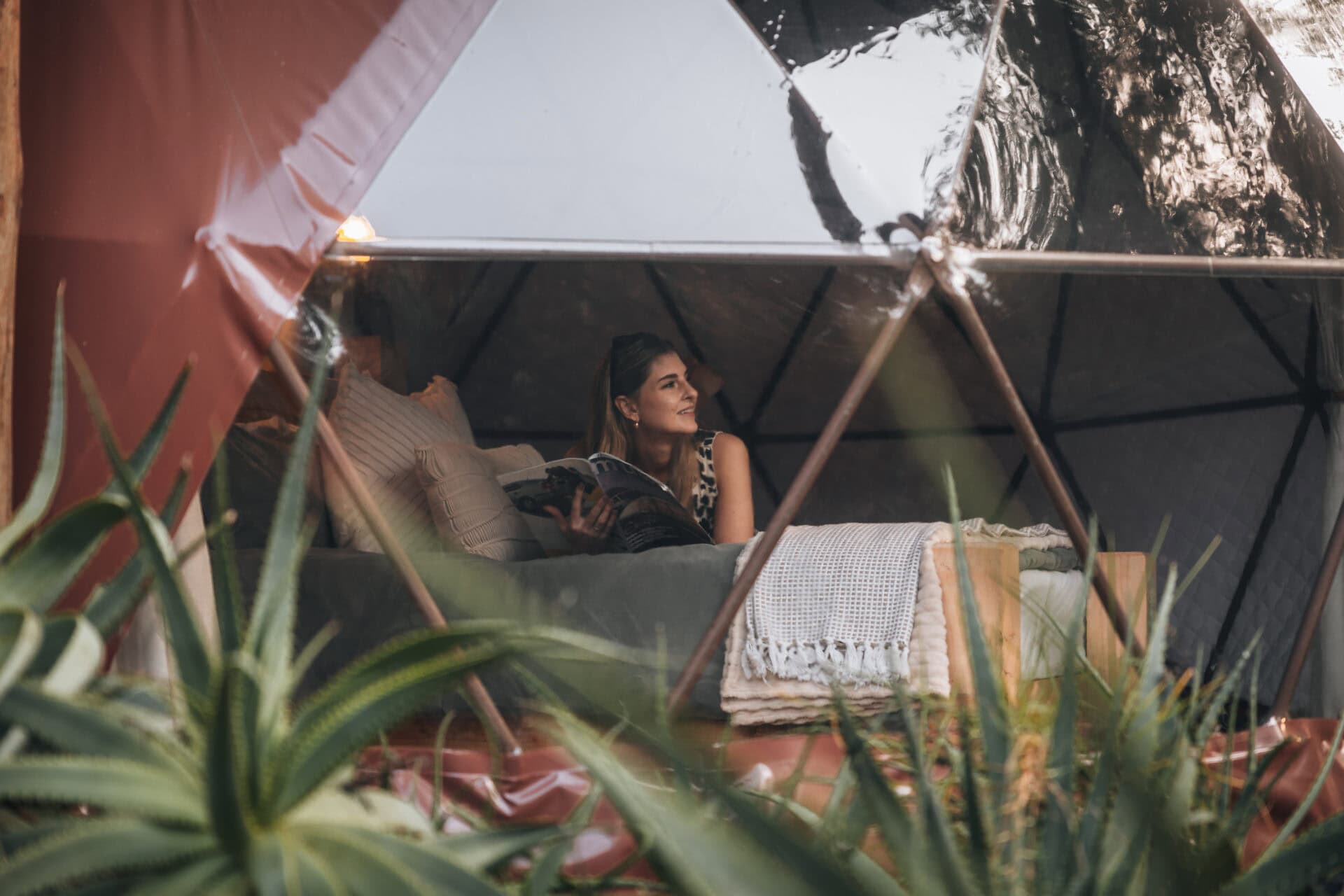 The modern, light and bright, Bali-inspired bathroom is located just outside the dome and comes with a large shower.