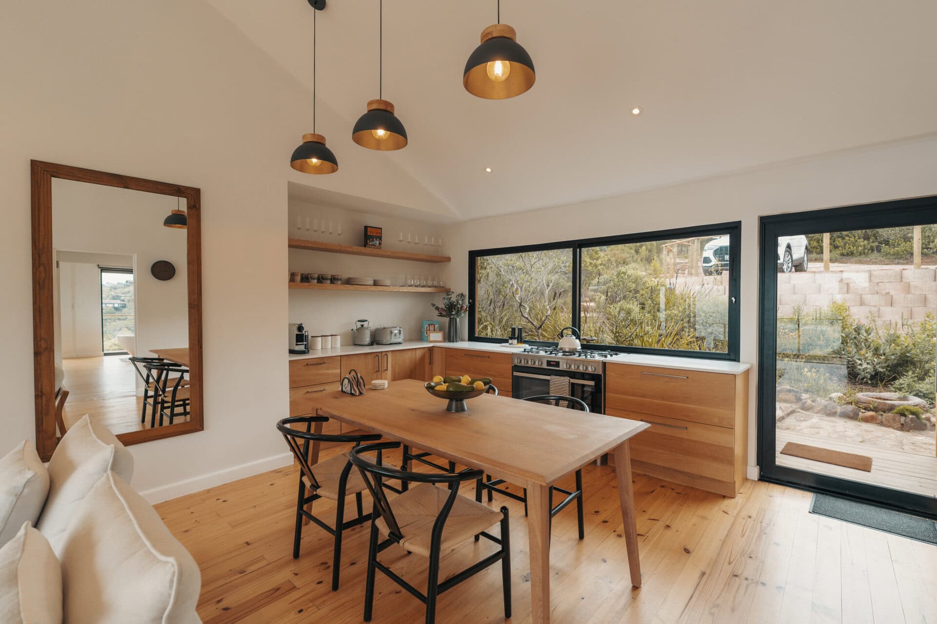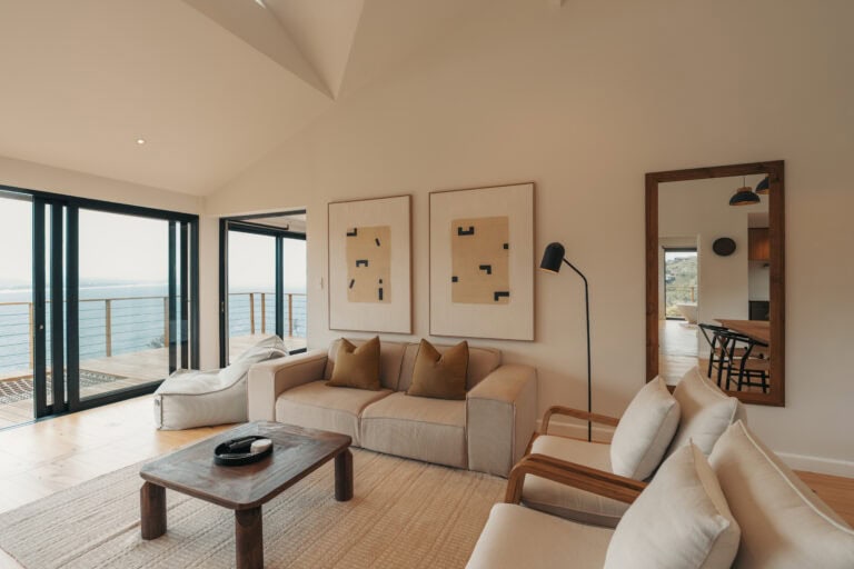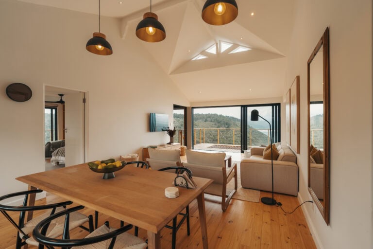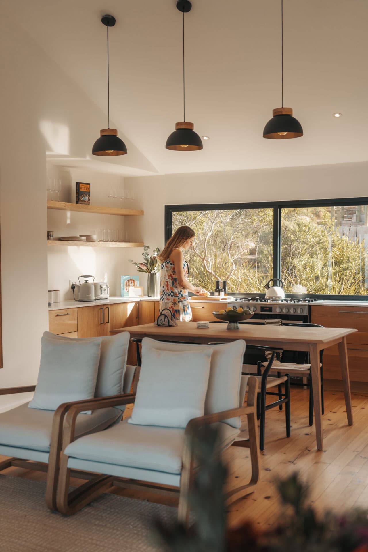 The modern, open-plan living space sits between the two bedrooms and features high, lofted ceilings that create a bright and airy feel. It opens out onto the deck and sea views, so the ocean is always front and centre. There’s a large couch, comfy armchairs, a Smart TV, and a four-seater dining table, along with a selection of books and board games.