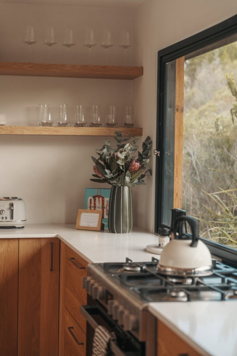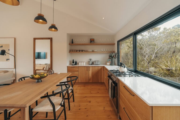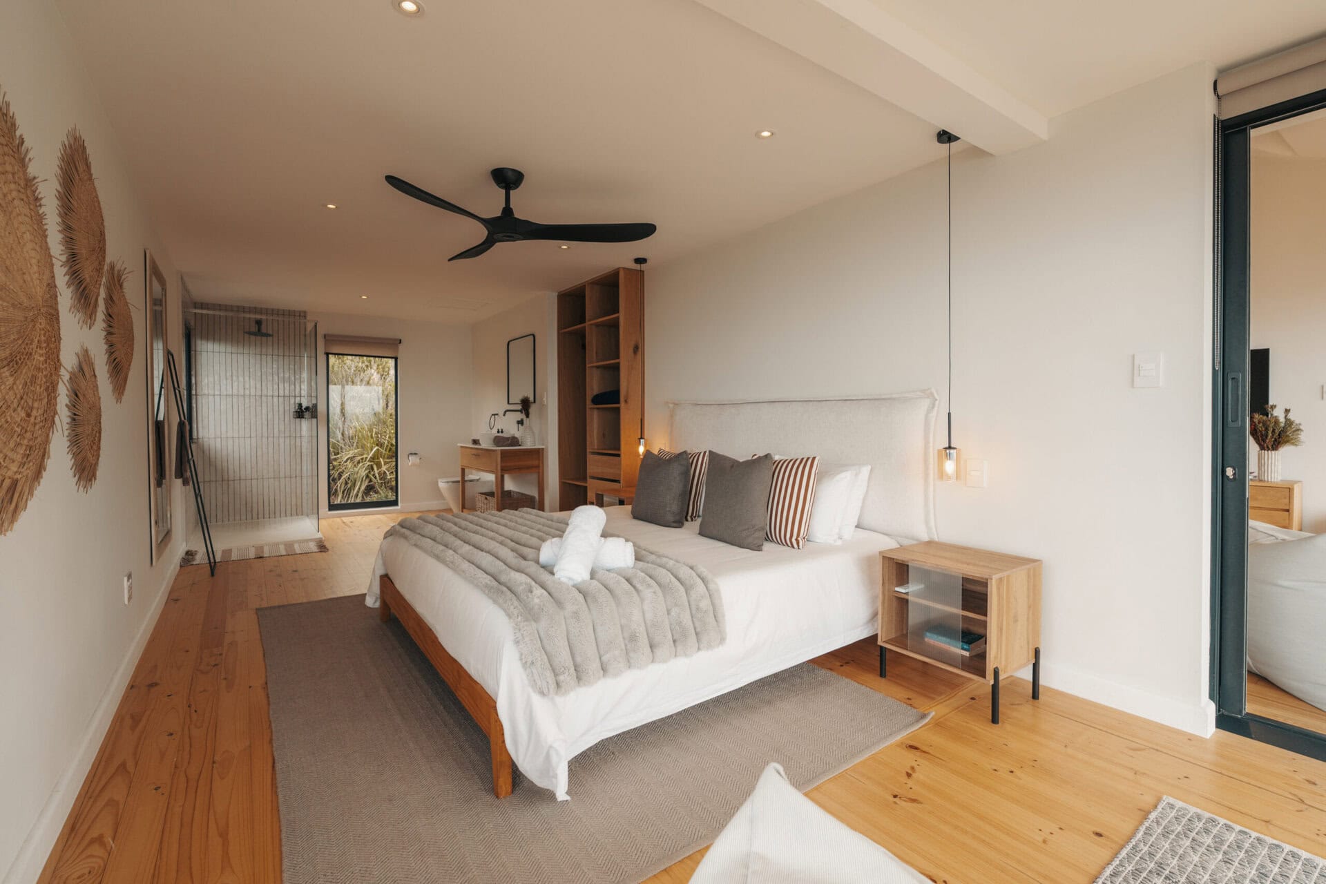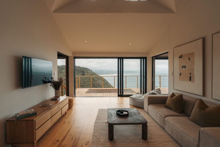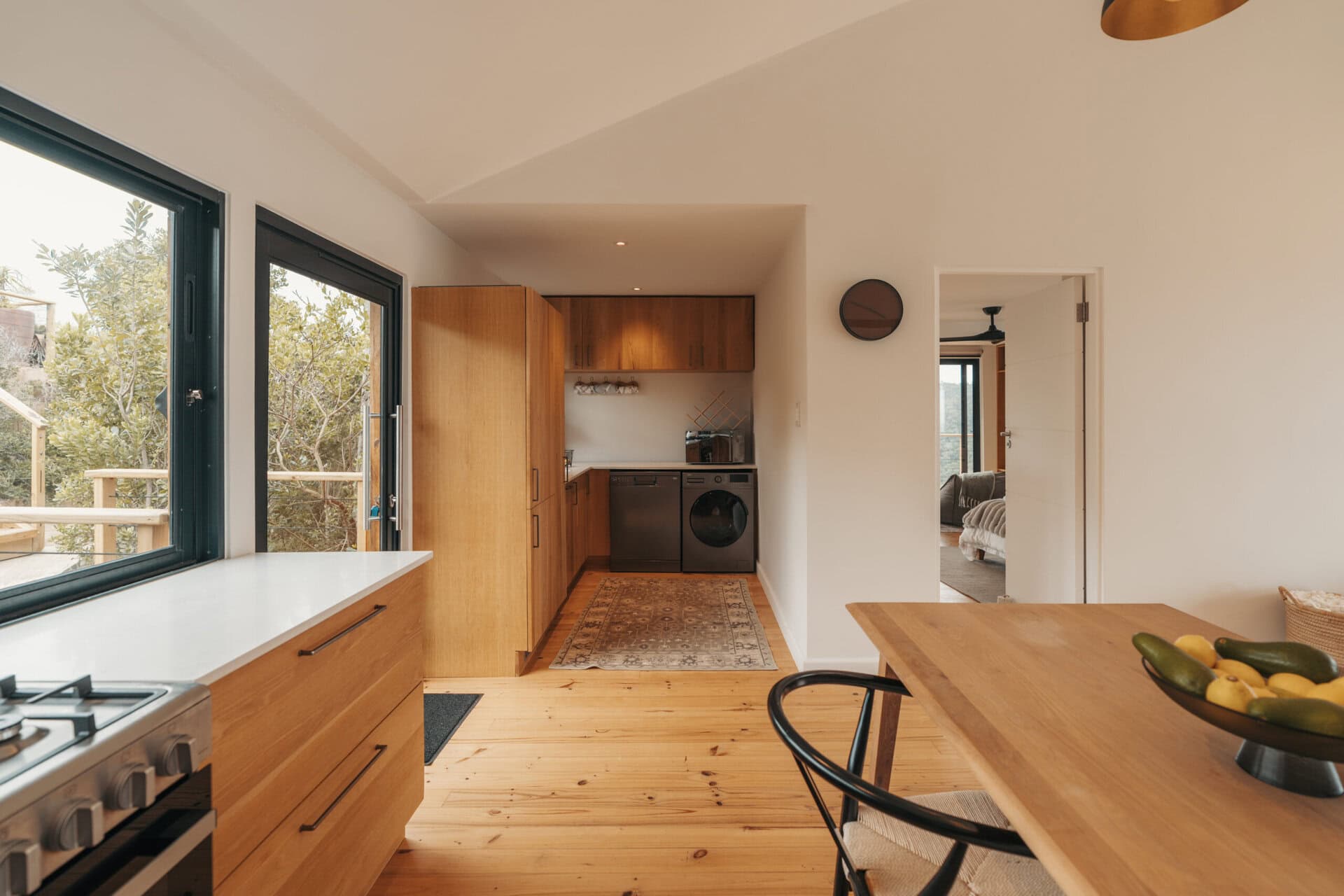 The modern, open-plan living space sits between the two bedrooms and features high, lofted ceilings that create a bright and airy feel. It opens out onto the deck and sea views, so the ocean is always front and centre. There’s a large couch, comfy armchairs, a Smart TV, and a four-seater dining table, along with a selection of books and board games.