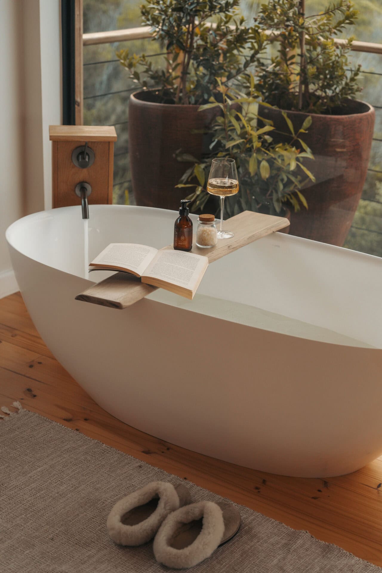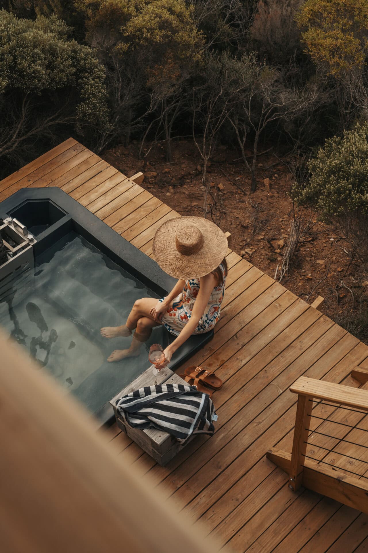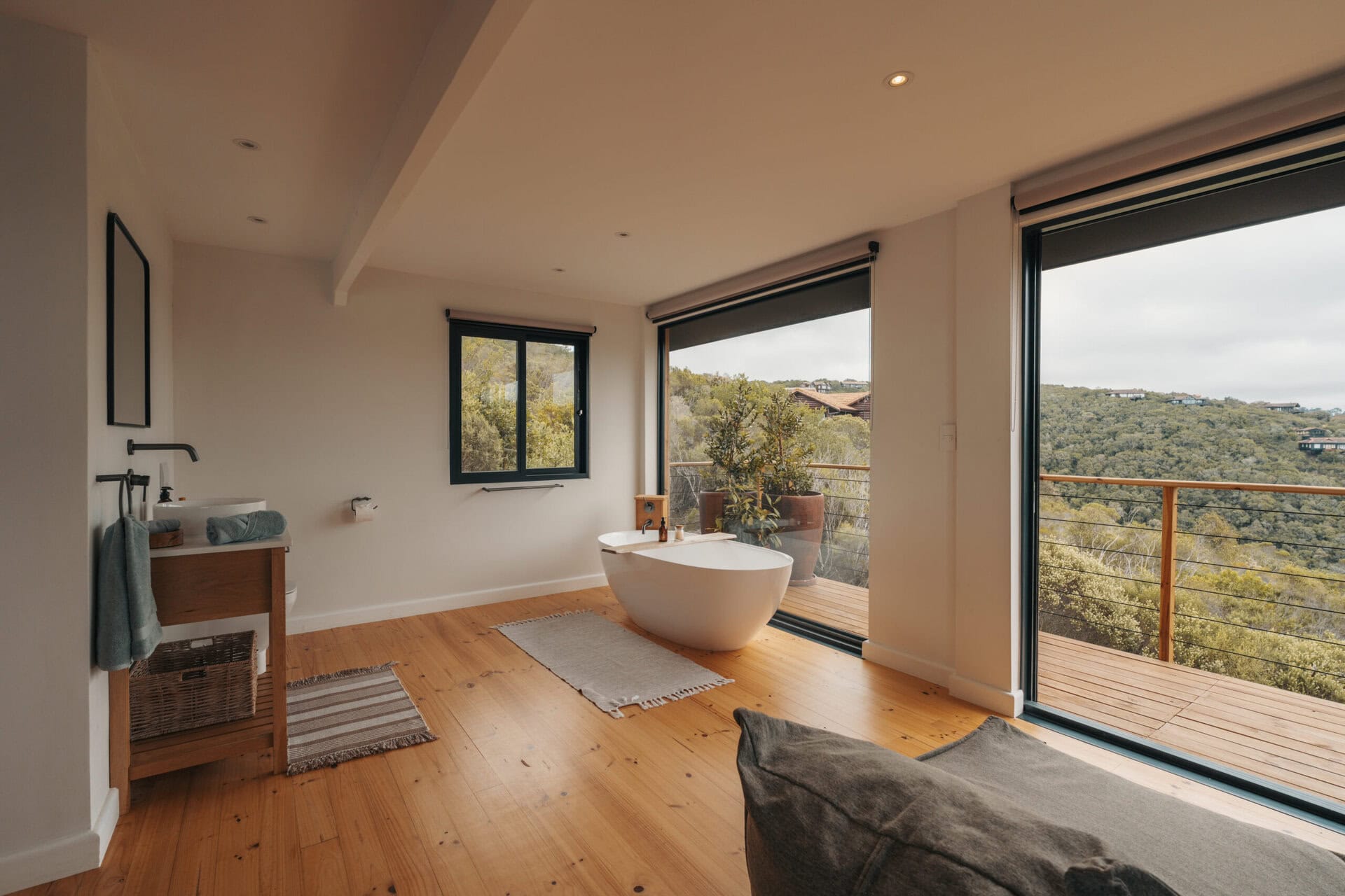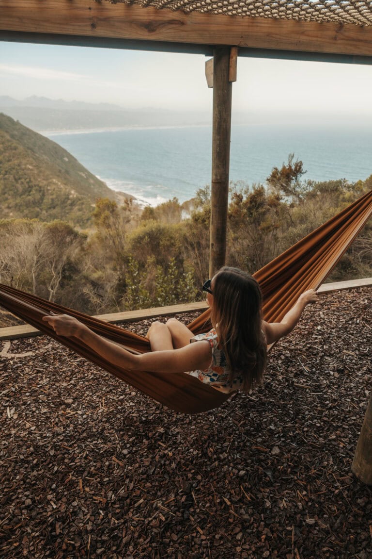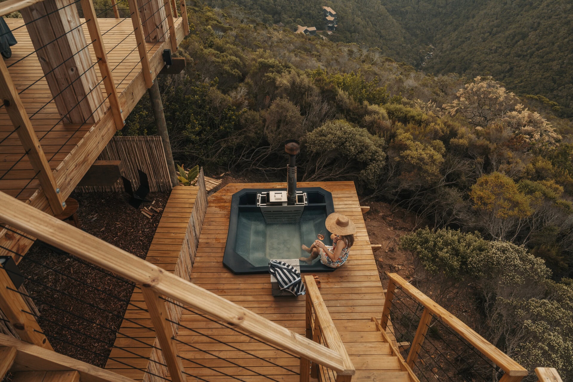 There are multiple outdoor spaces to take in the sea and cliff views. You’ll find a large cargo net that comfortably fits four, along with a gas braai and seating area on the deck. Steps lead down to a wood-fired hot tub and two hammocks, perfect for an afternoon nap!