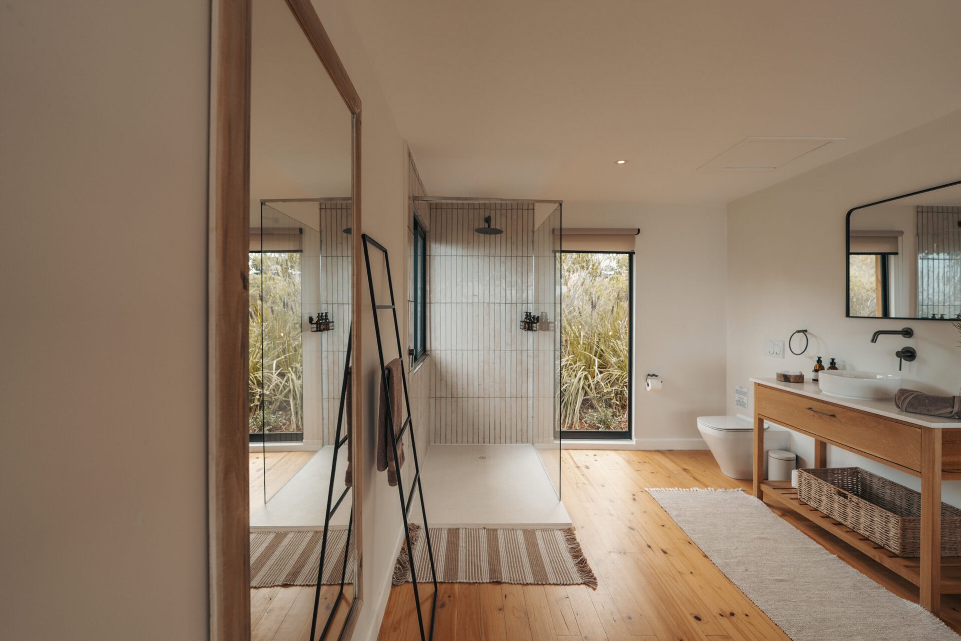 Both bathrooms are open-plan, adding to the spacious, relaxed feel of the rooms. One features a large bath, while the other has a walk-in shower.