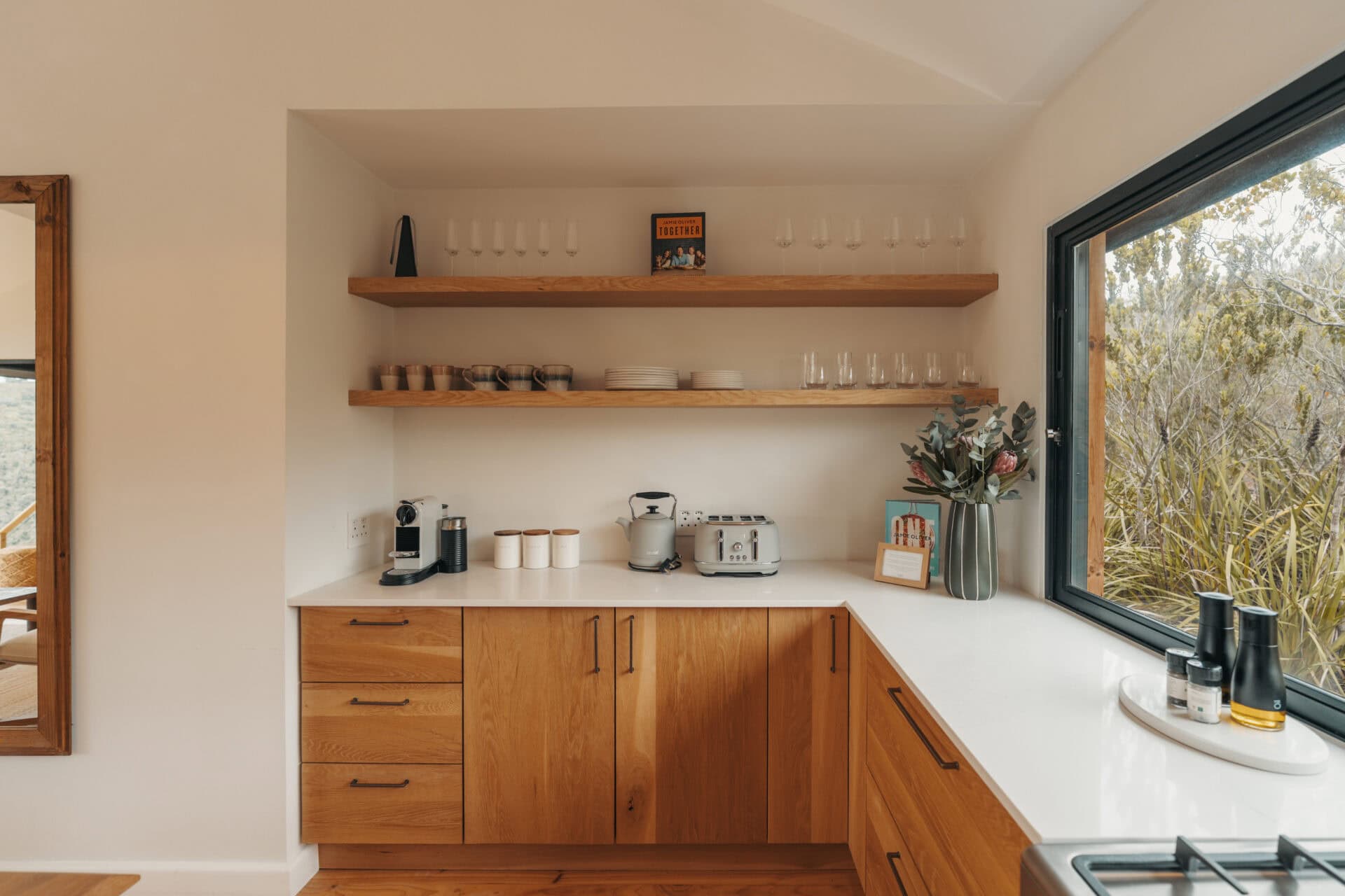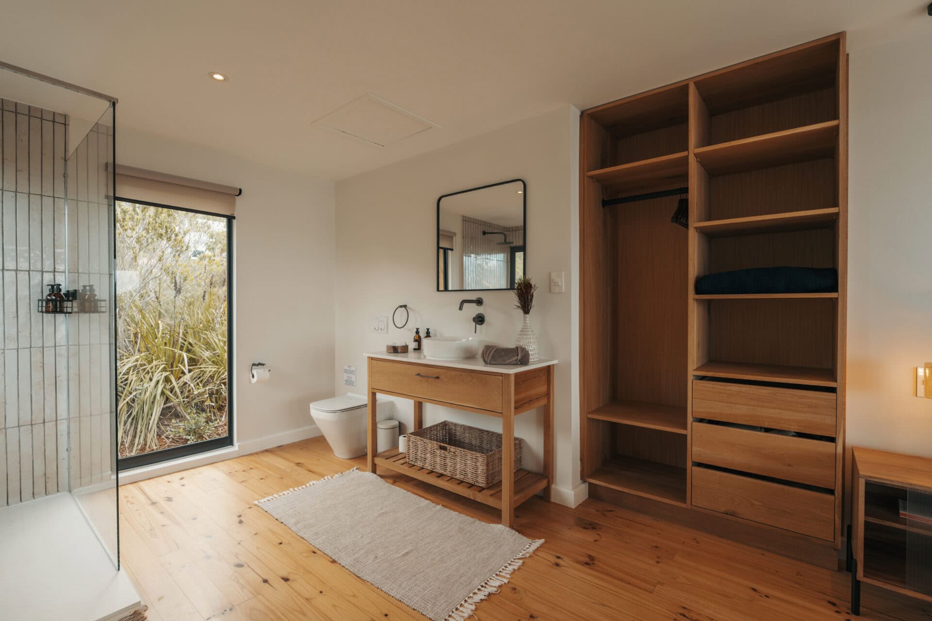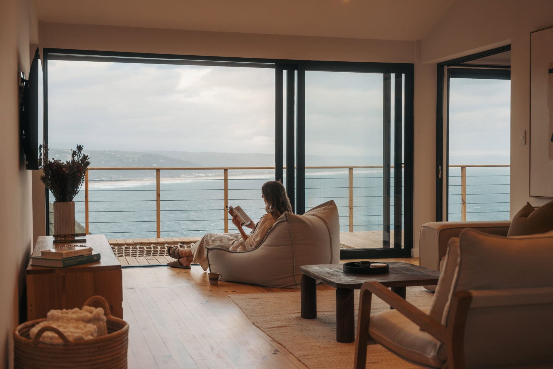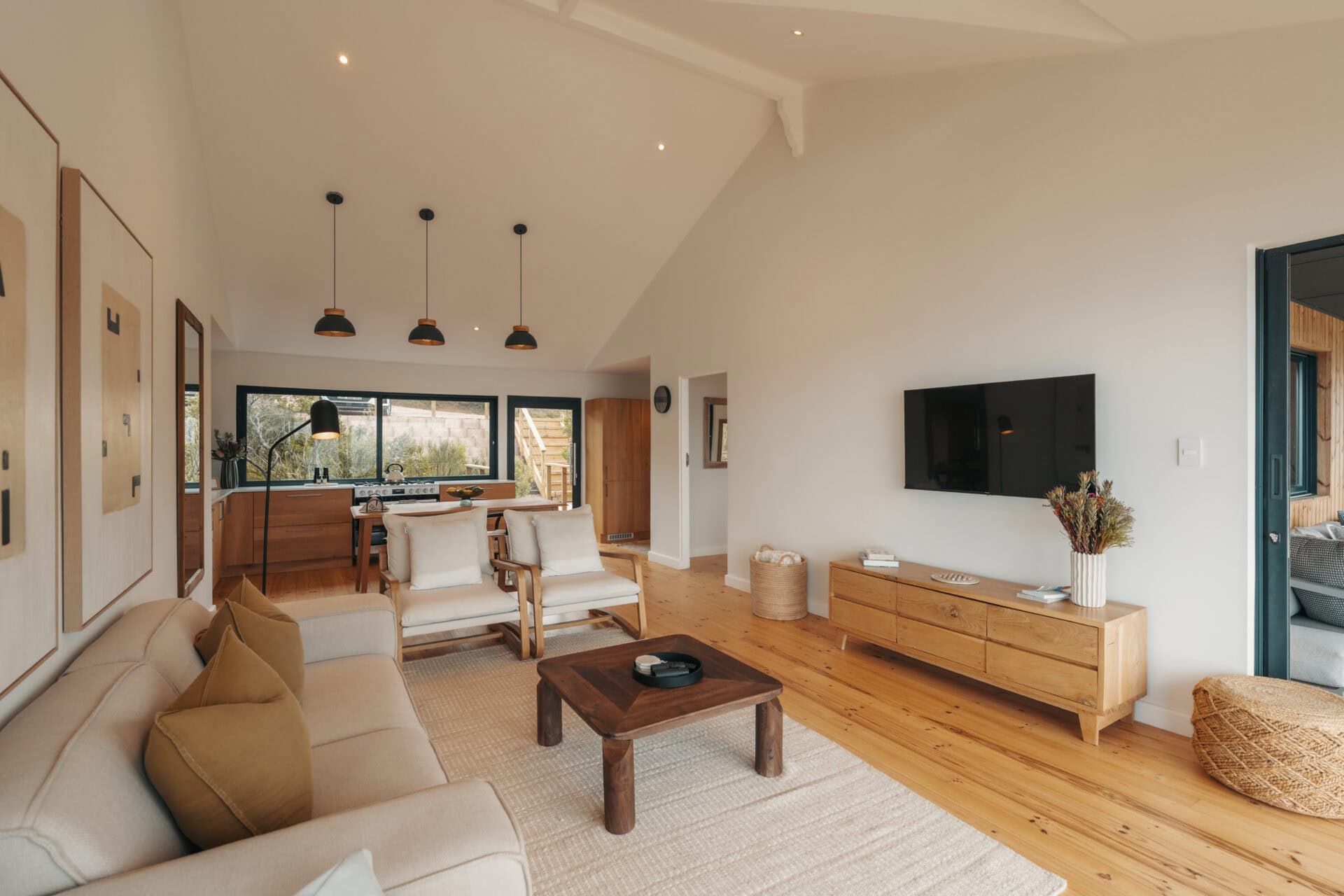The modern, open-plan living space sits between the two bedrooms and features high, lofted ceilings that create a bright and airy feel. It opens out onto the deck and sea views, so the ocean is always front and centre. There’s a large couch, comfy armchairs, a Smart TV, and a four-seater dining table, along with a selection of books and board games.