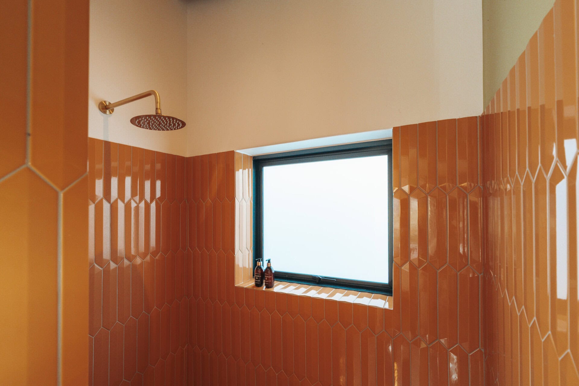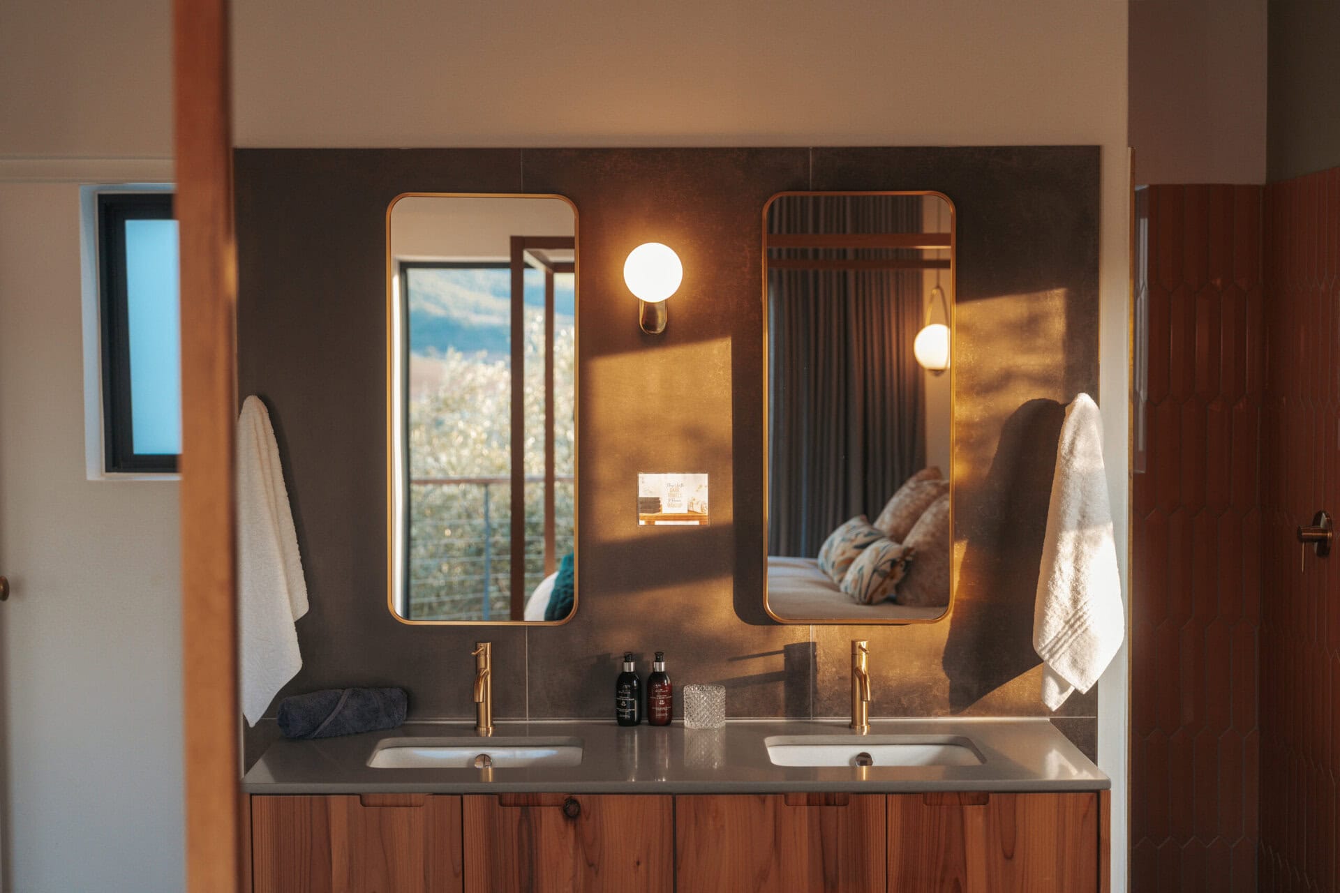 There is a double vanity in the bedroom fitted with stunning brushed gold fittings. There is a large walk-in shower behind with a massive shower head and the toilet is separate for privacy.