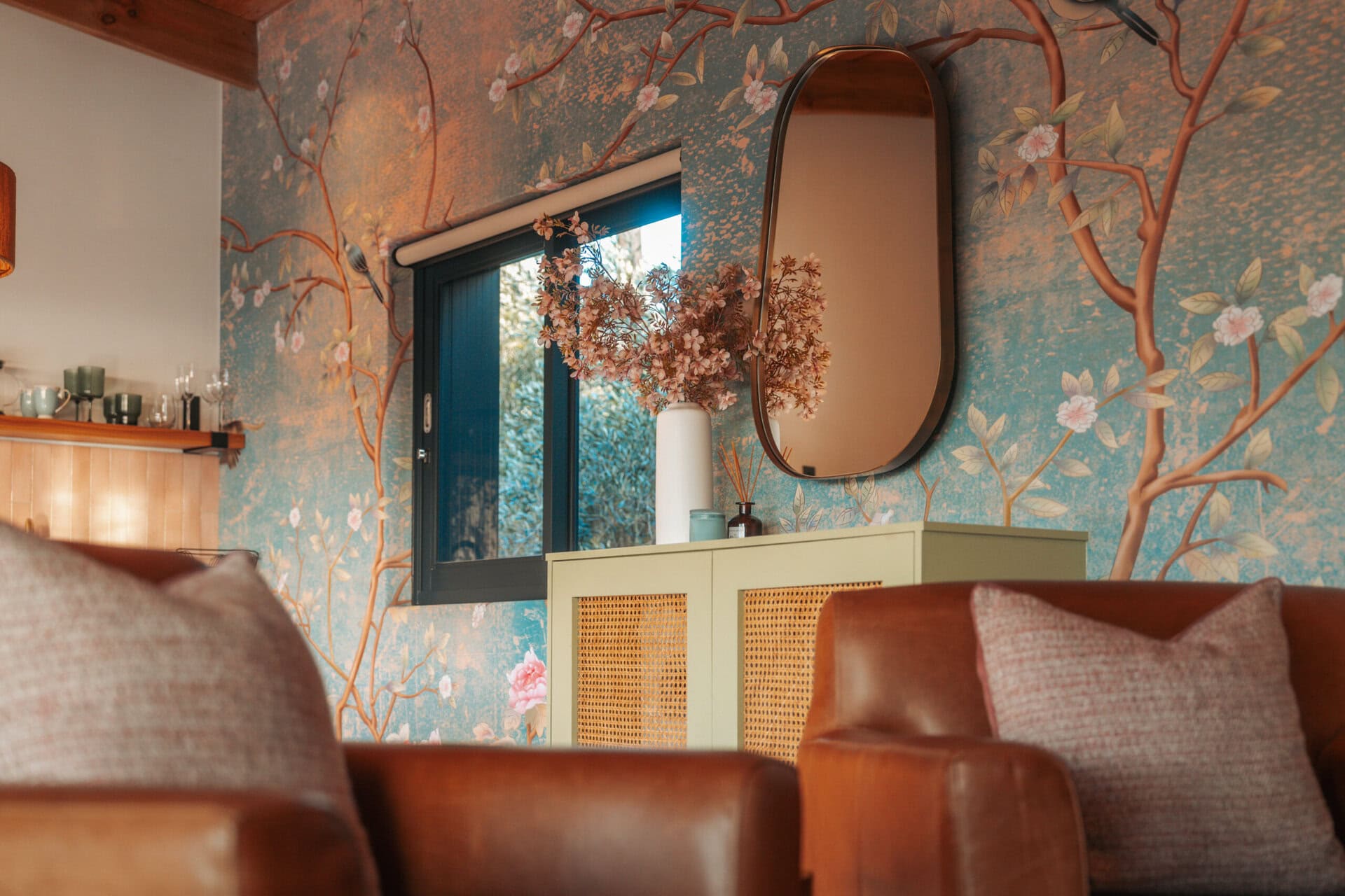 The spacious open-plan living space features a stunning Japanese inspired wallpaper, with white and pink blossoms creating a romantic backdrop. There is a small dining area and two leather armchairs with footrests positioned in front of the fireplace and TV.