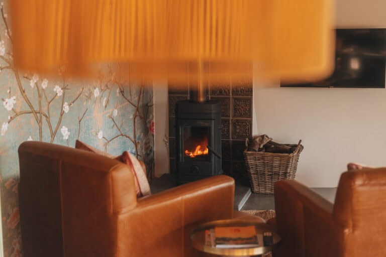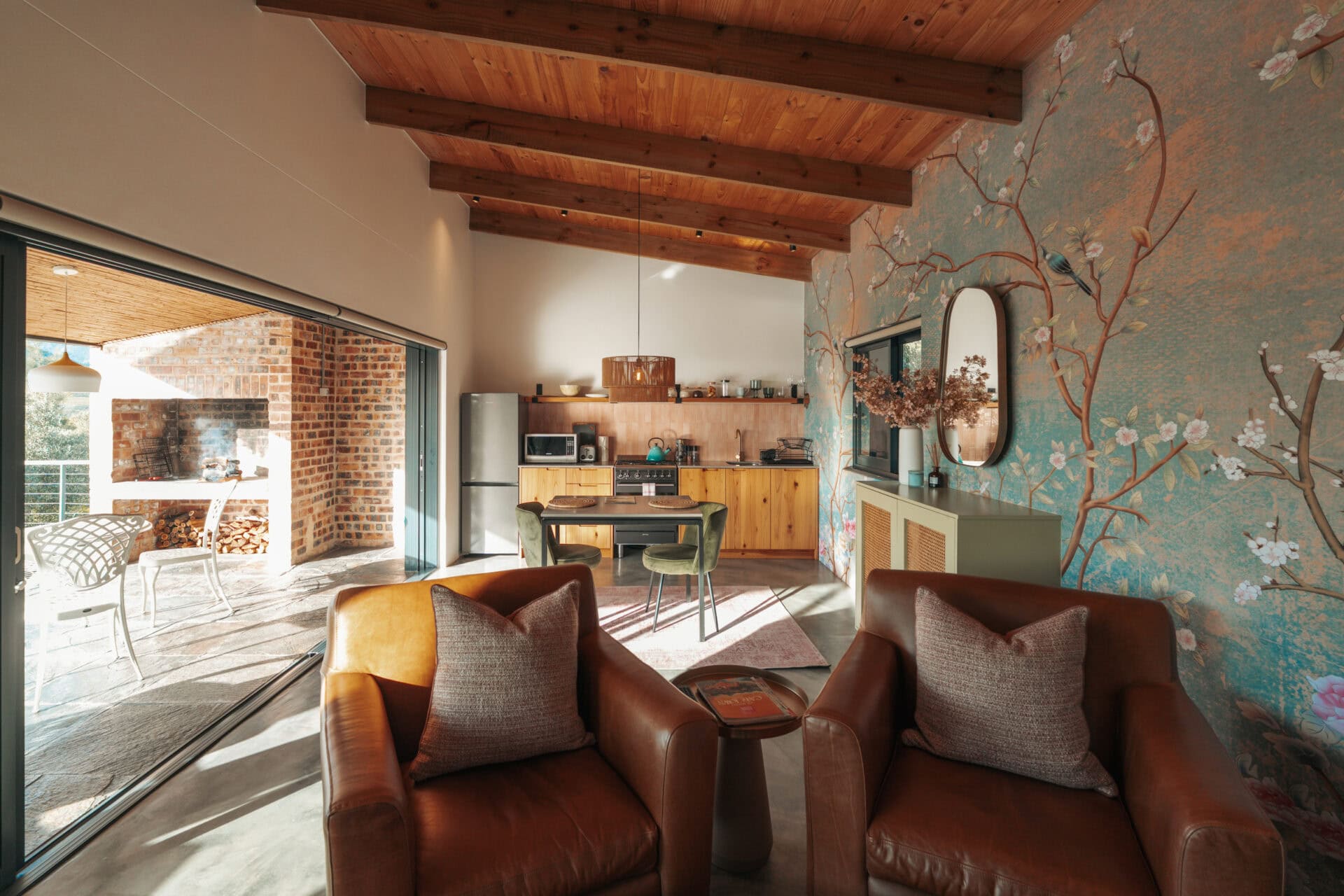 The spacious open-plan living space features a stunning Japanese inspired wallpaper, with white and pink blossoms creating a romantic backdrop. There is a small dining area and two leather armchairs with footrests positioned in front of the fireplace and TV.