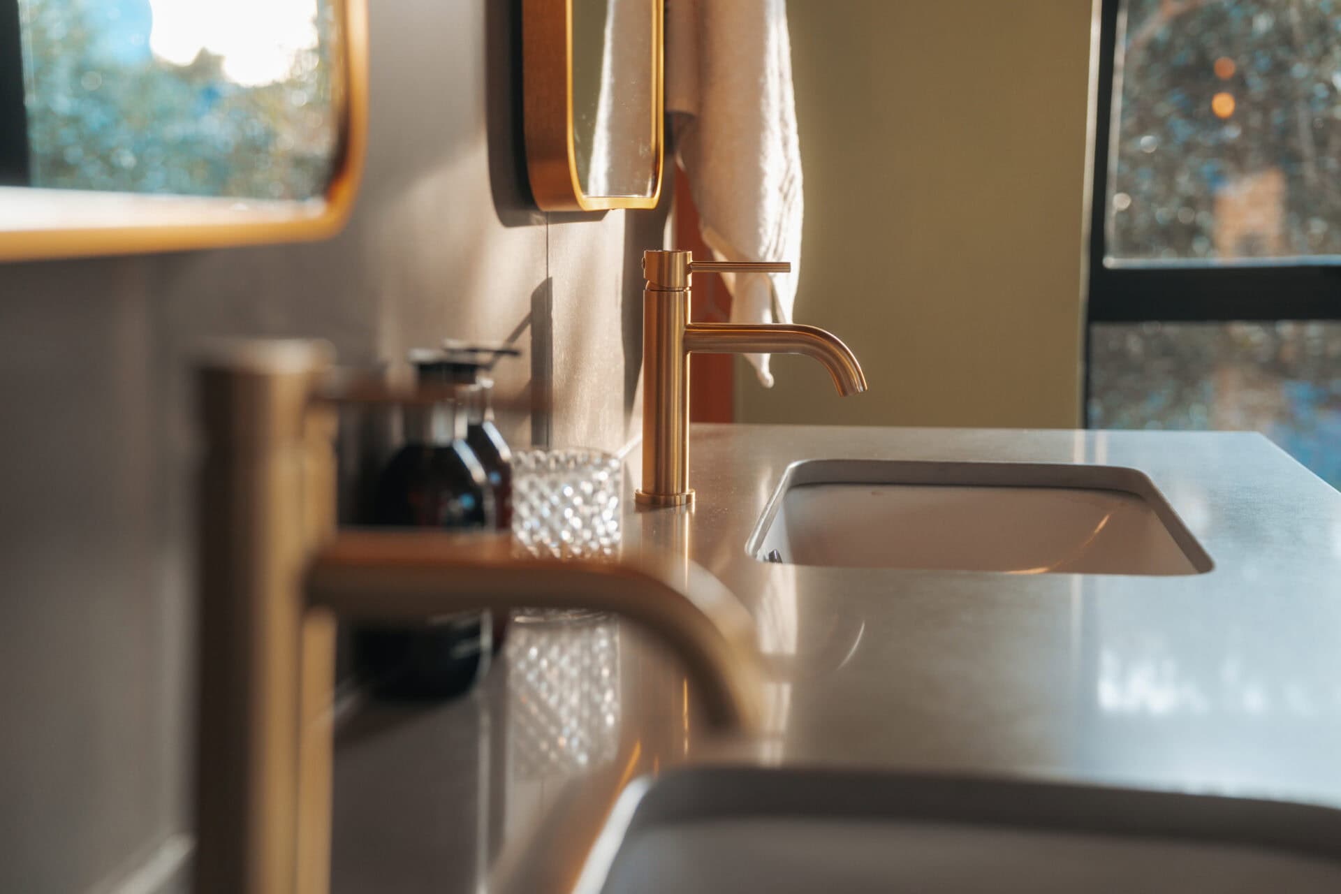 There is a double vanity in the bedroom fitted with stunning brushed gold fittings. There is a large walk-in shower behind with a massive shower head and the toilet is separate for privacy.