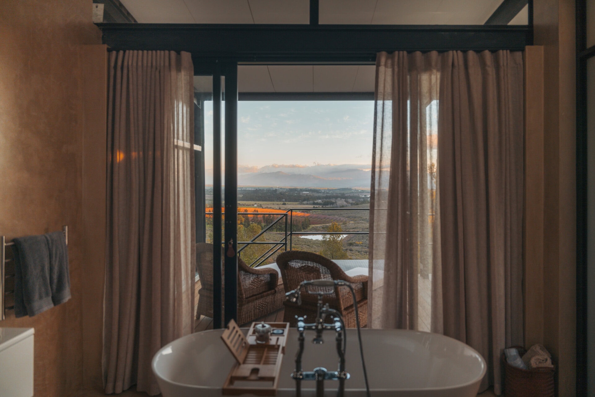 The bedroom opens out onto the deck and boasts stunning mountain views. The extra length king-sized bed comes with extra blankets for winter. There’s also an aircon for those hot summer nights and a cupboard for storage.