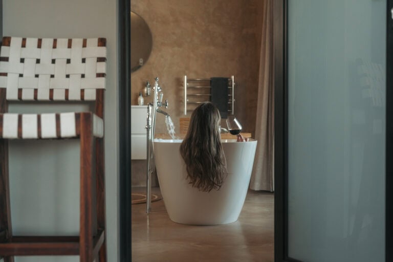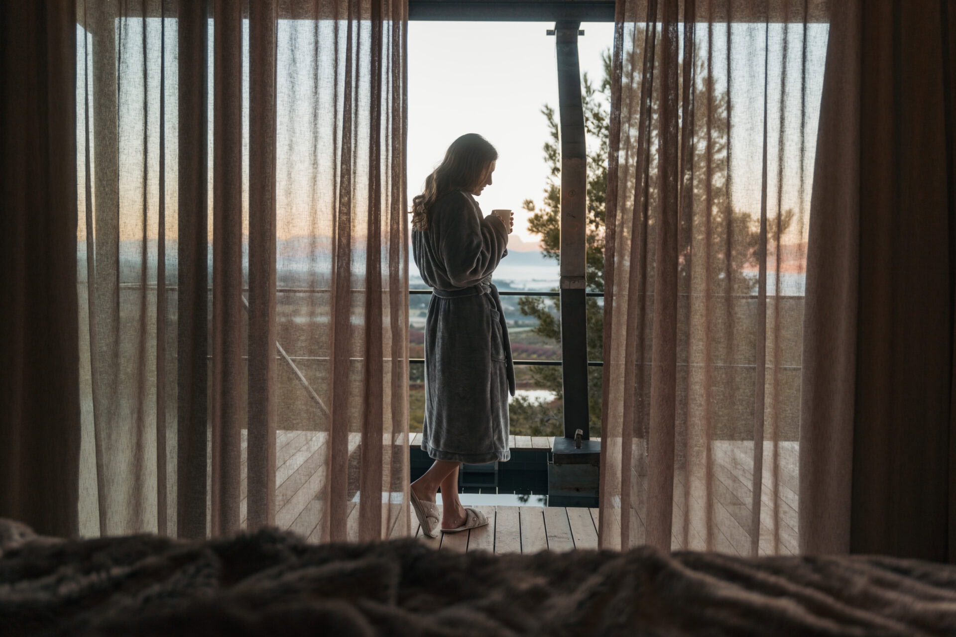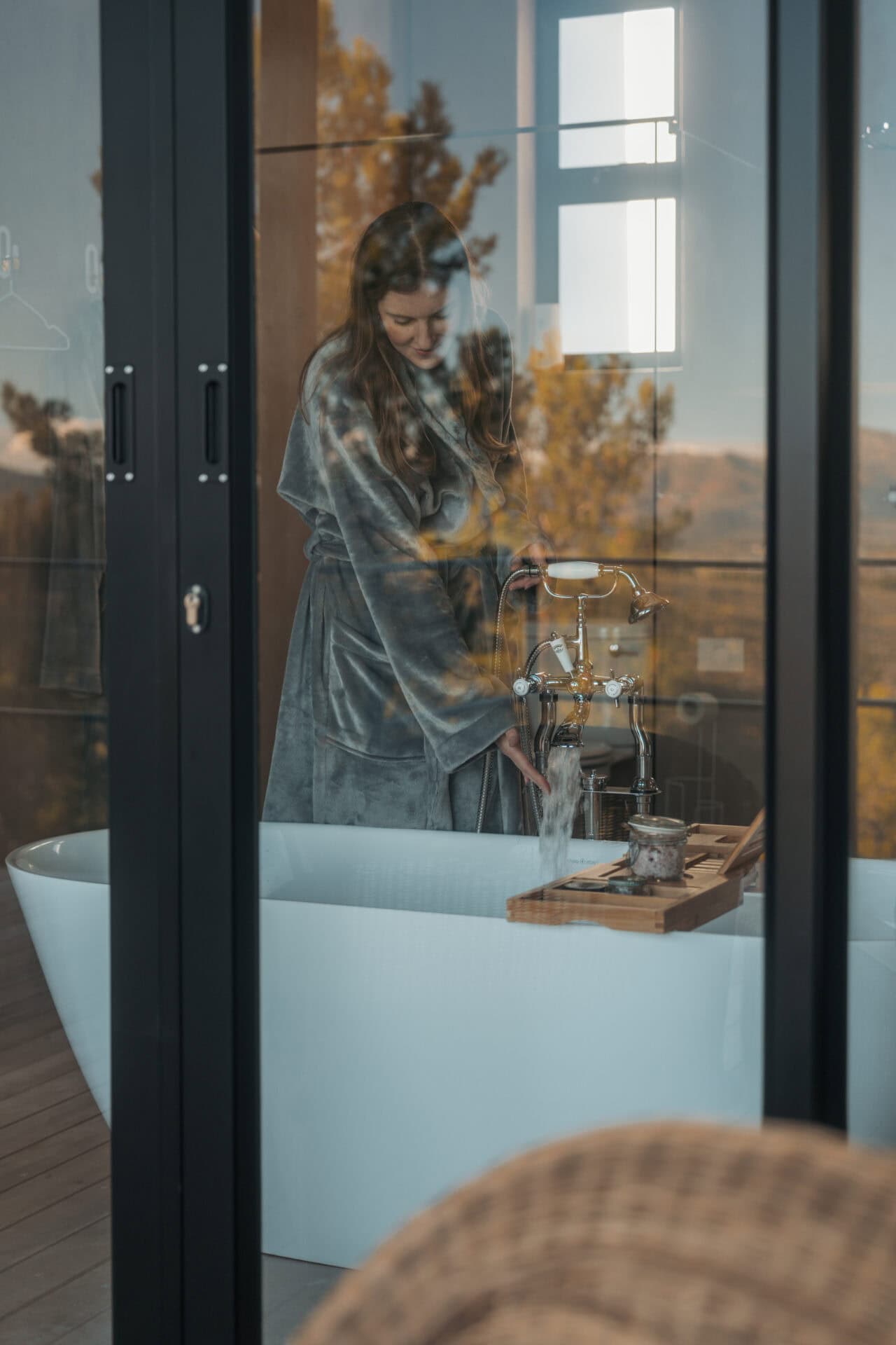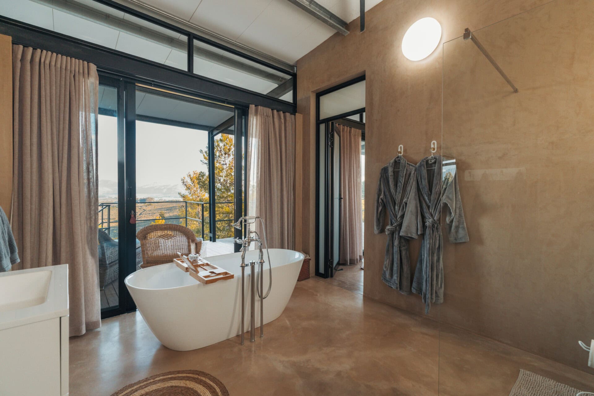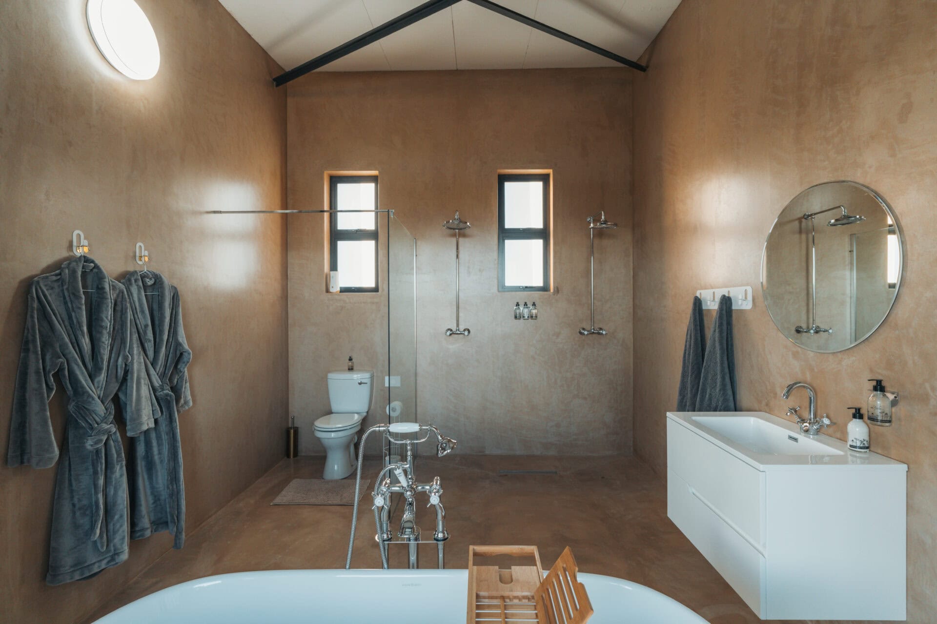 The large brushed concrete bathroom features a spacious double shower and bath. You can open the doors fully and enjoy your bath more in nature. Bath amenities and fluffy gowns are provided.