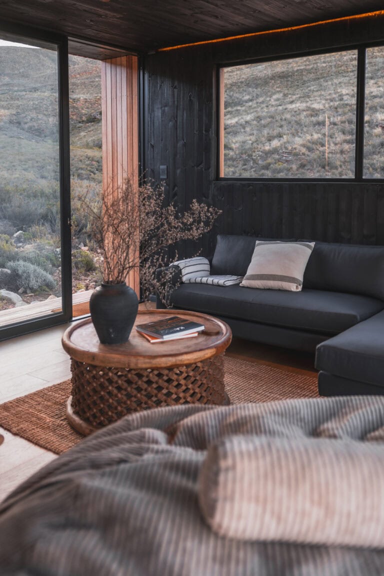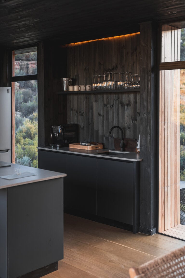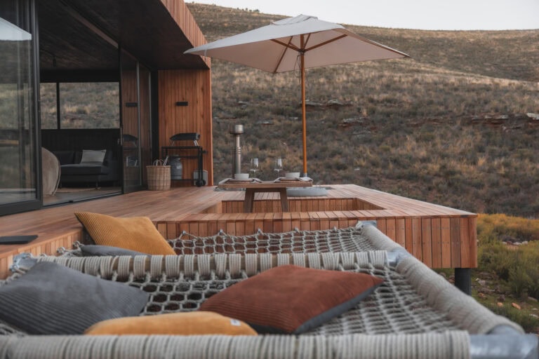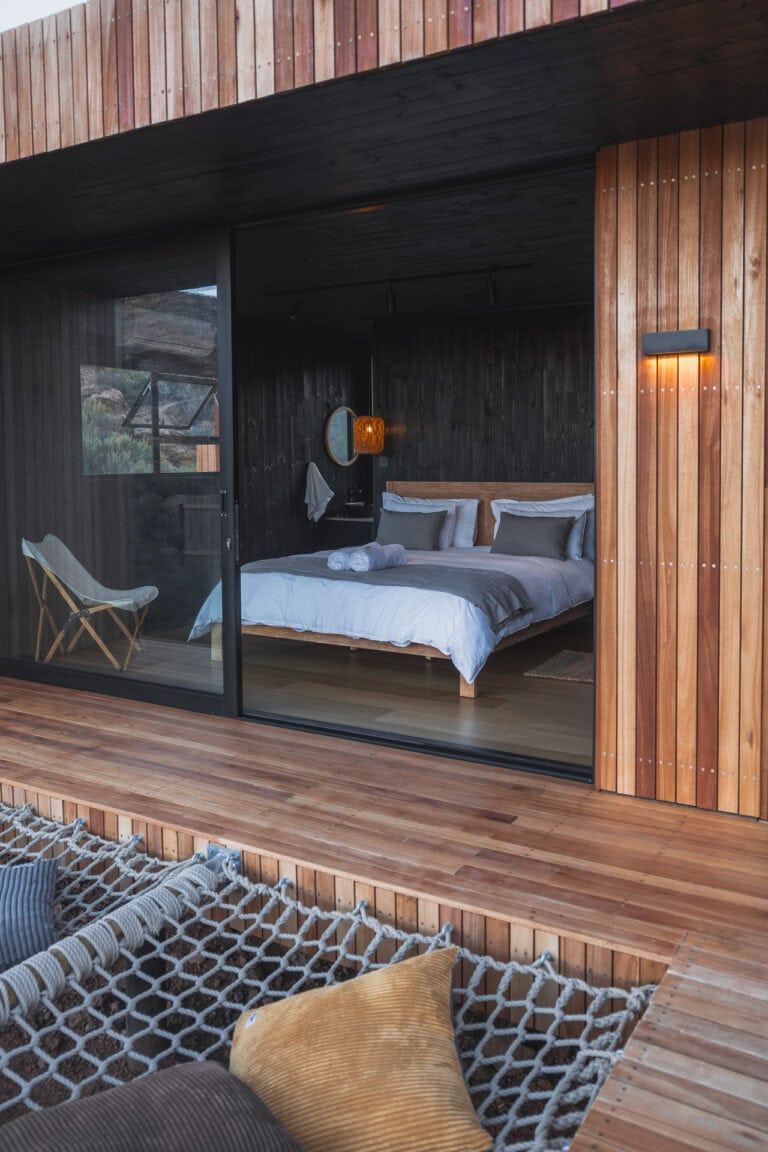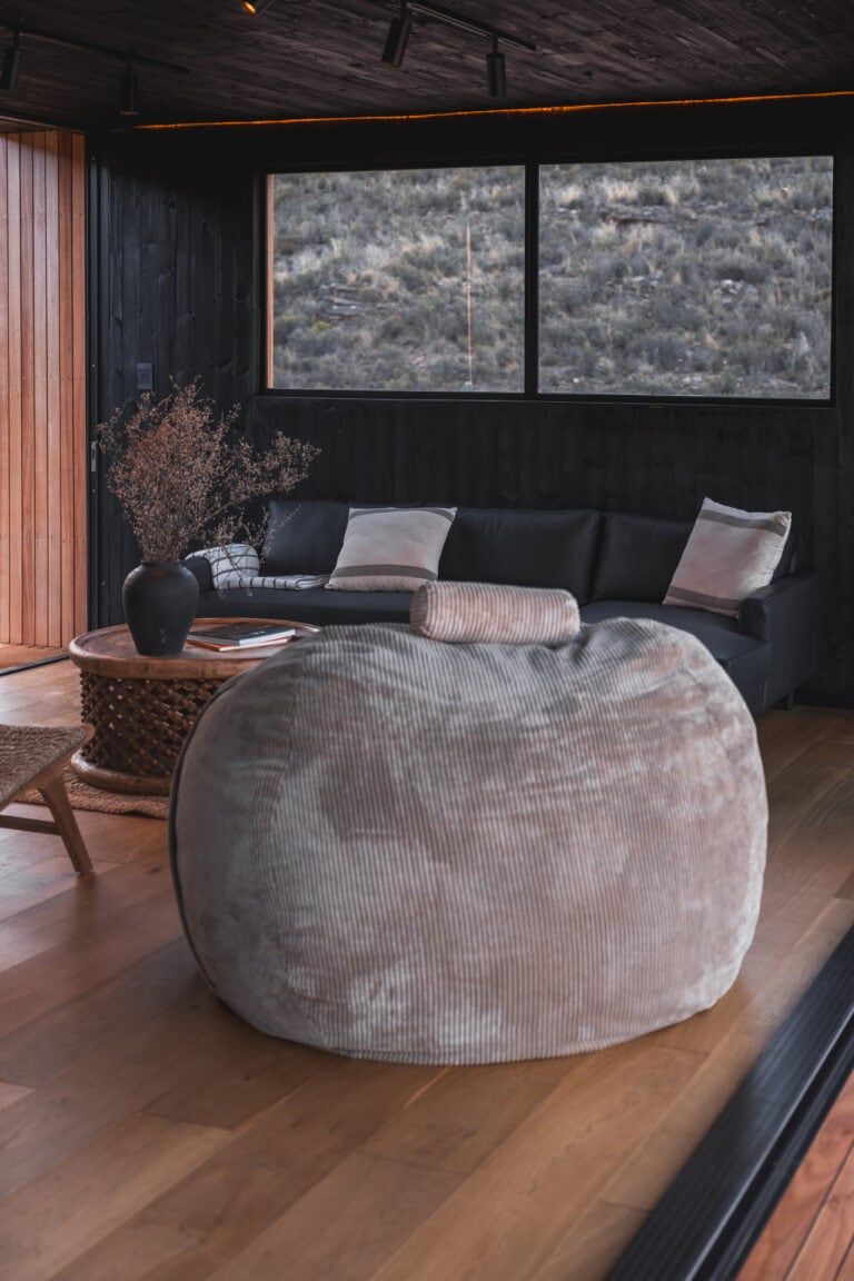 Outside you’ll find all the outdoor amenities you could wish for — a wood-fired hot tub, cargo nets, Ooni pizza oven, outdoor dining area, braai and boma area and a show stopper outdoor bath and shower. Inside you’ll be greeted by stylish and modern touches and all the home-away-from-home comforts. The cabin is also fully off-grid too so you don’t need to worry about loadshedding killing your vibe!