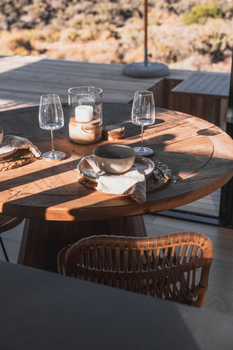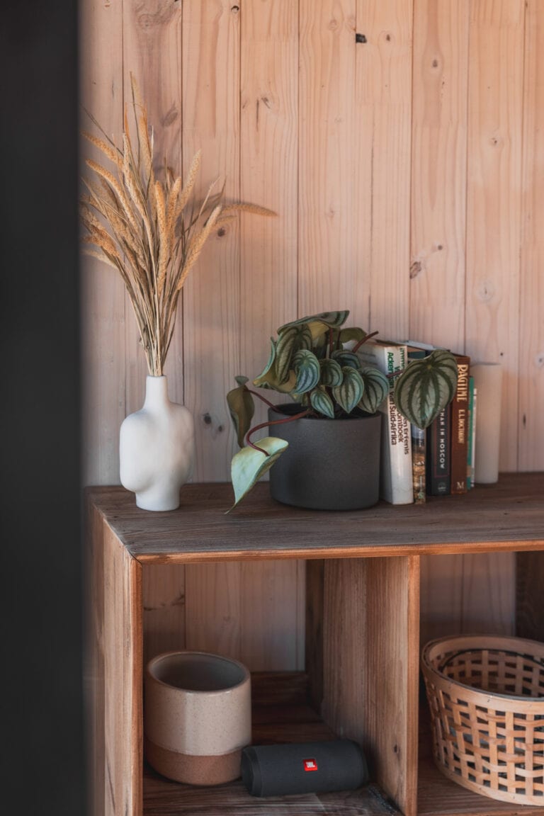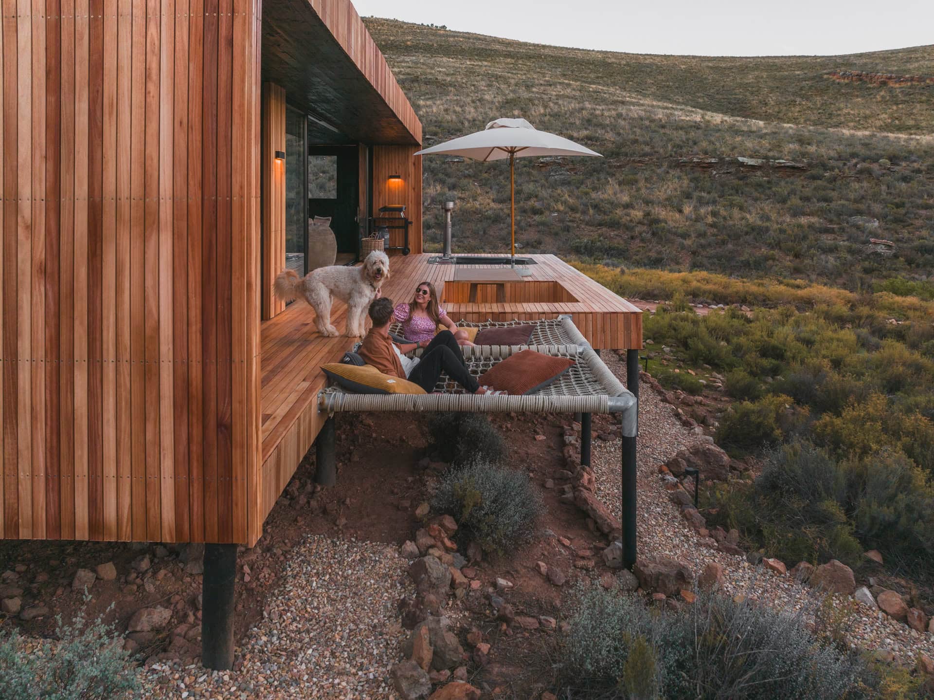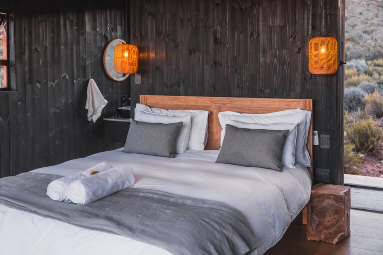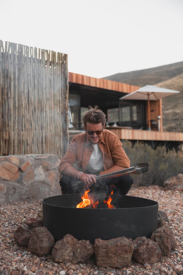 Outside you’ll find all the outdoor amenities you could wish for — a wood-fired hot tub, cargo nets, Ooni pizza oven, outdoor dining area, braai and boma area and a show stopper outdoor bath and shower. Inside you’ll be greeted by stylish and modern touches and all the home-away-from-home comforts. The cabin is also fully off-grid too so you don’t need to worry about loadshedding killing your vibe!