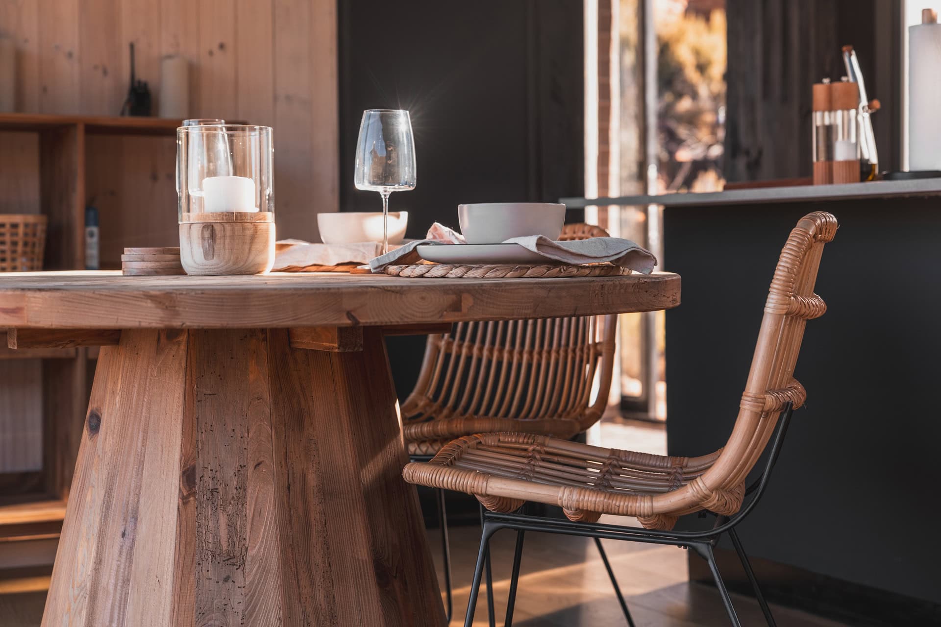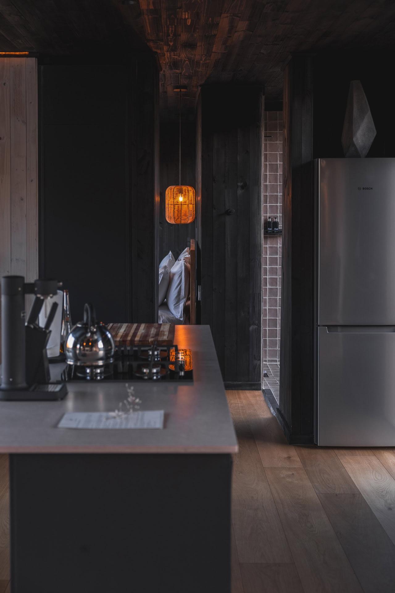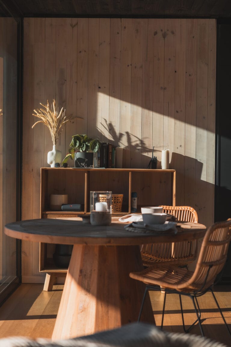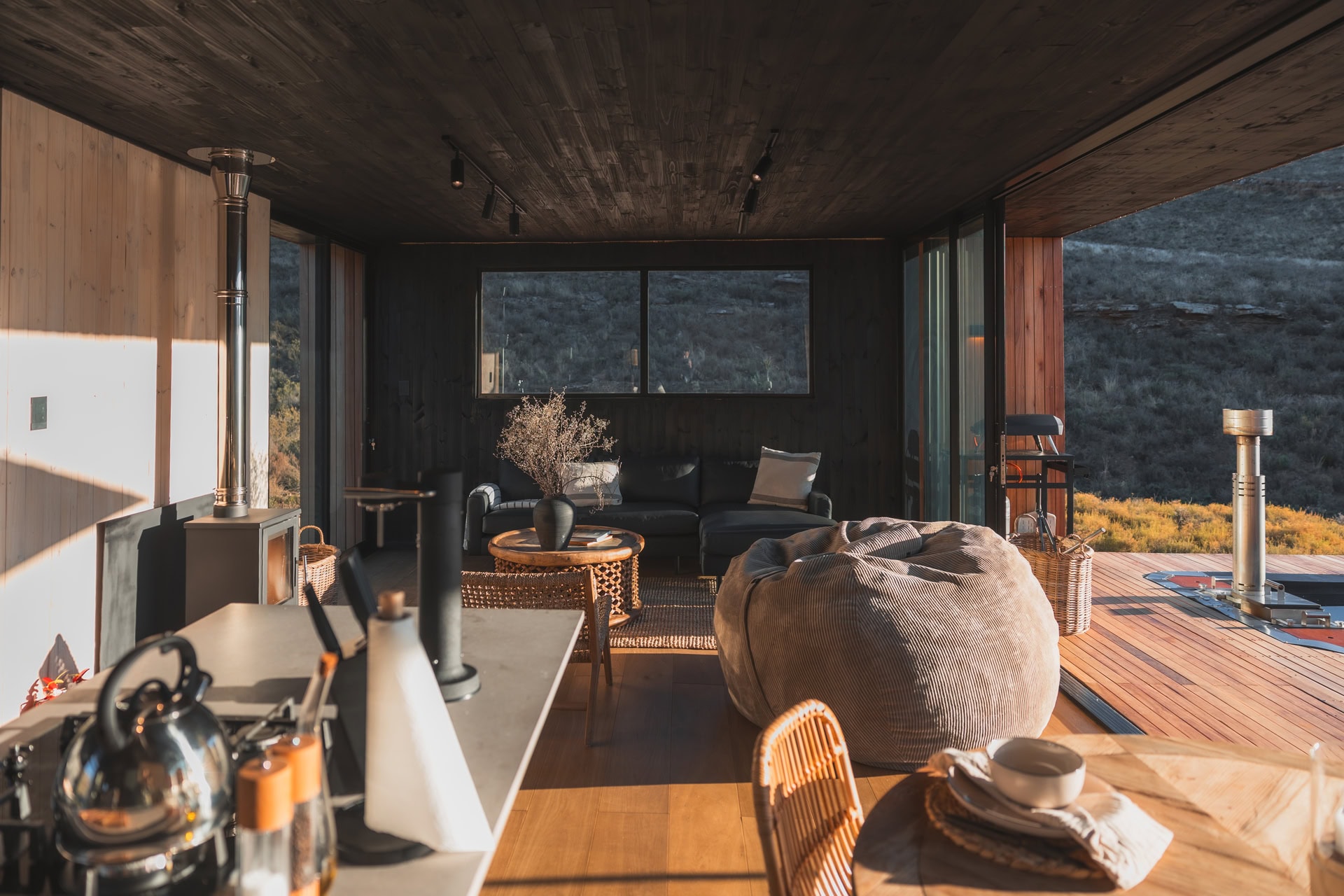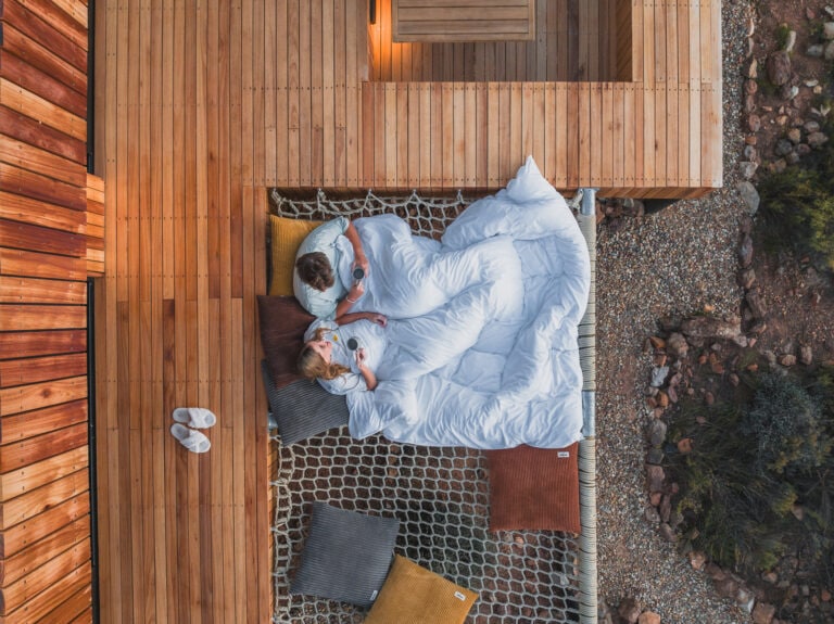 There’s a large L-shaped couch, comfy two-person Vetsak and an indoor fireplace. You can choose to dine indoors or outdoors at the sunken dining table on the wooden deck. Books and board games are provided, as well as your choice of beats, thanks to a nifty bluetooth speaker.
