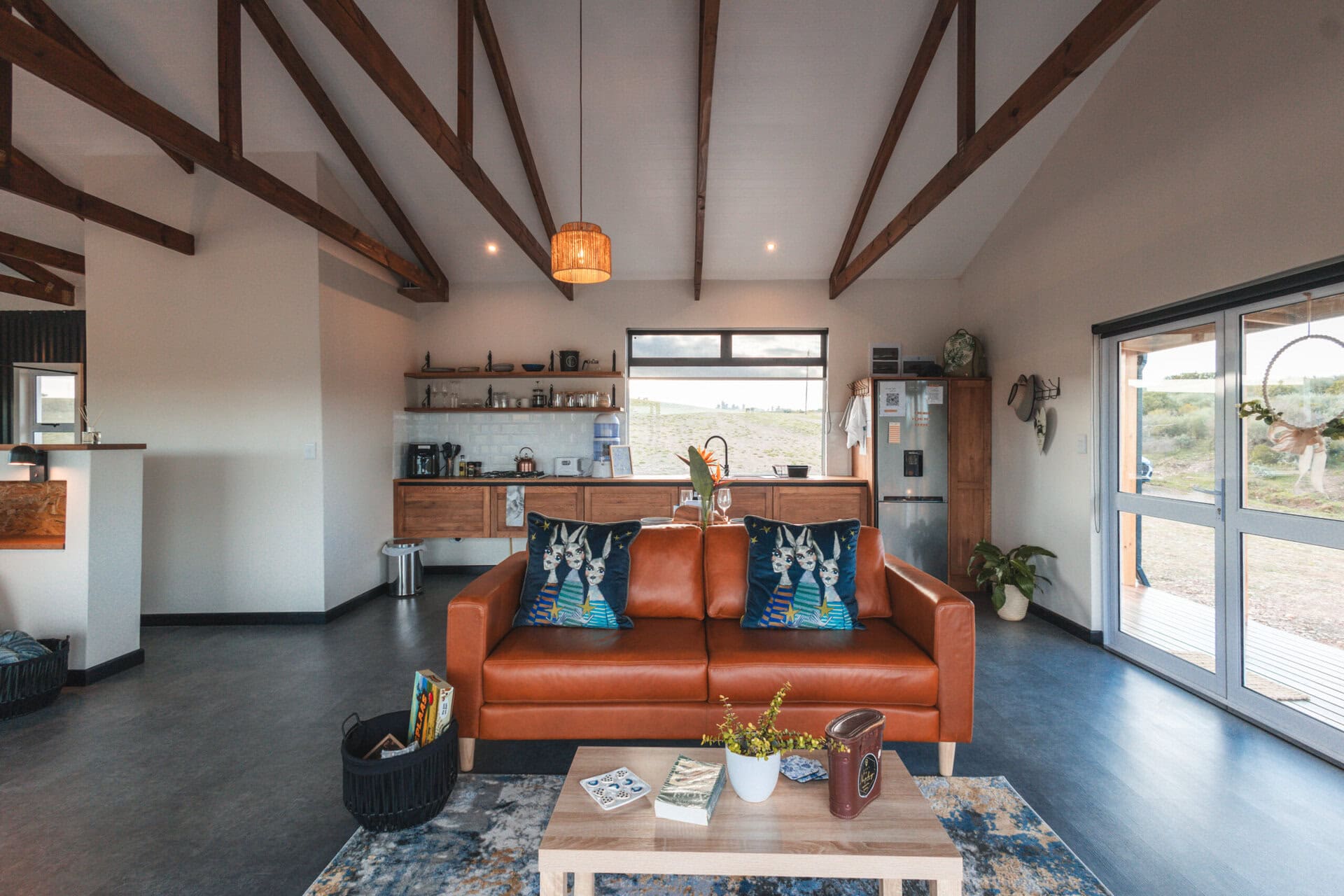 The open plan living space features a large leather couch perfectly positioned to take in the views, complete with binoculars and a bird book for identifying all the birds you spot! The space also includes a cozy fireplace and a selection of board games. Behind the couch, you’ll find a small dining table for two.