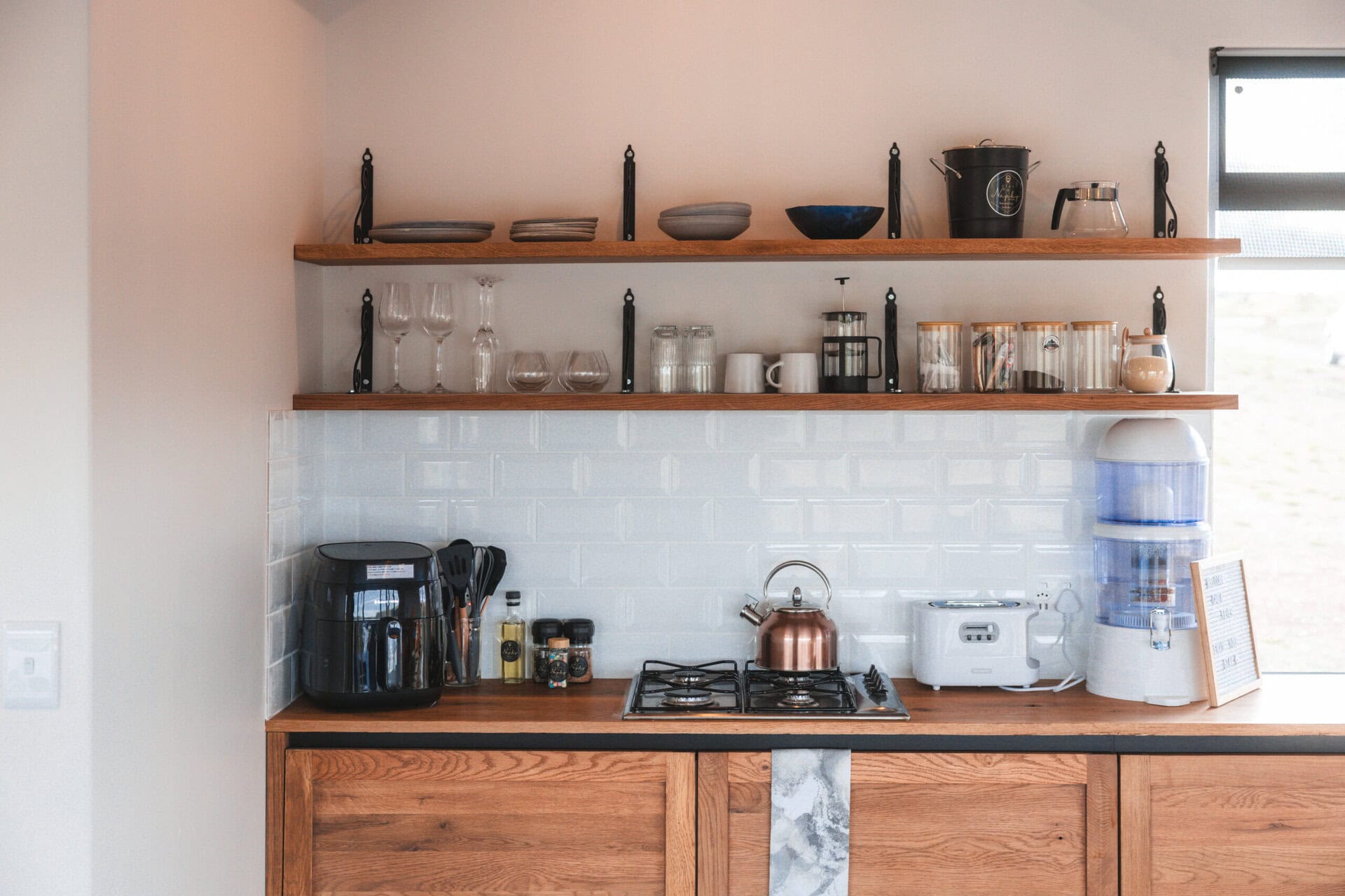 There’s a fully equipped kitchen with a gas hob, fridge-freezer, whistling kettle, air fryer, water filter and toaster. Coffee, tea, sugar, milk, olive oil, and salt & pepper are provided.