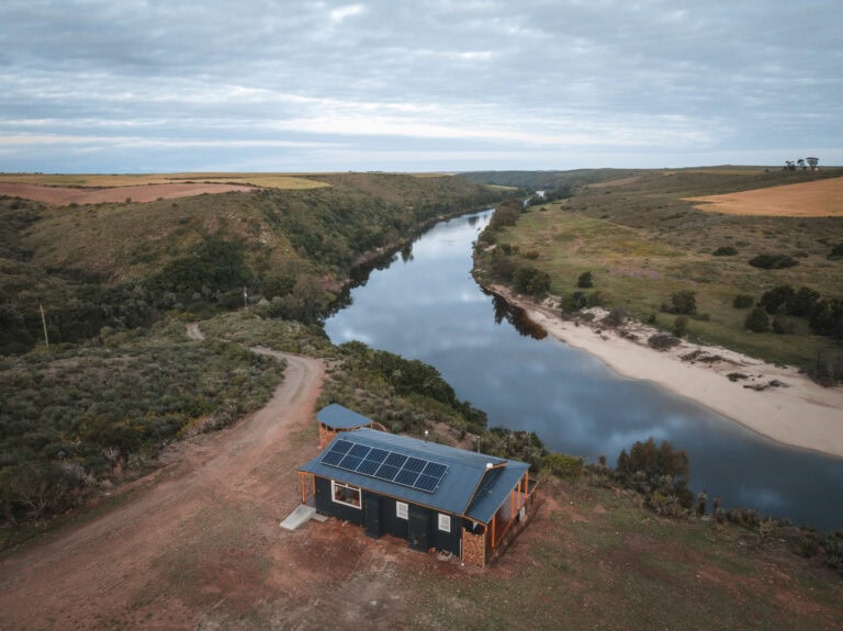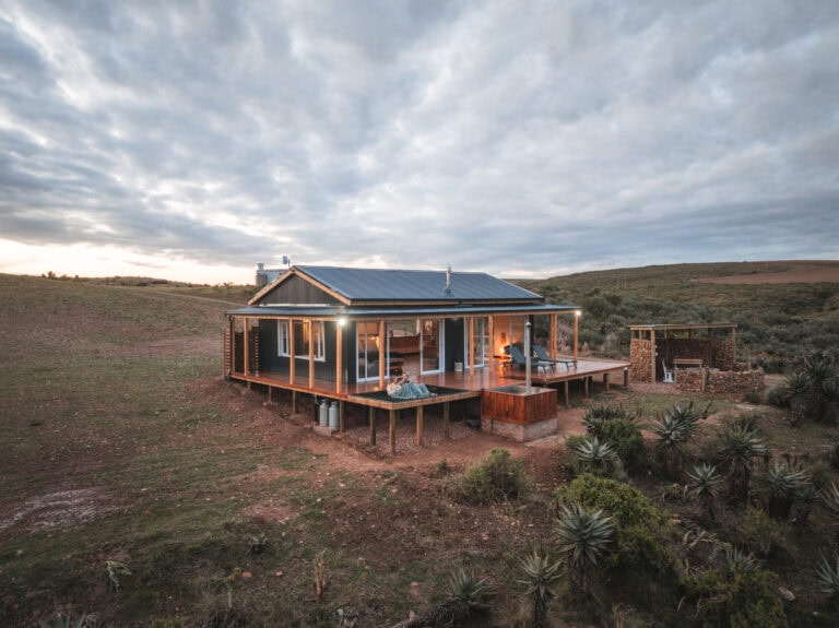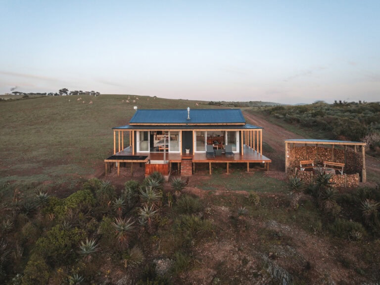 Located 3 hours from Cape Town on a working wheat farm with sheep and cattle, it’s completely private, features a wood-fired hot tub and cargo nets, and is just a short walk down to the river.