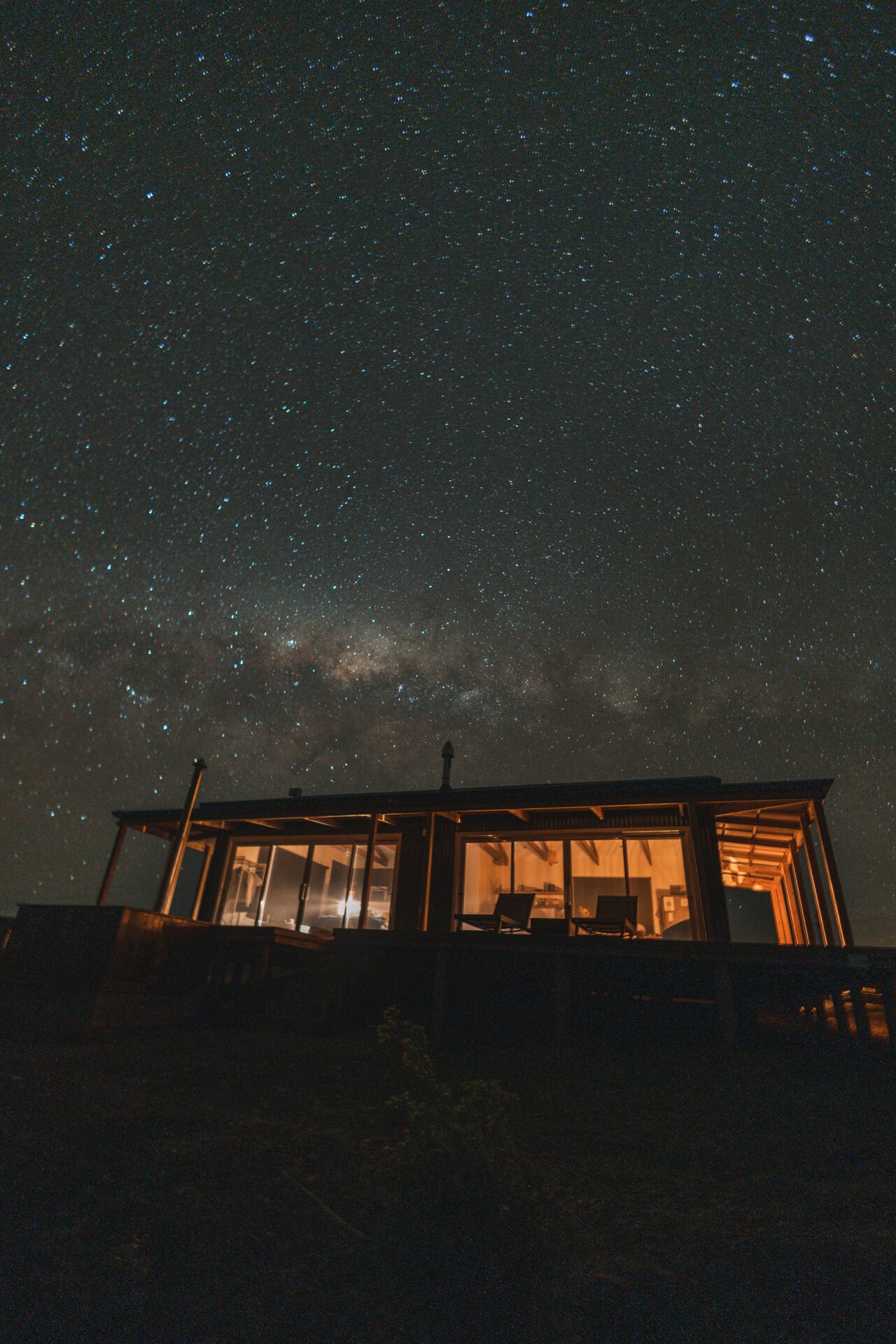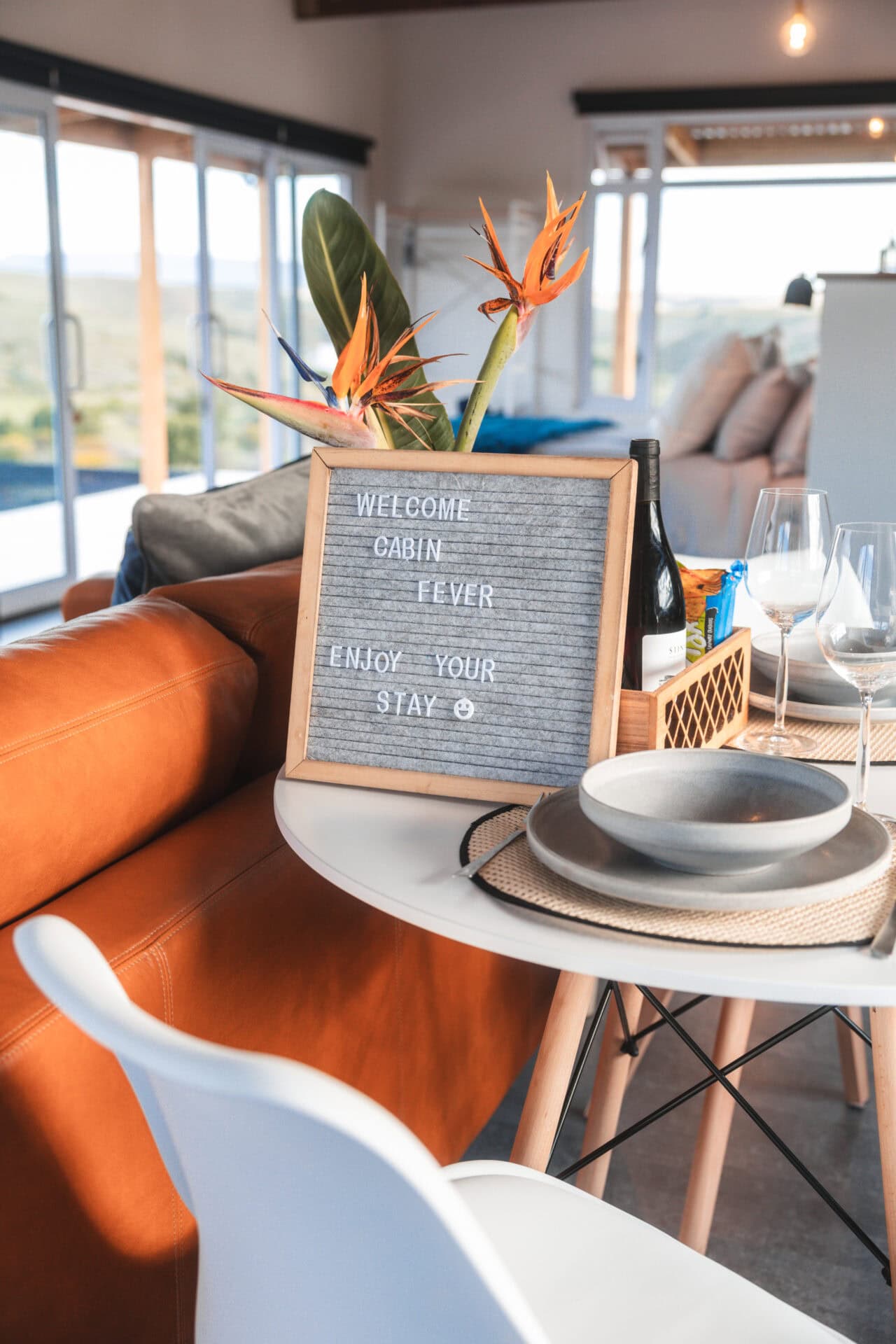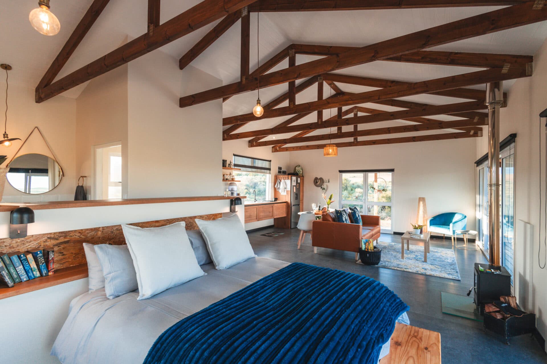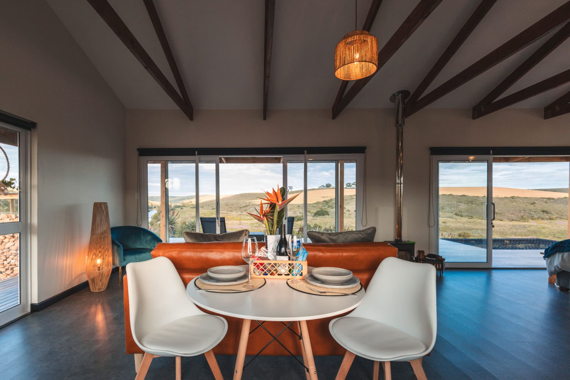 The open plan living space features a large leather couch perfectly positioned to take in the views, complete with binoculars and a bird book for identifying all the birds you spot! The space also includes a cozy fireplace and a selection of board games. Behind the couch, you’ll find a small dining table for two.