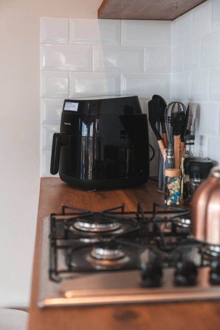 There’s a fully equipped kitchen with a gas hob, fridge-freezer, whistling kettle, air fryer, water filter and toaster. Coffee, tea, sugar, milk, olive oil, and salt & pepper are provided.