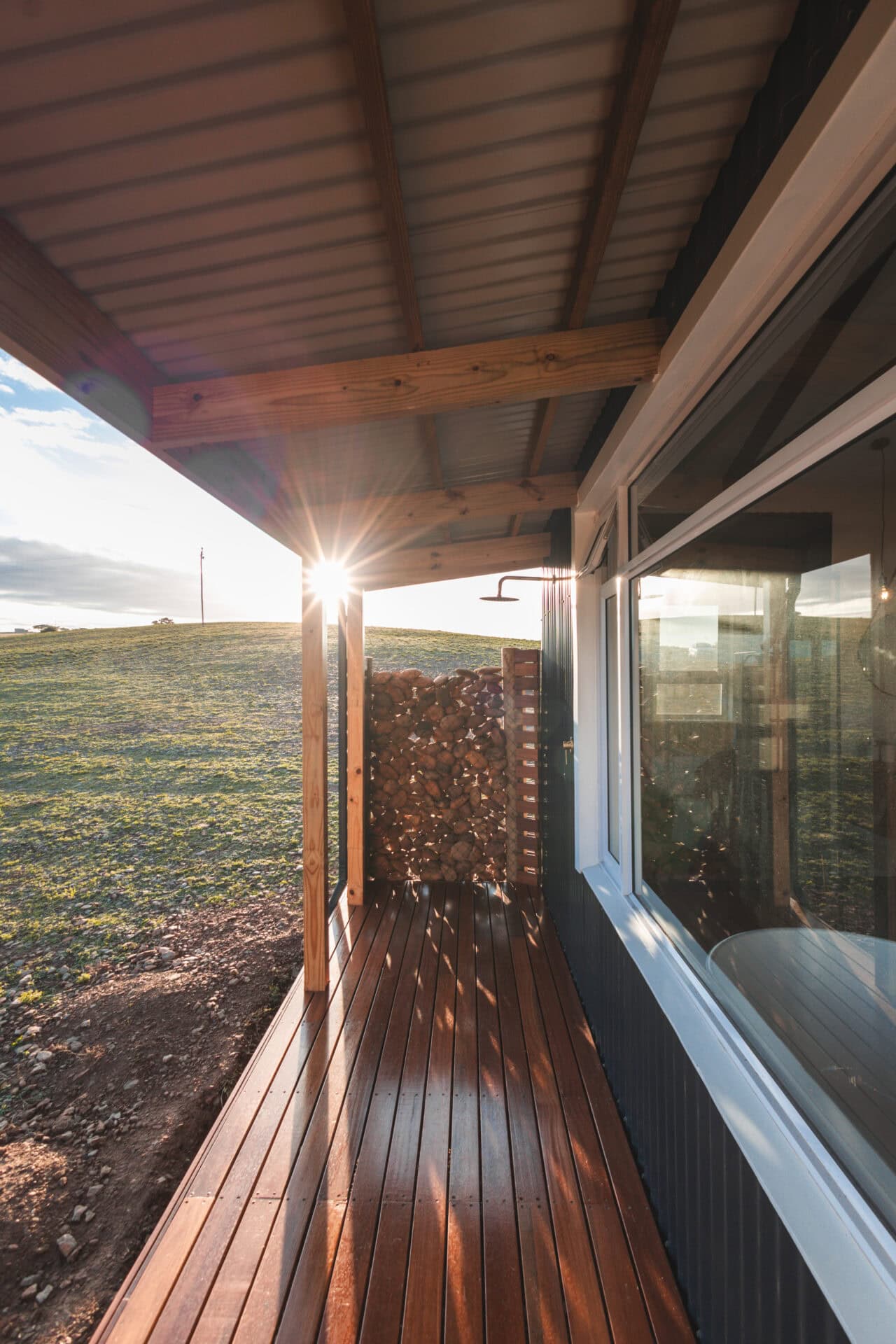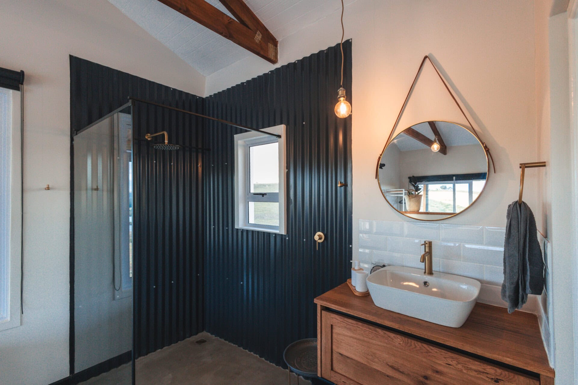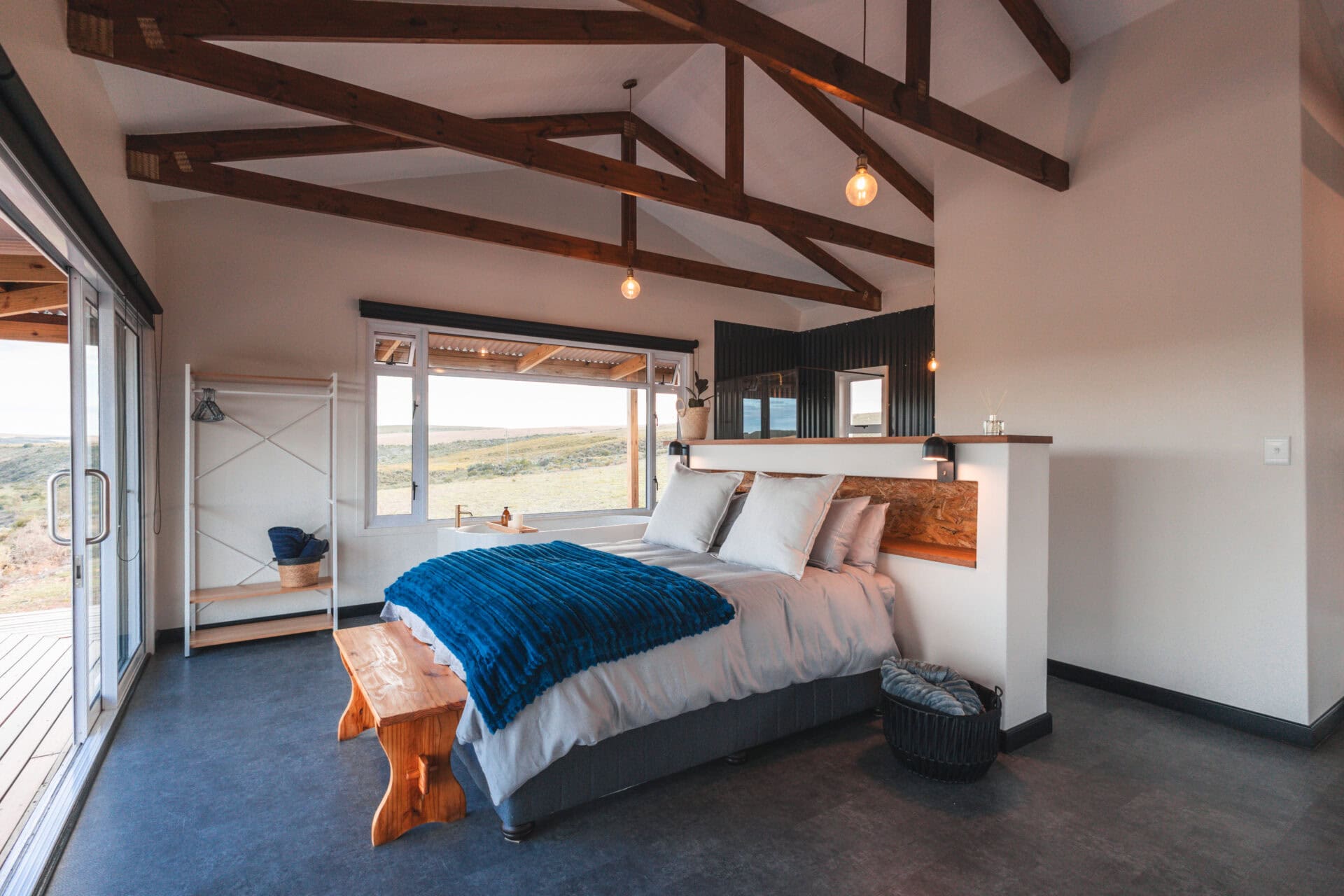 The bedroom opens onto the deck and has a queen-sized bed with extra blankets for winter, a clothing rail and books to read during your stay. There is a freestanding bath by the window, allowing you to soak in the river views, with sheep often grazing just outside!