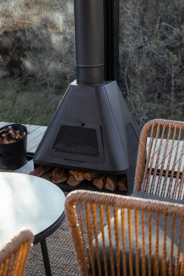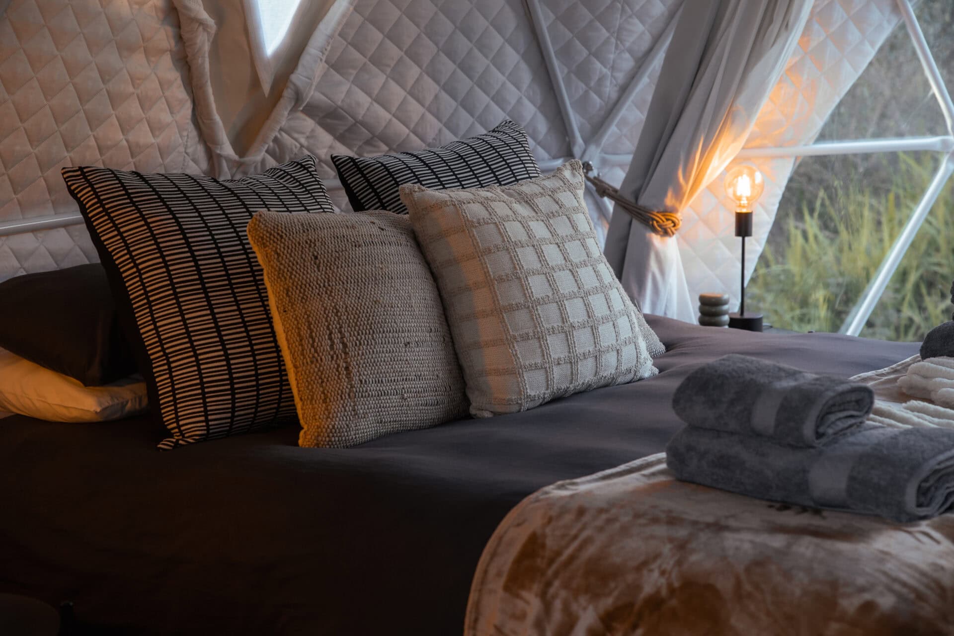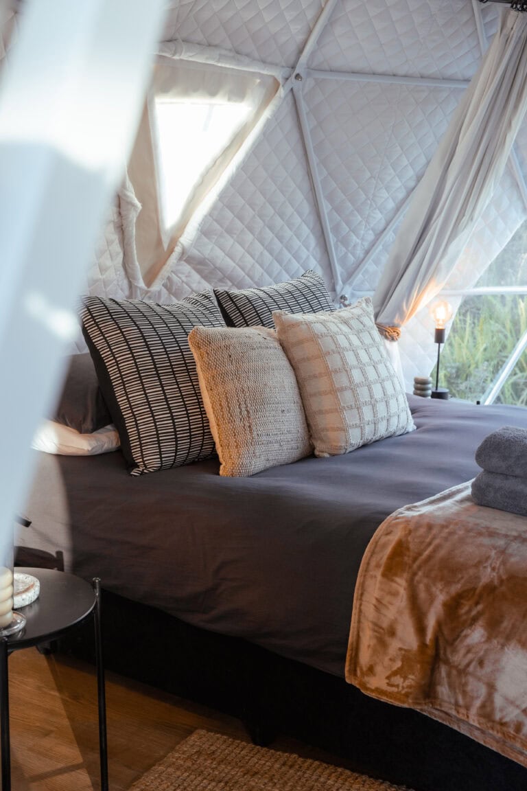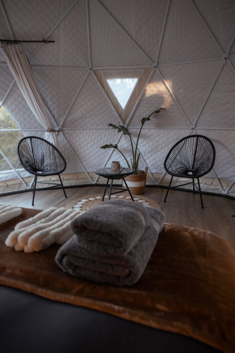 The geodome is beautifully furnished with a queen size bed and luxurious linen as well as hot water bottles, a gas heater and extra blankets for winter. There is also a seating area to enjoy a morning cup of coffee.