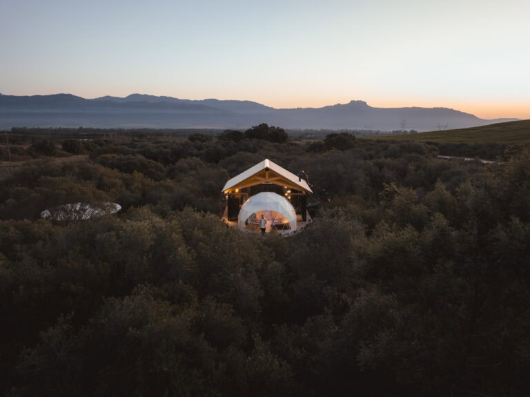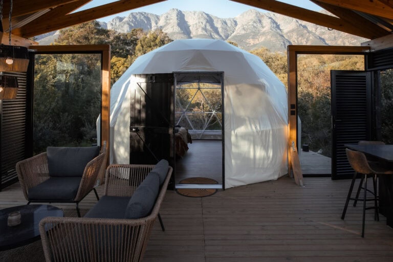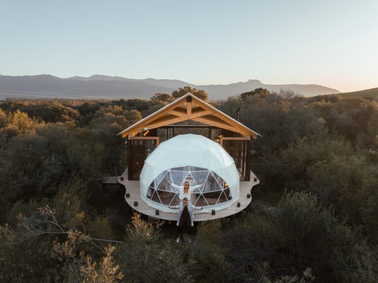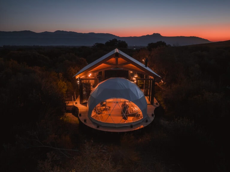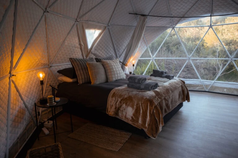 Nestled alongside a peaceful stream on La Bruyere Farm in Tulbagh, Streamside Geodome takes glamping to a whole new level, complete with everything you need – from stylish interiors to a wood-fired hot tub and a dome offering a one-of-a-kind sleeping experience. This stay is the perfect escape for nature lovers who want all the outdoor vibes without sacrificing comfort.