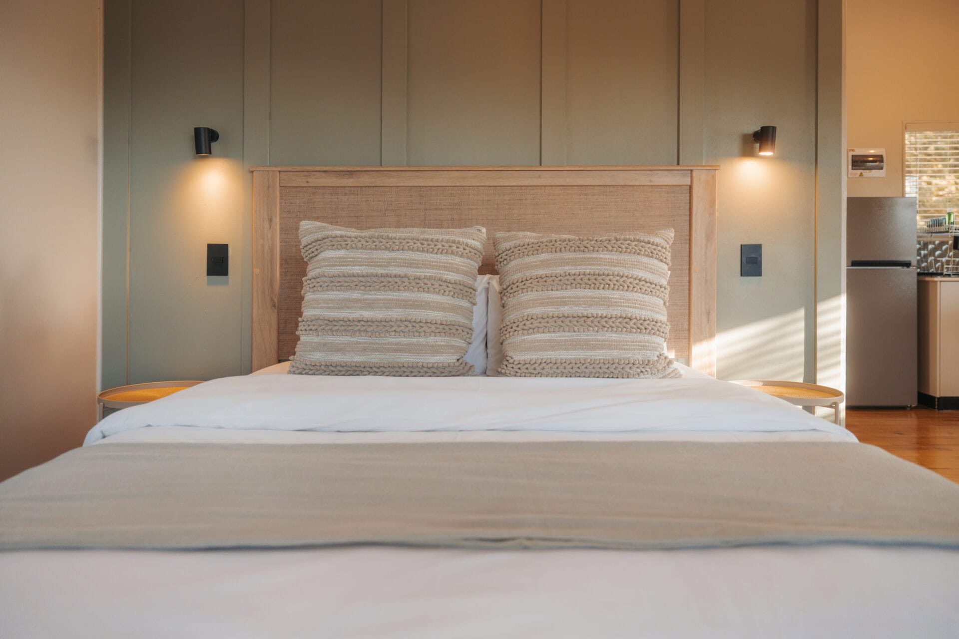 The bedroom features a queen sized bed with luxurious linen and a stunning wooden headboard. There are extra blankets for winter, electric blankets and a clothing rail/shelves for storage.