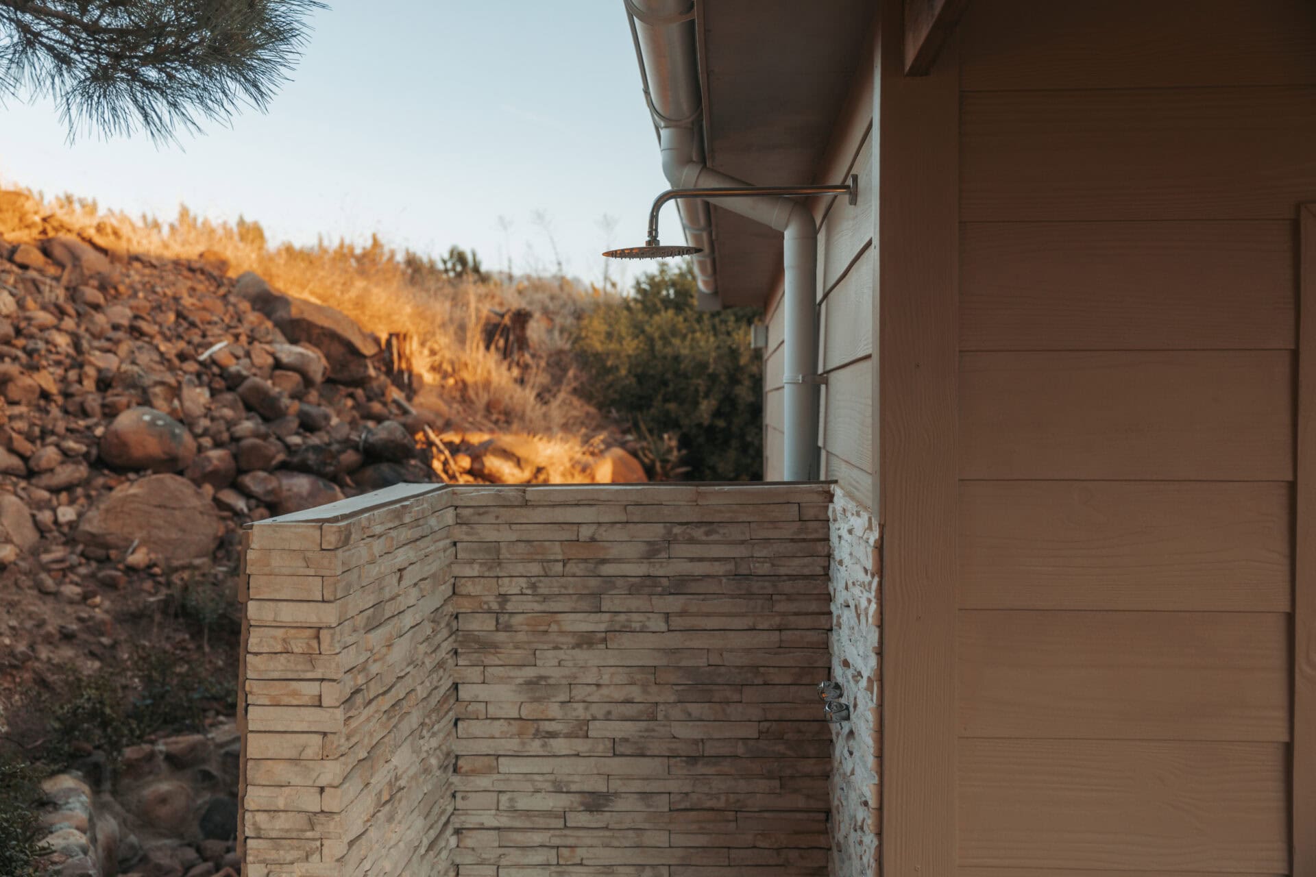 The bathroom features a large shower. There is also an outdoor shower and bath nestled above the deck which is surrounded by pine trees and birds chirping!