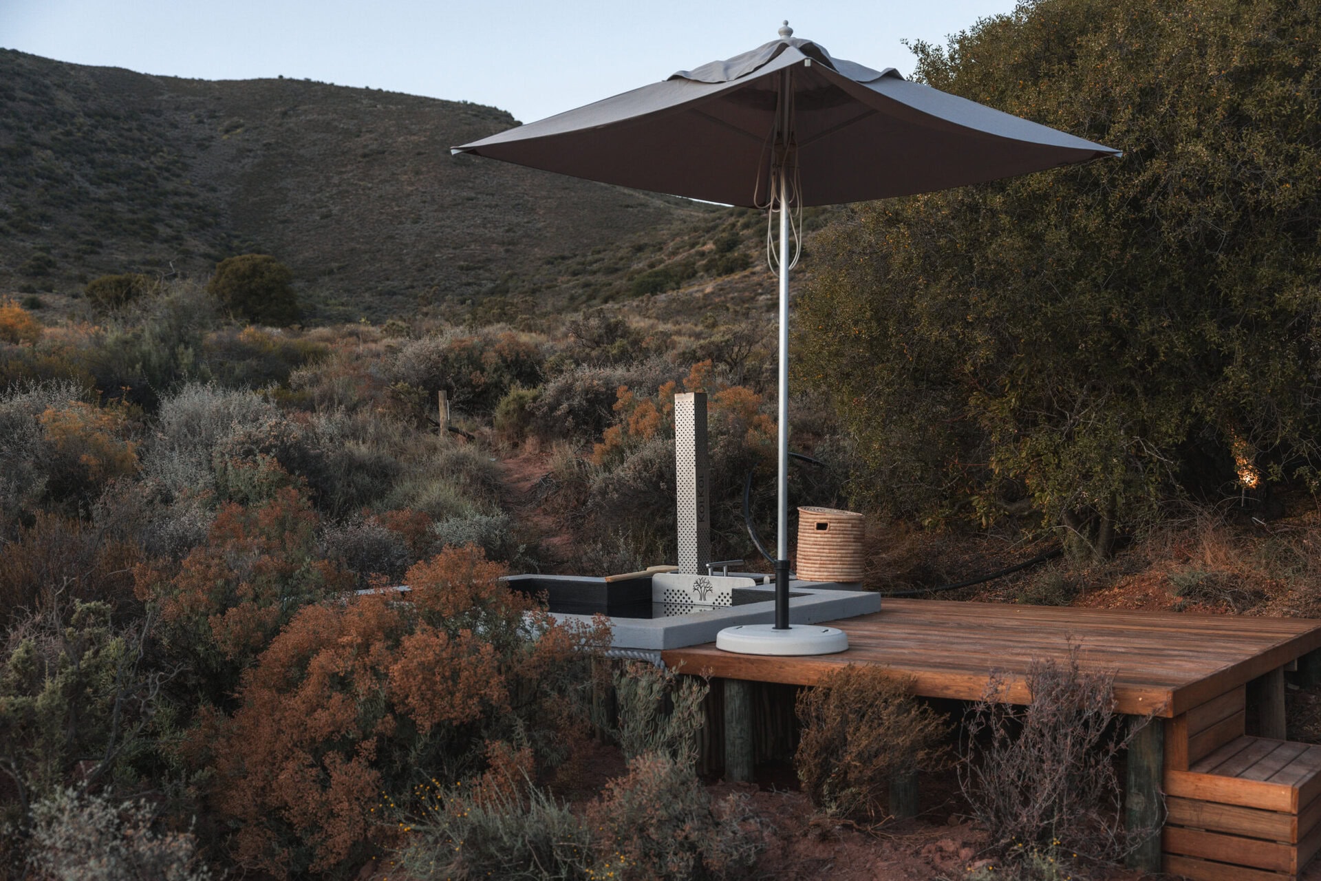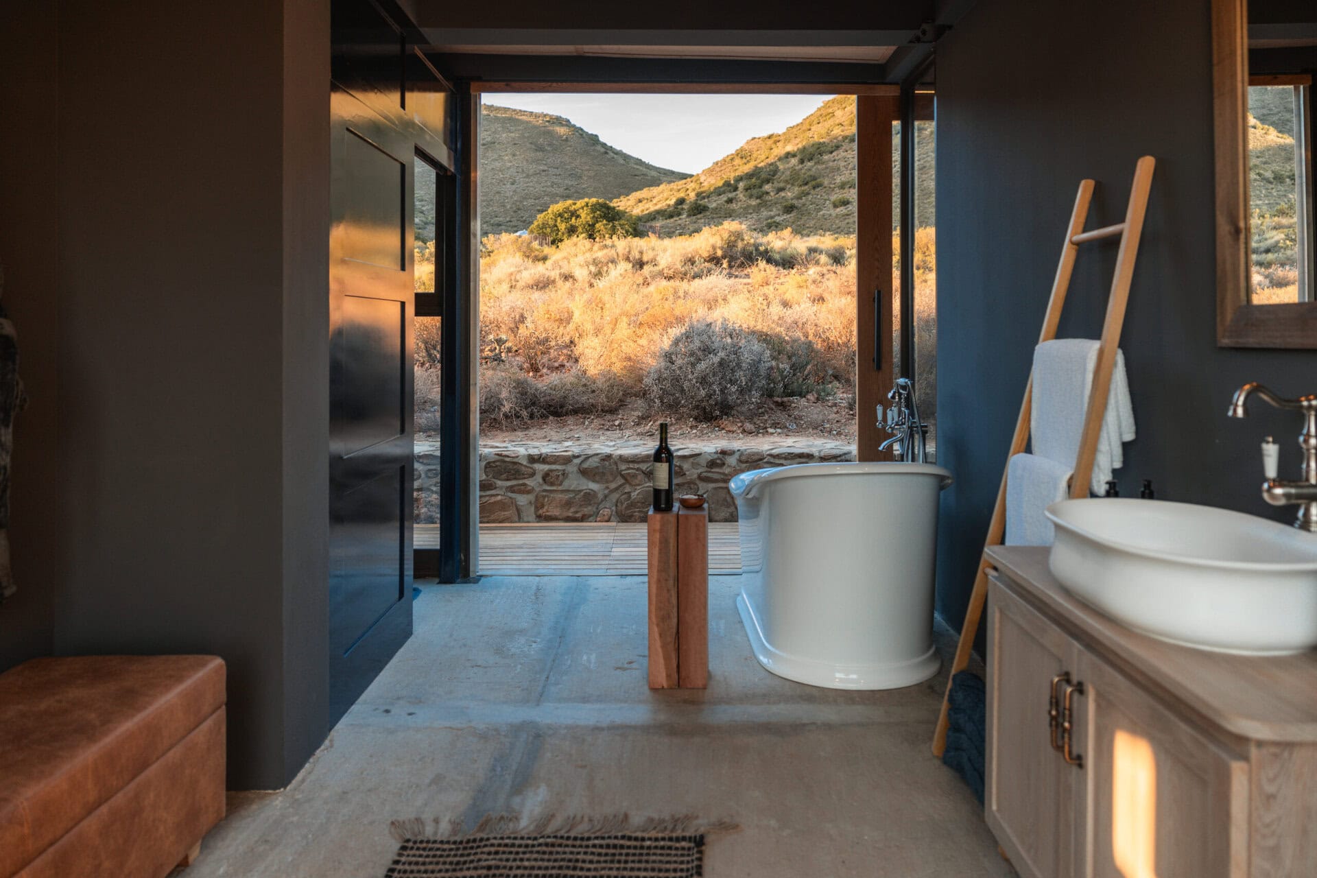 The open-plan bathroom features a stunning bathtub with doors that open up fully so you can enjoy an “outdoor” bath. There is also an outdoor shower if you prefer being even closer to nature. Fijn amenities are provided. The toilet is separate for privacy and features a country barn toilet with a view.