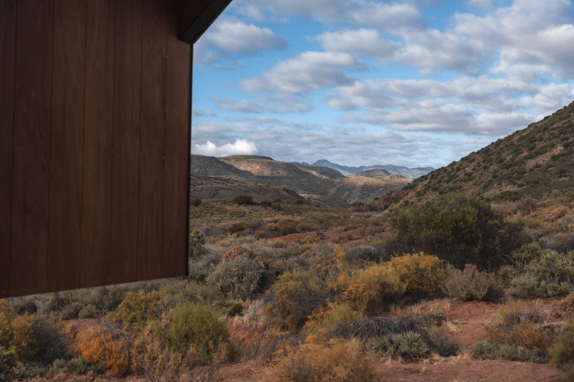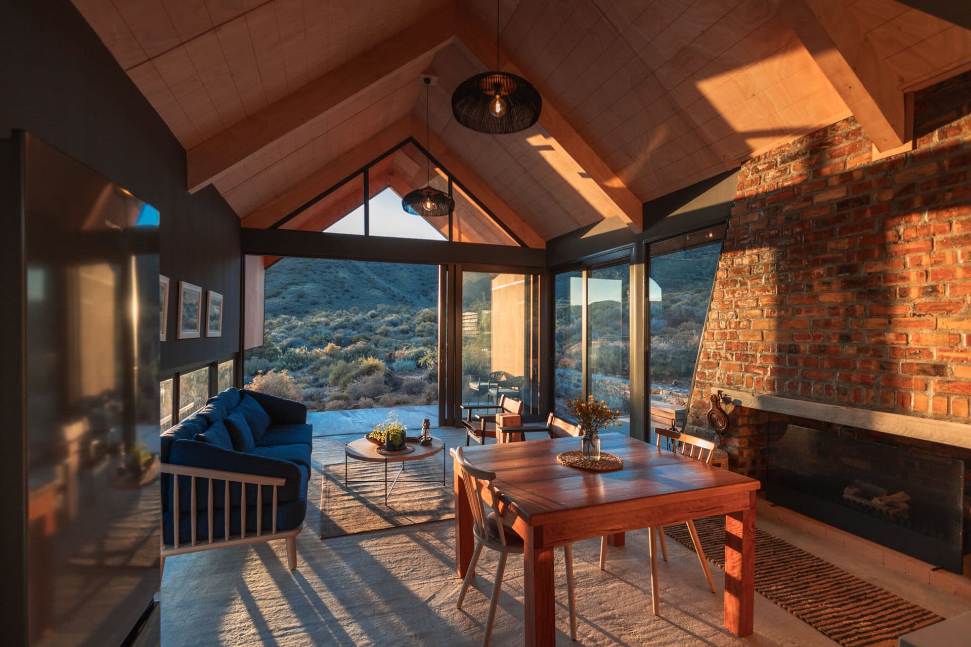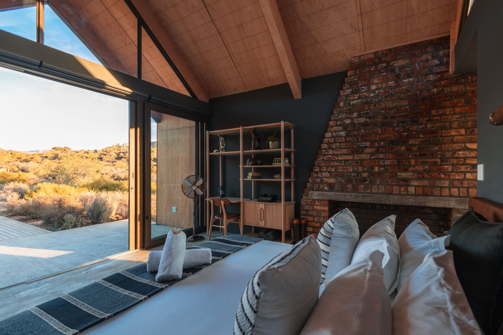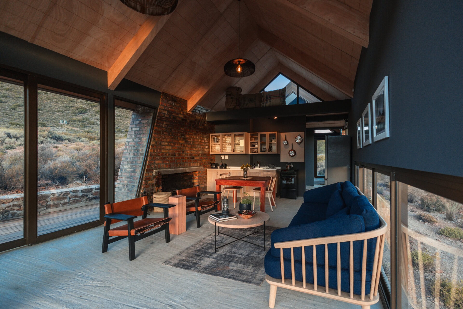 The living and dining space has everything you need to unwind – leather armchairs by a large fireplace, a comfy petrol-blue couch, and a cosy two-seater dining area. The low windows frame the landscape, creating the feeling that you’re moving through the Little Karoo on a luxury train!