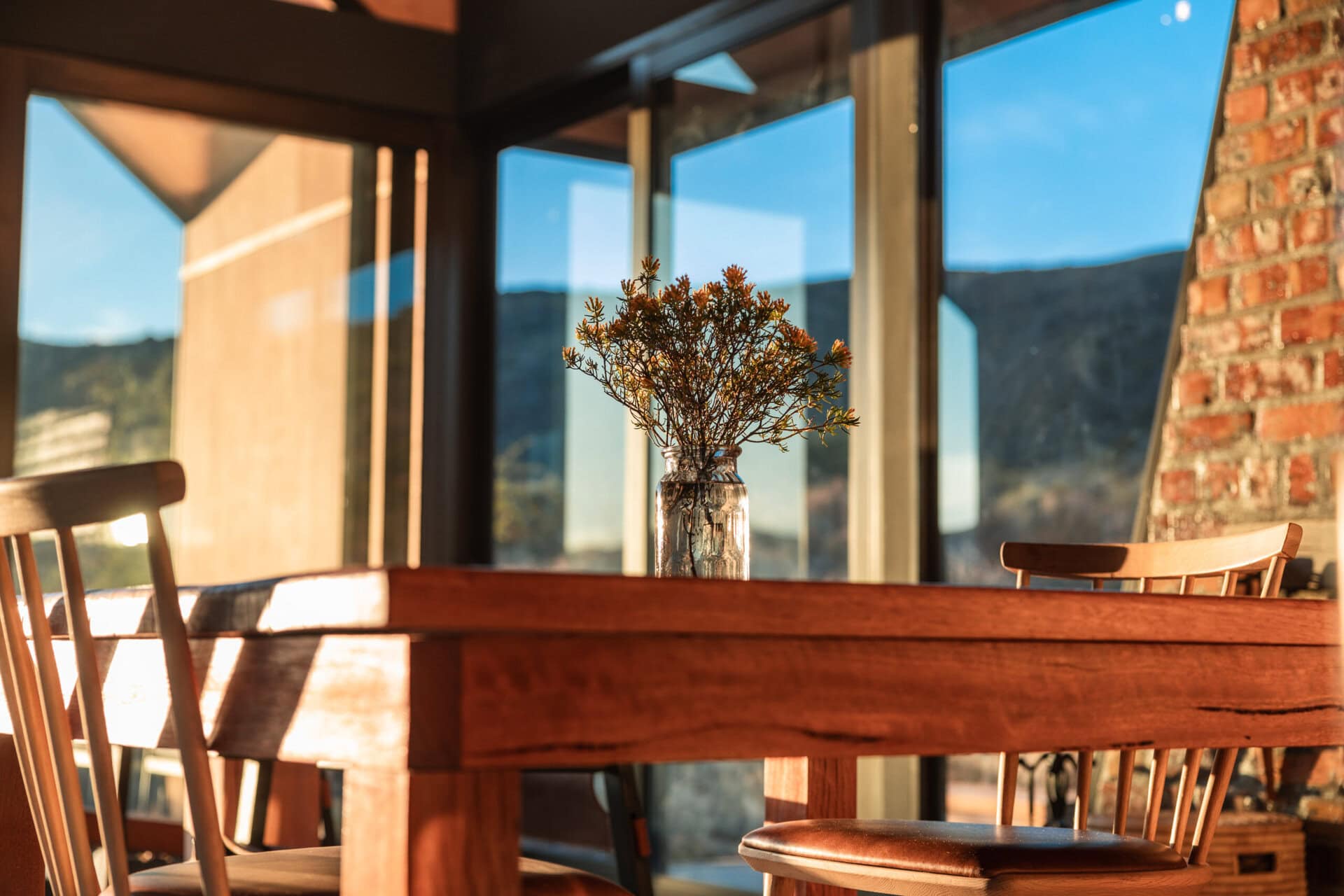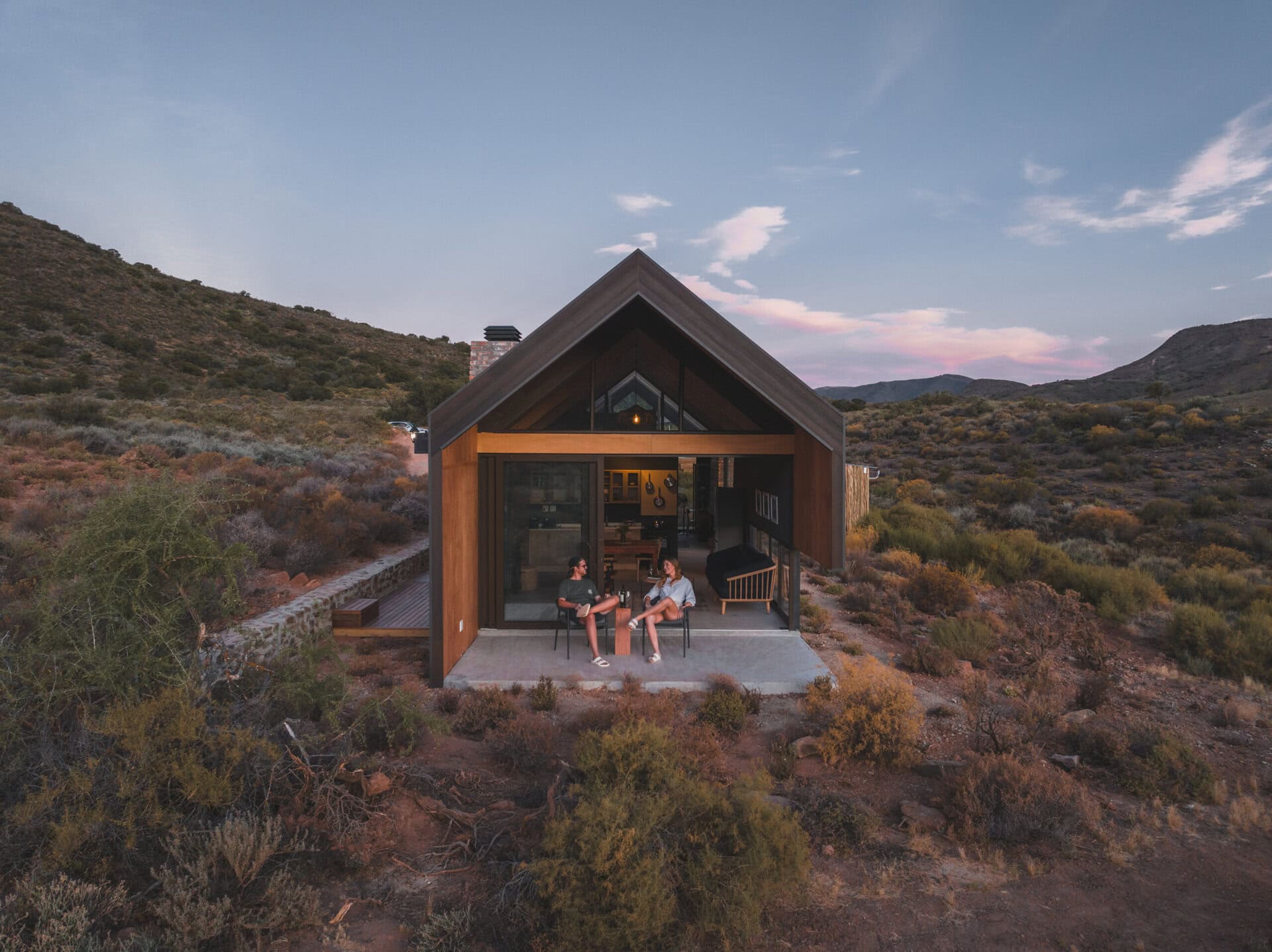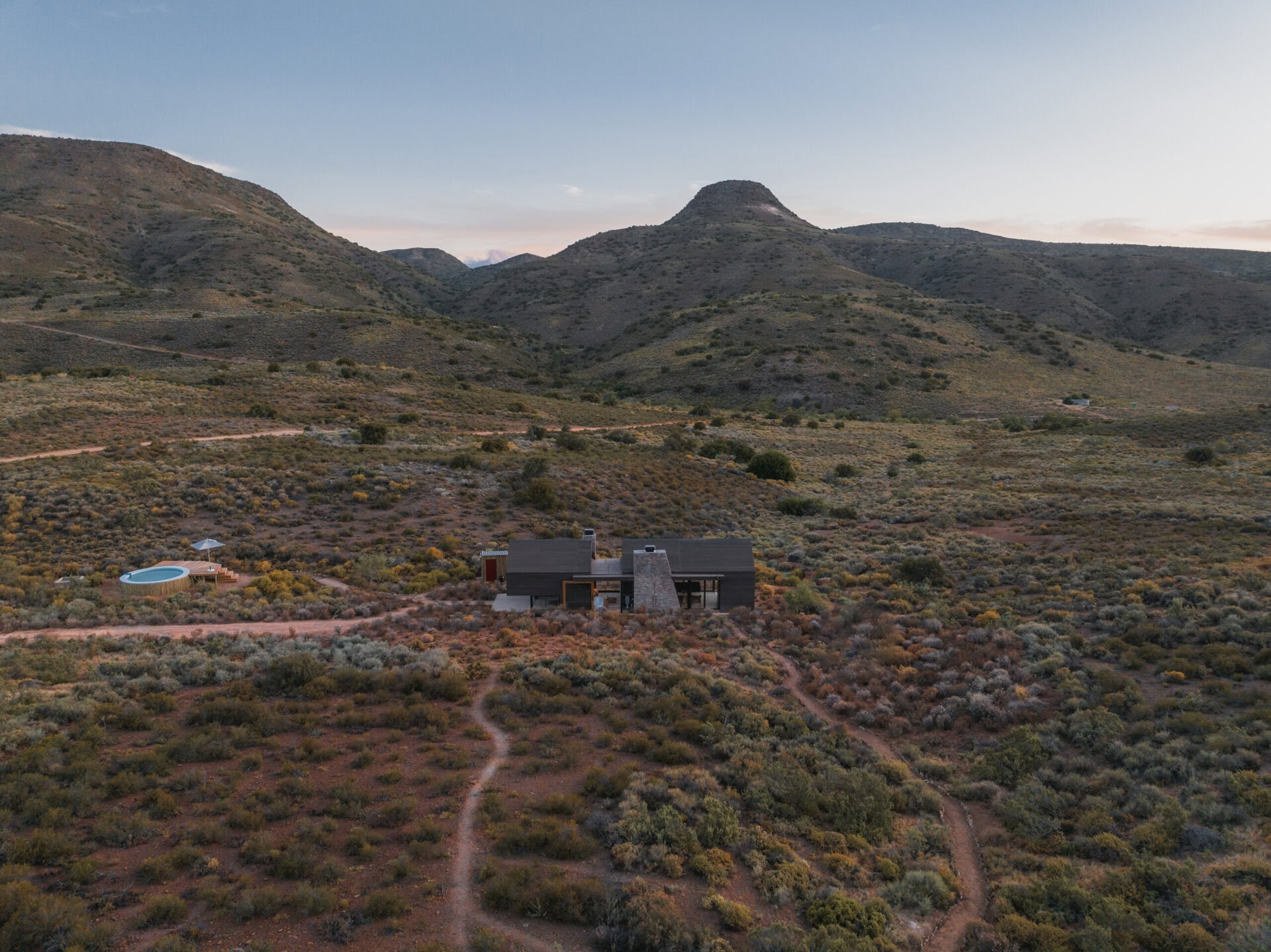 The living and dining space has everything you need to unwind – leather armchairs by a large fireplace, a comfy petrol-blue couch, and a cosy two-seater dining area. The low windows frame the landscape, creating the feeling that you’re moving through the Little Karoo on a luxury train!