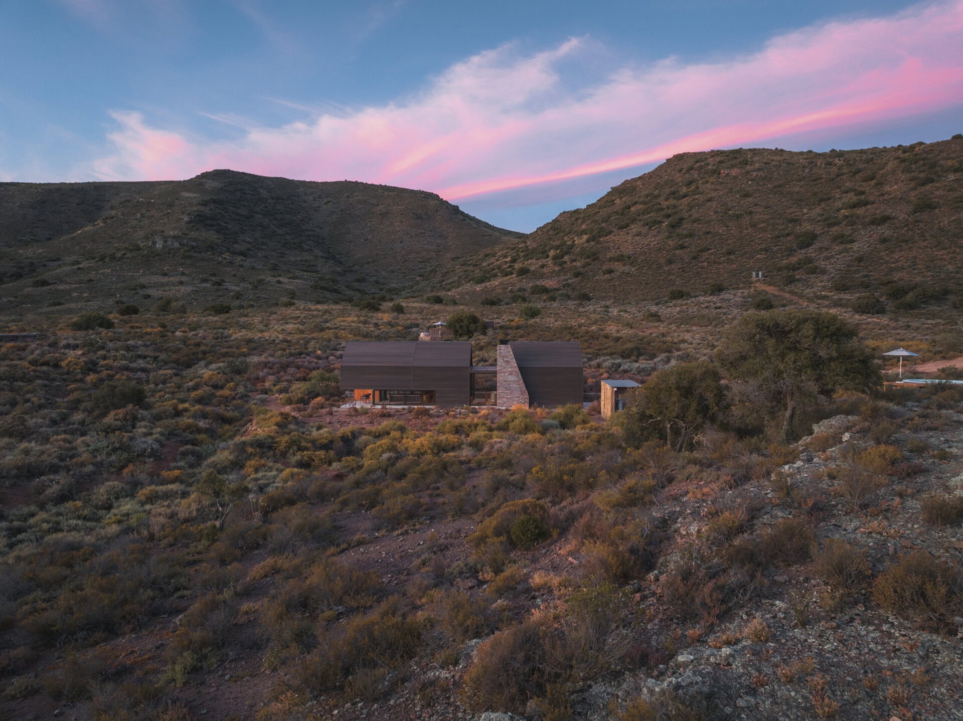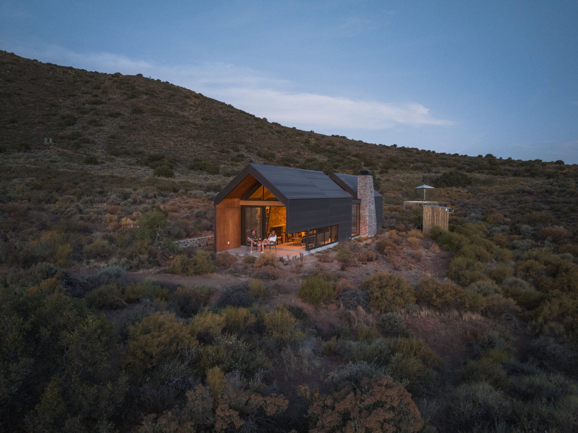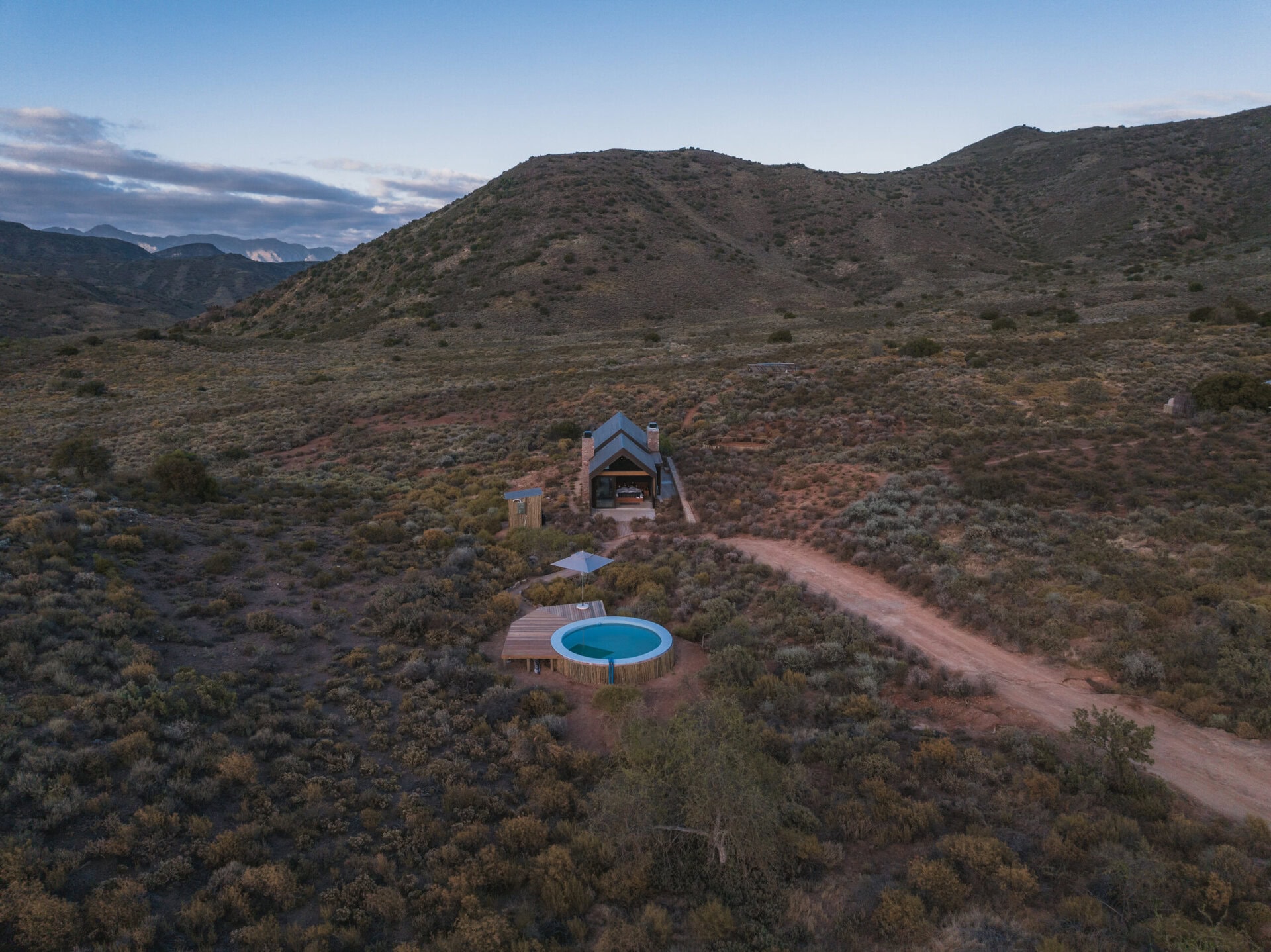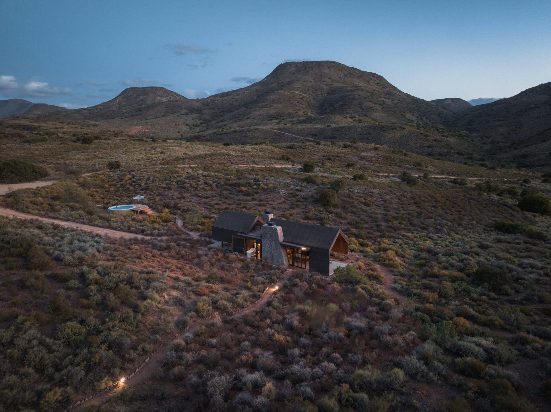 The living and dining space has everything you need to unwind – leather armchairs by a large fireplace, a comfy petrol-blue couch, and a cosy two-seater dining area. The low windows frame the landscape, creating the feeling that you’re moving through the Little Karoo on a luxury train!