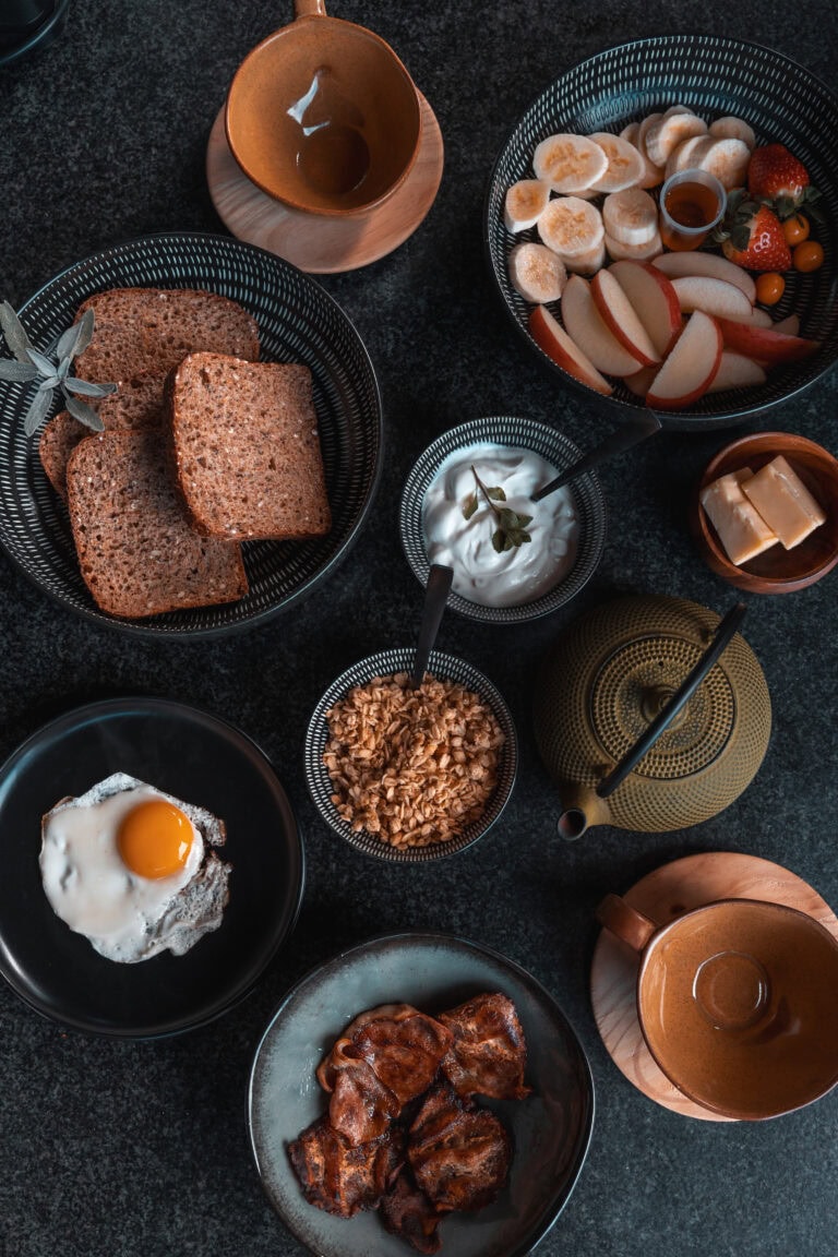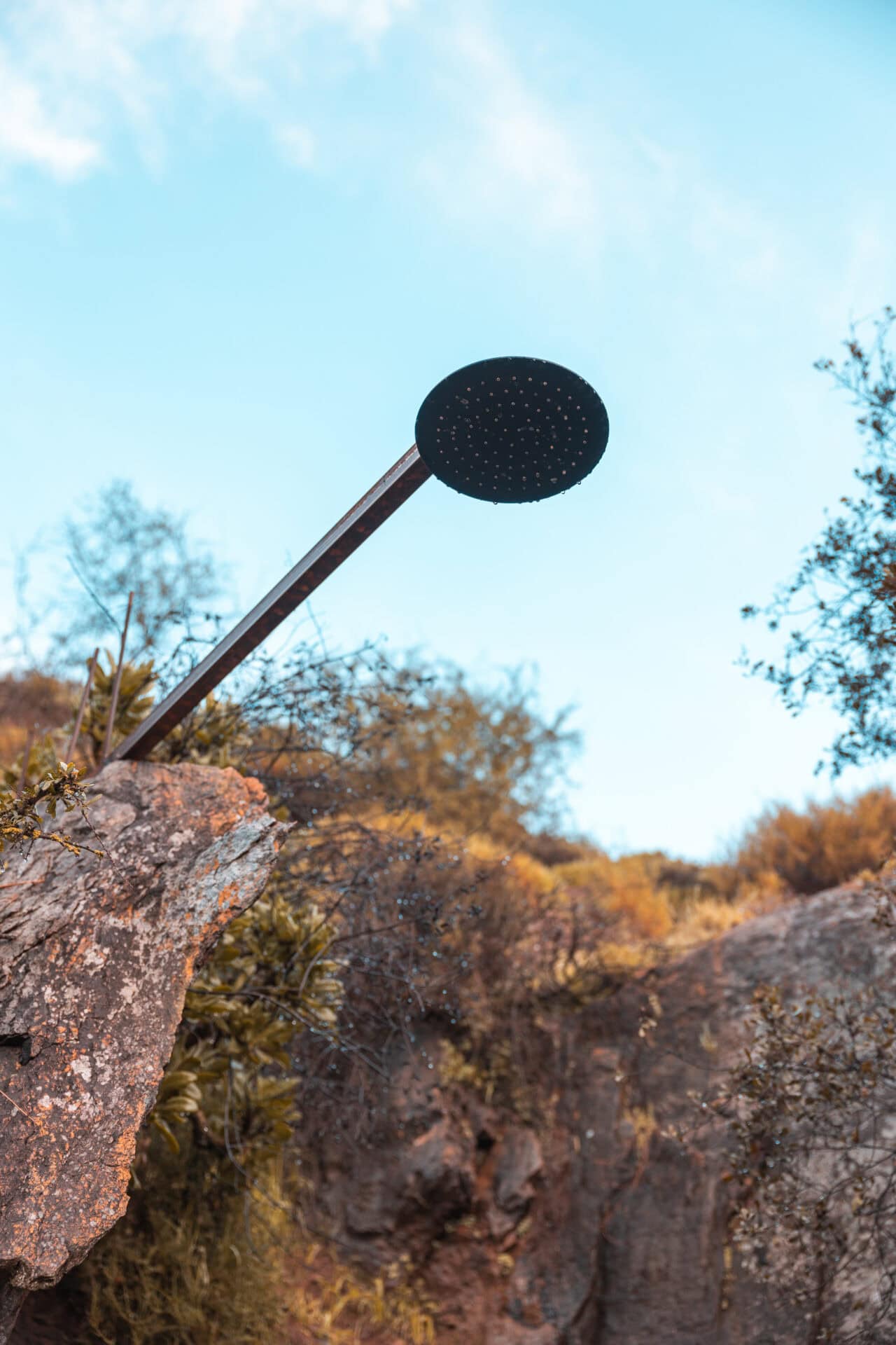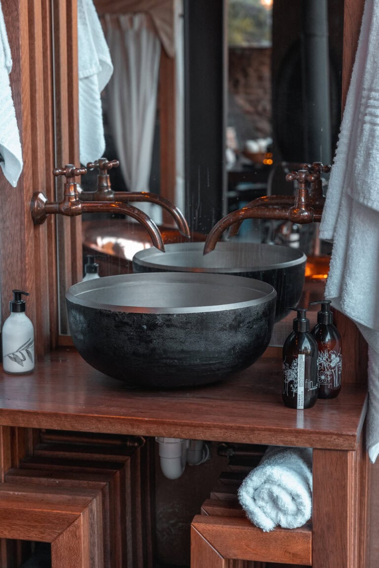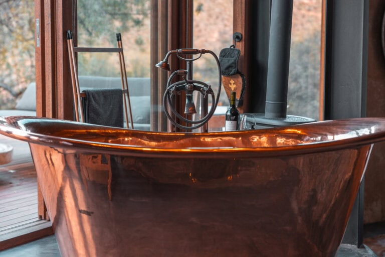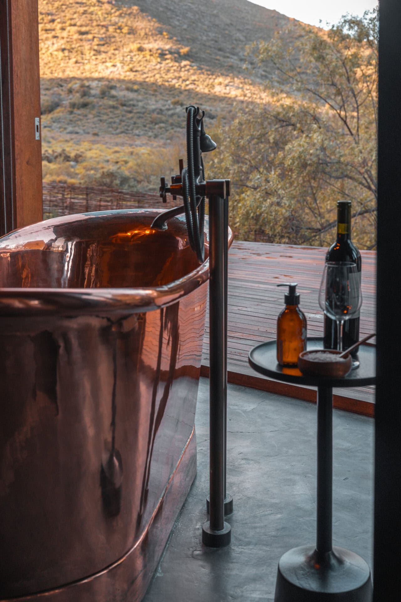 The open plan bathroom features a stunning copper bathtub as the centerpiece. There is an outdoor shower off to the side of the deck if you prefer being more in nature. Fijn amenities are also provided. The toilet is separate for privacy and features a Victorian toilet with a view.
