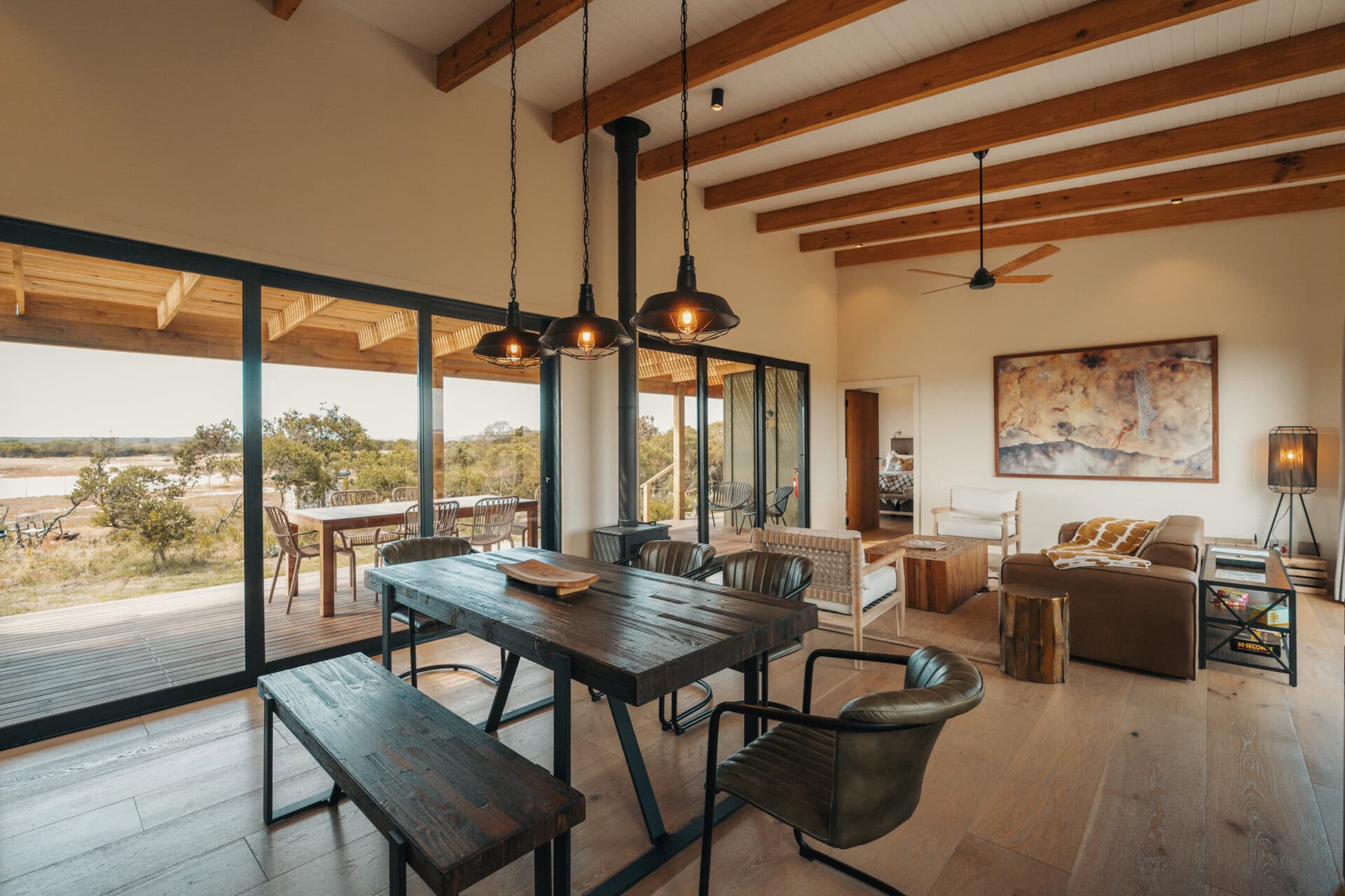 The open plan living space separates the two bedrooms and is beautifully furnished with a large leather couch, cosy armchairs, and a six-seater dining table. An indoor fireplace warms the space in winter, while a ceiling fan keeps things cool in summer. There’s also a selection of books and board games as well as some fun activities for kids.
