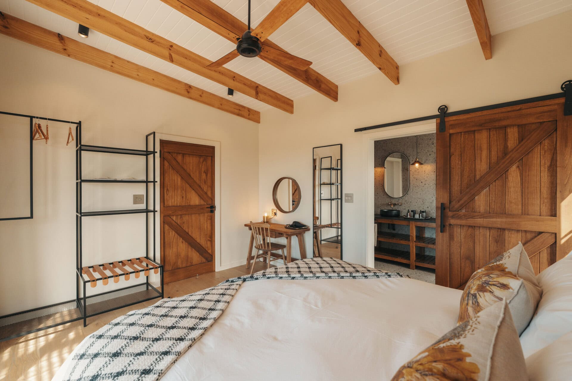 Each bathroom is a showstopper, complete with double vanities, brass accents and a spacious wet area with a walk-in shower and freestanding bath set beneath the window. Fijn bath amenities are provided, and the toilet is separate for privacy.