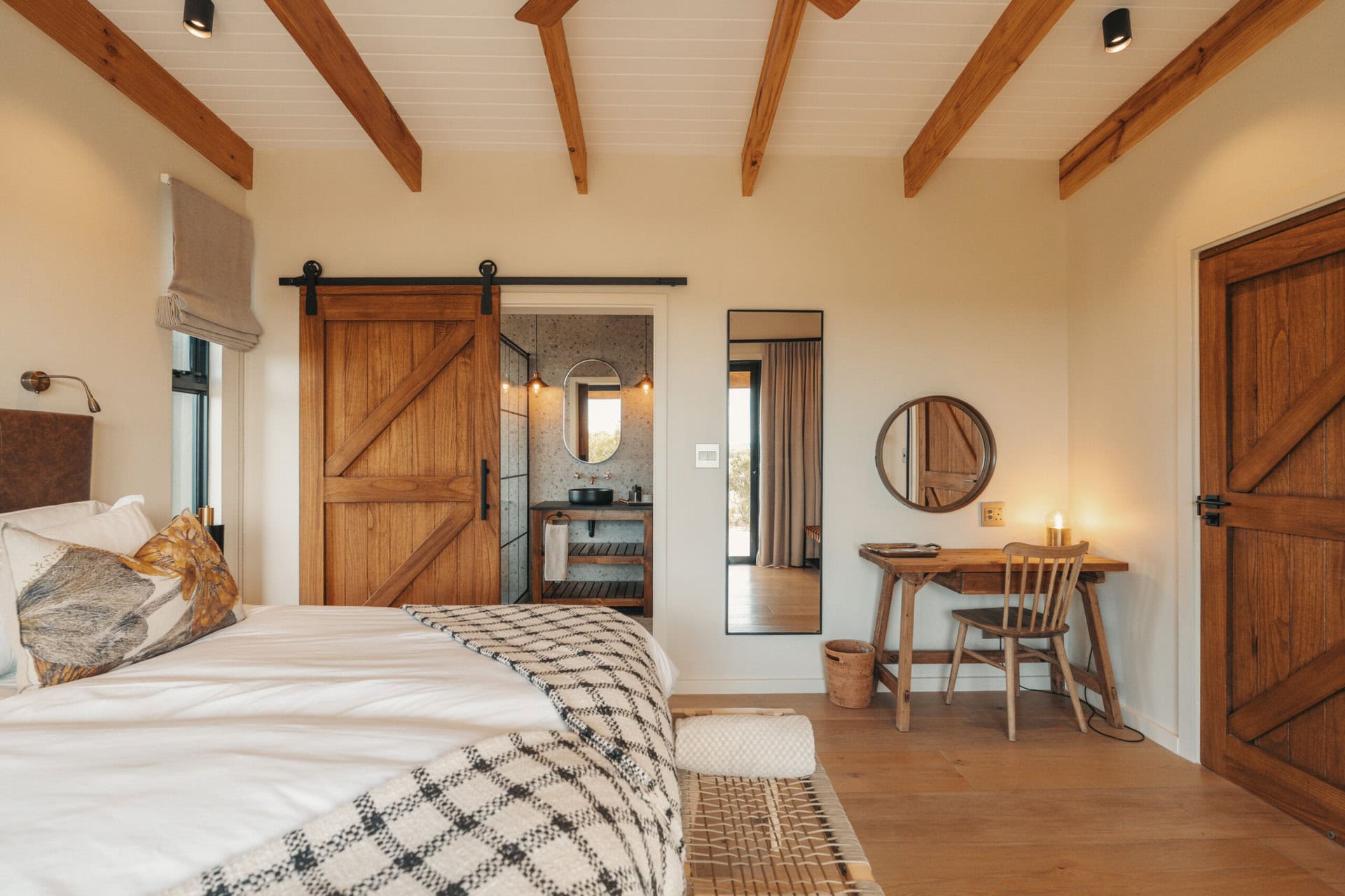 The layout of this cabin is ideal for a four-sleeper. It’s super spacious, with mirror-imaged bedrooms and bathrooms on either side of the cabin, and each bathroom has its own bath! We also loved all the thoughtful local touches throughout the space, especially the fynbos tea tasting. But the real highlight for us was enjoying sundowners around the fire pit while buck and giraffe wandered across the salt pans – it really felt like we were back in the bush!