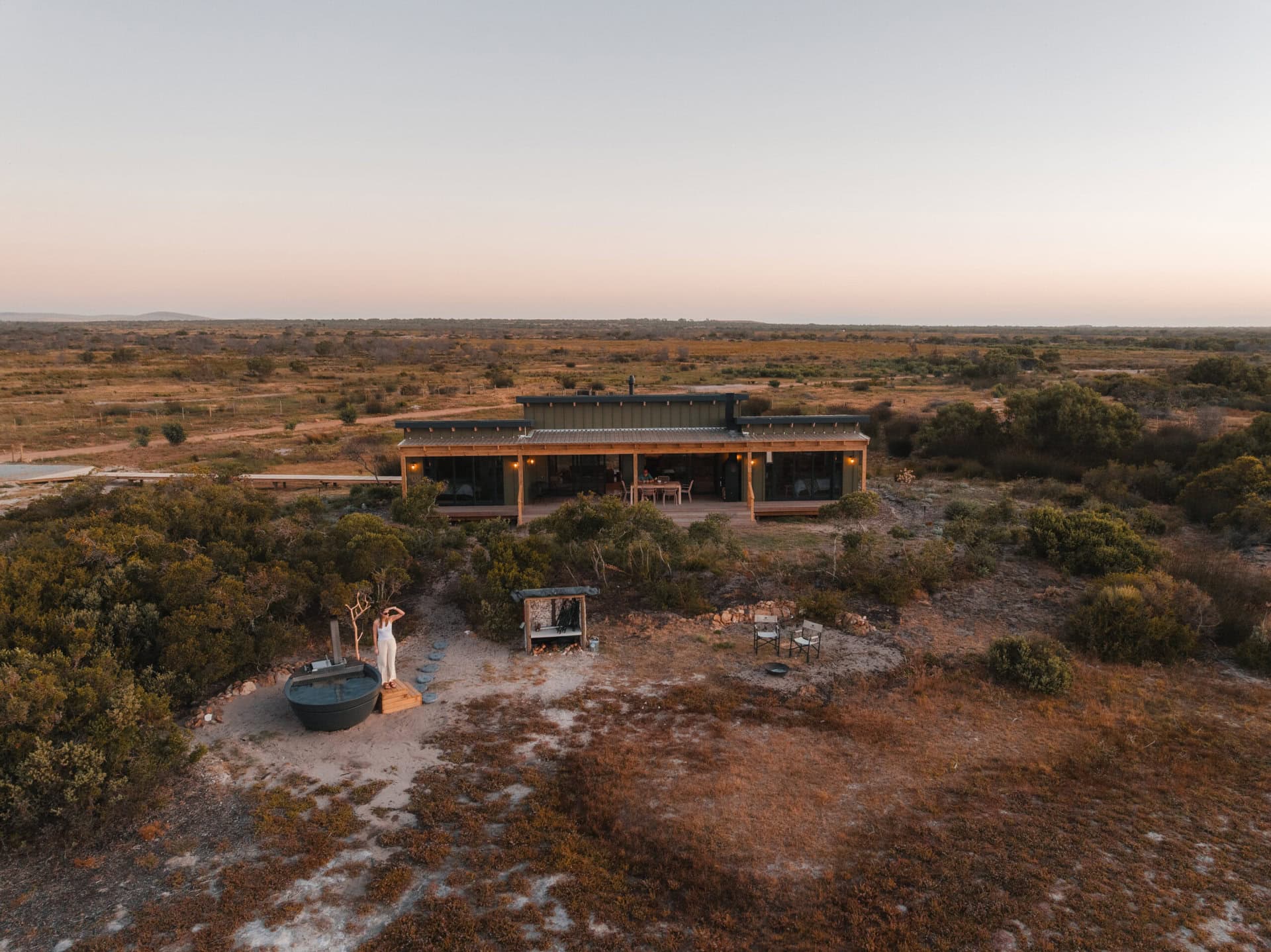 The living space opens onto a large covered patio with a built-in braai and generous dining area, overlooking the salt pans. Steps lead down to a large wood fired hot tub (made for 4) and there is a fire pit so you can feel like you’re on a real safari holiday!