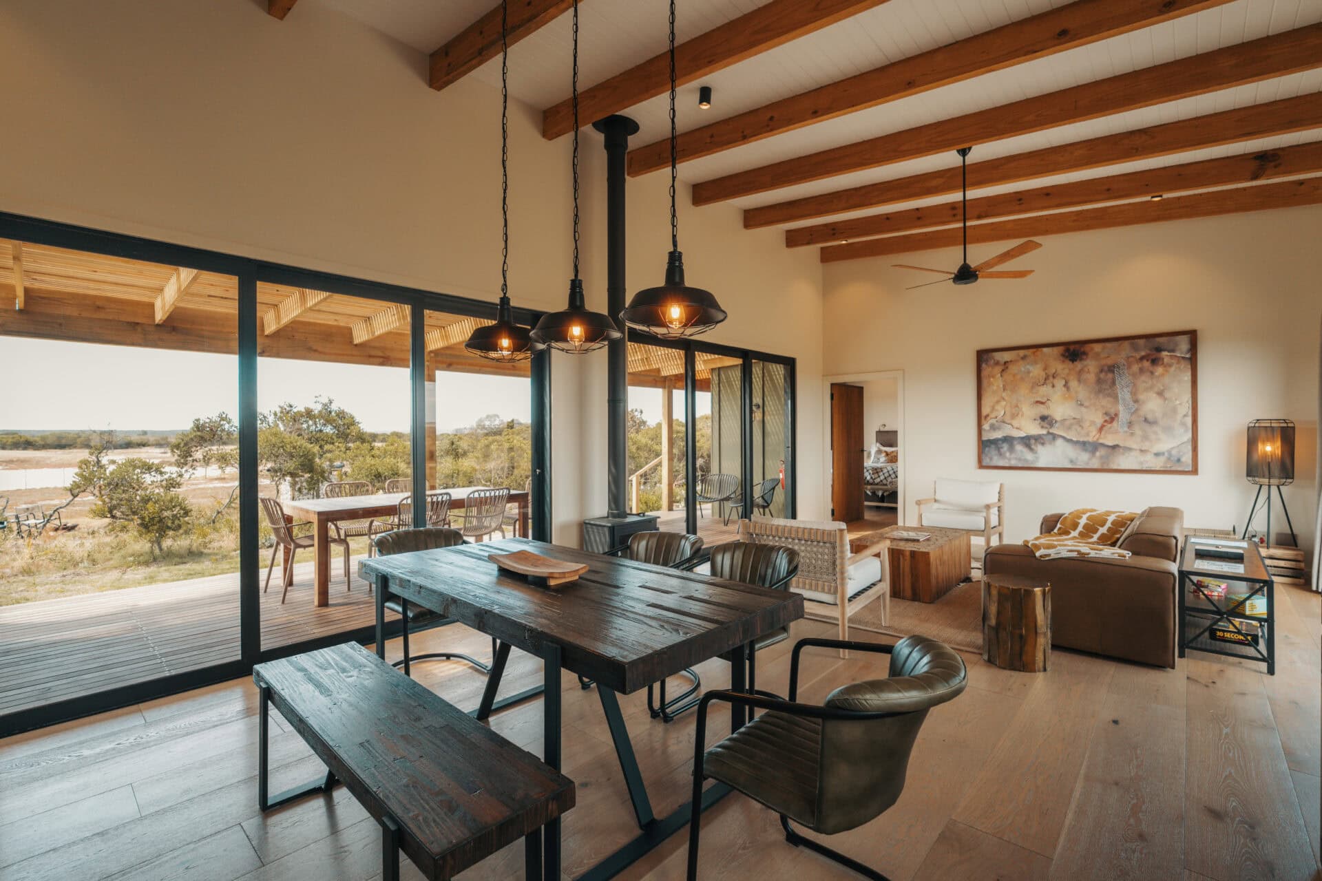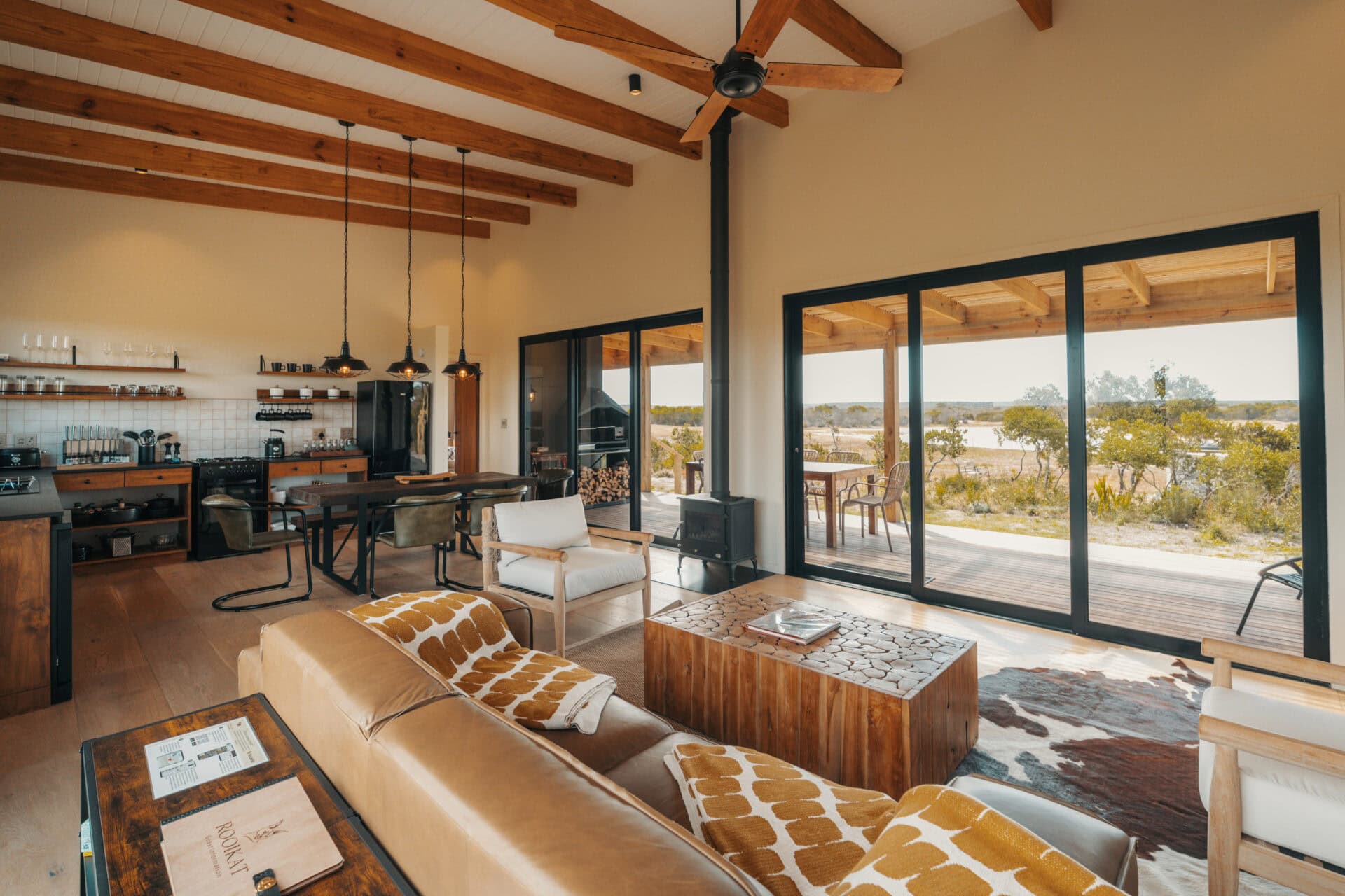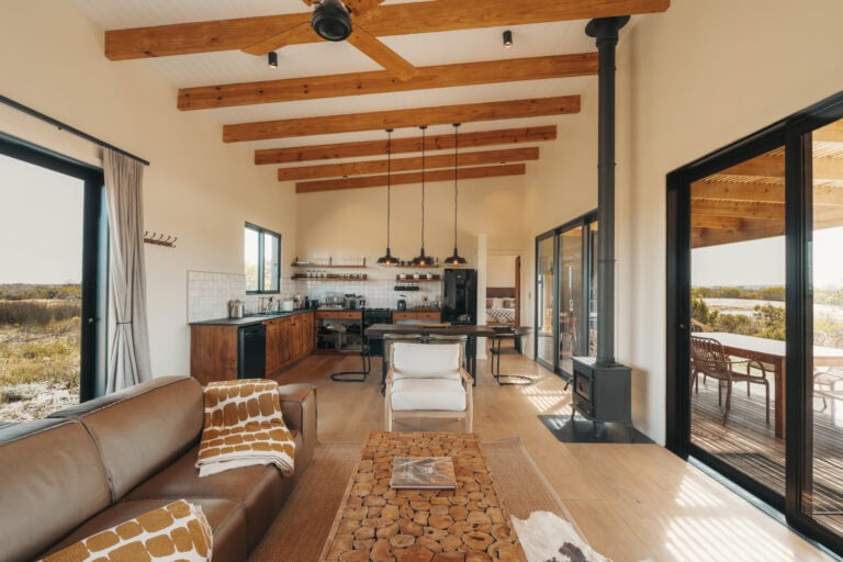 The open plan living space separates the two bedrooms and is beautifully furnished with a large leather couch, cosy armchairs, and a six-seater dining table. An indoor fireplace warms the space in winter, while a ceiling fan keeps things cool in summer. There’s also a selection of books and board games as well as some fun activities for kids.